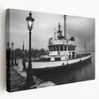 Step into a world of nautical nostalgia with this black and white fine art photography print. This stunning piece captures a vintage tugboat resting in the harbor, surrounded by mist and illuminated by classic street lamps. The play of light and shadow enhances the depth of the image, creating a timeless, cinematic aesthetic.