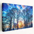 Experience the beauty of a winter sunset with this stunning fine art photography print. This breathtaking composition showcases the golden glow of the setting sun filtering through tall, bare trees, casting dramatic shadows on the snow-covered ground.