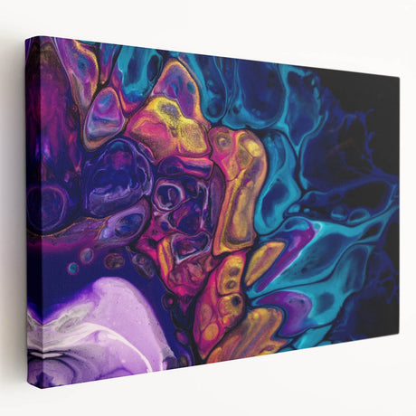 • Abstract figurative wall art on a stretched canvas, displaying vibrant colors and dynamic shapes, perfect for contemporary home decor. Side view shows canvas thickness and quality finish, enhancing any art collection.