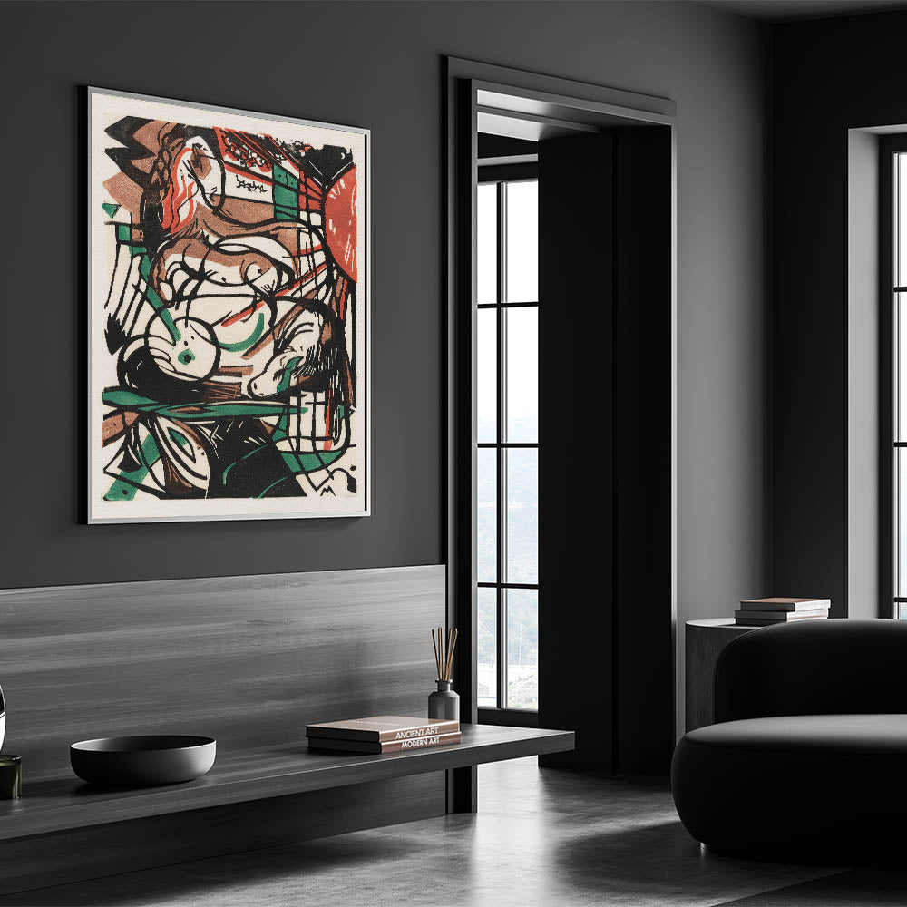 Immerse yourself in the evocative world of Abstract Expressionism with "The Birth of Horses," a masterpiece that reflects the raw emotions and striking visuals characteristic of Expressionist art. This design brings together bold lines, earthy browns, vibrant greens, and passionate reds to form a dramatic composition that captures the vitality of life and nature.