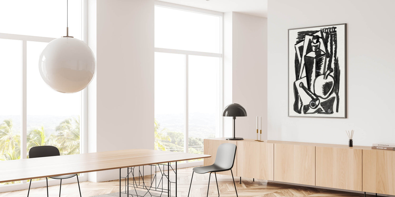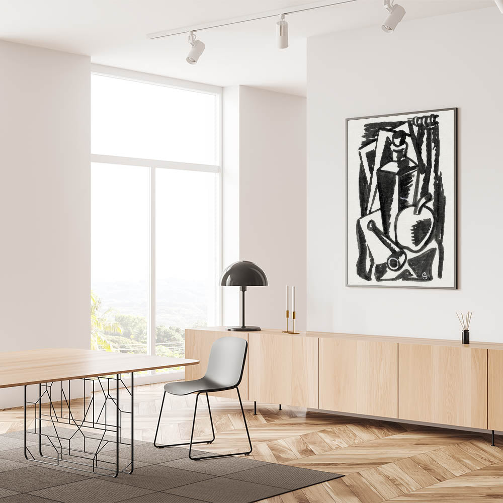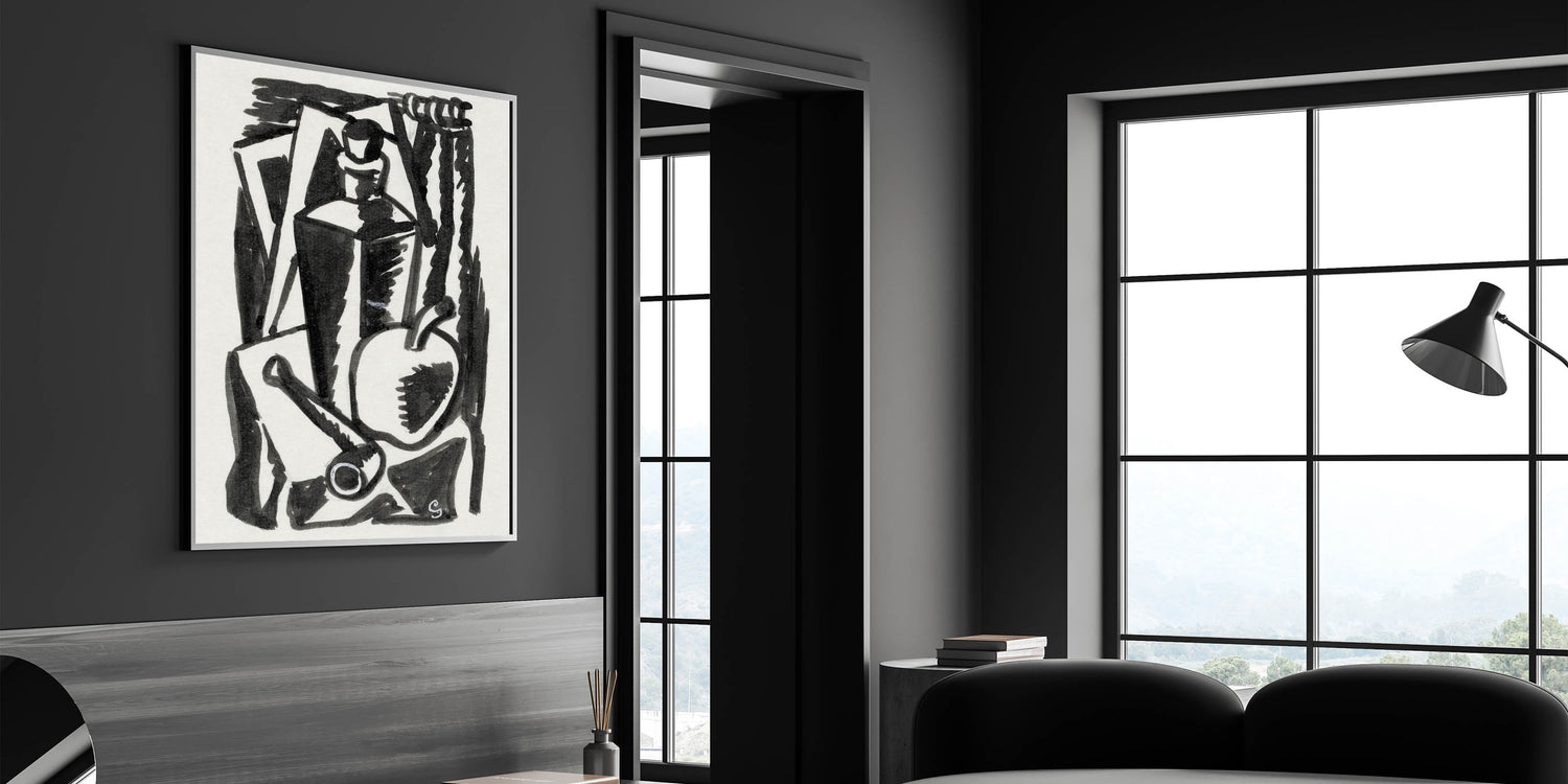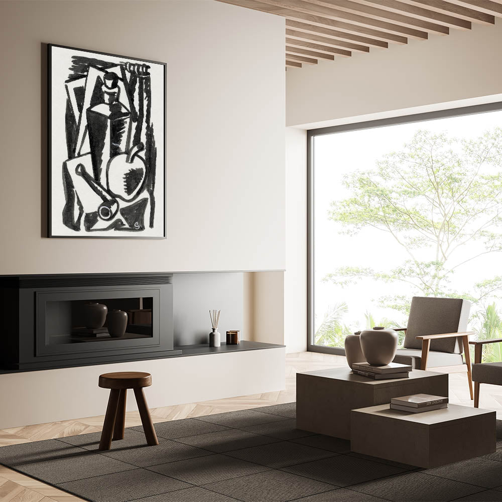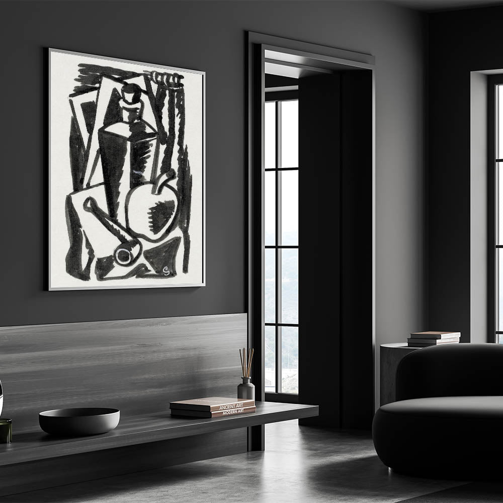 Elevate your home with this striking Abstract Expressionism artwork, Still Life with Apple, Pipe, and Bottle. This black-and-white masterpiece captures the essence of Expressionist Art, blending bold brushstrokes with an evocative composition. The painting's minimalist yet emotional style adds a sophisticated touch to any room, perfect for lovers of Modern Expressionism and unique decor.