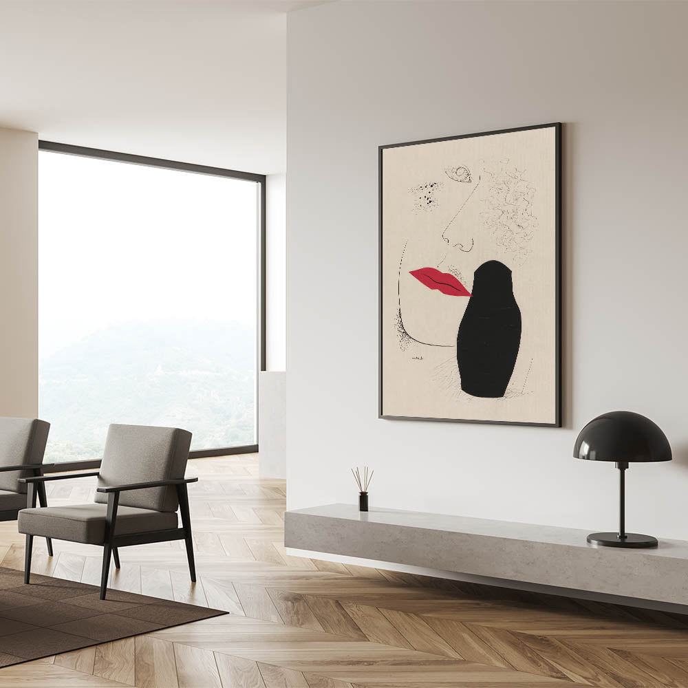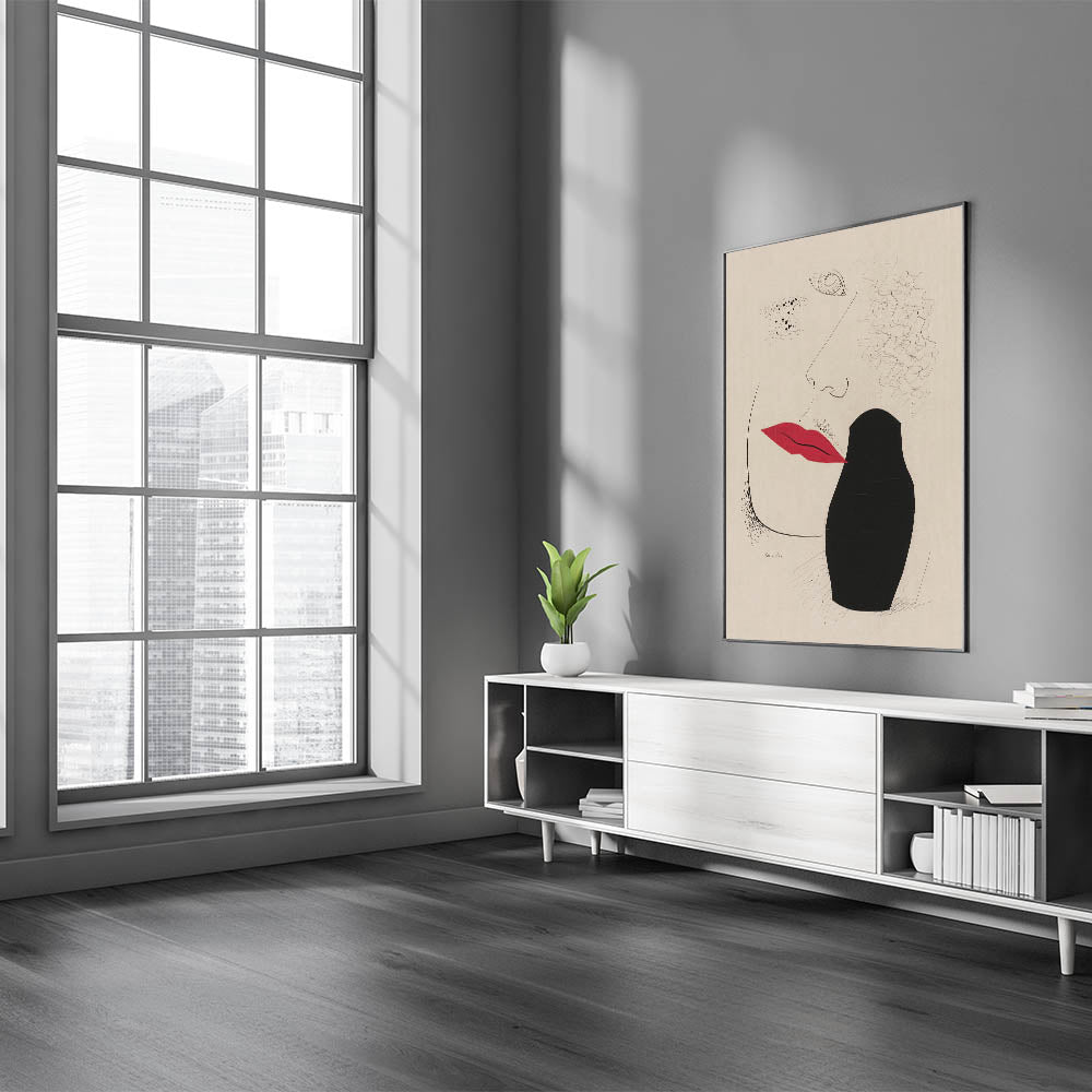Enhance your space with this captivating Modern Wall Art featuring a minimalist illustration of a woman, blending abstract design with refined elegance. This Framed Print showcases delicate line work paired with bold accents, creating a balance of simplicity and sophistication. Its striking use of color and form draws the eye, making it a standout piece for any contemporary setting. Perfect for modern living rooms, bedrooms, or offices, this artwork adds a sense of mystery and artistic charm.