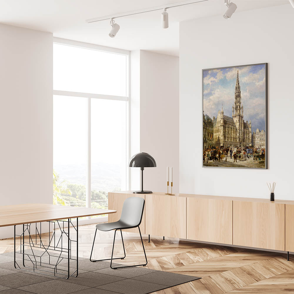 Immerse yourself in the lively charm of Brussels: Grand Place in 1887 by Christiaan Dommershuijzen, a captivating depiction of one of Europe’s most iconic city squares. This Romantic-era painting brings the bustling marketplace to life with meticulous attention to detail, showcasing the stunning architecture of the Grand Place and the vibrant activity of the people below. The artist’s mastery of light and color creates a dynamic, yet harmonious scene that reflects the spirit of the time.