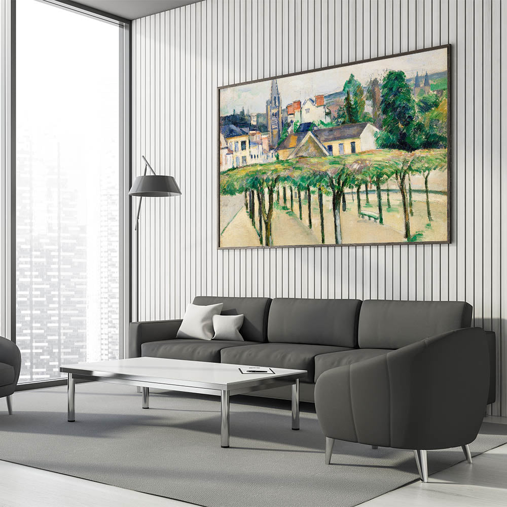 Bring the charm of a quaint French village to your home with Paul Cézanne’s "Village Square." This Impressionist masterpiece captures a serene town square surrounded by lush greenery, elegant architecture, and the towering spire of a church. Cézanne’s masterful brushstrokes and vibrant colors of green, beige, and terracotta add depth and movement to the scene, making it a timeless addition to any decor.