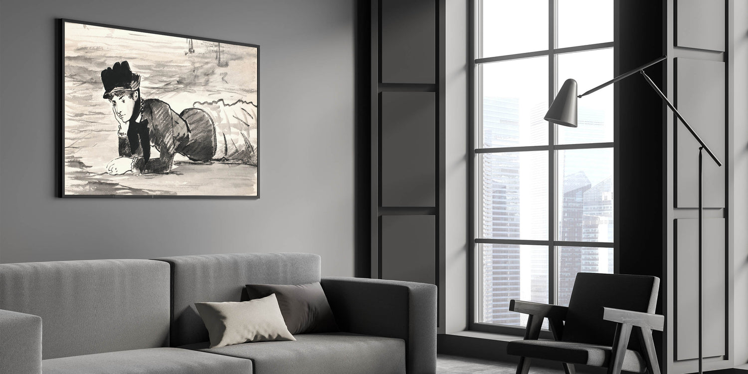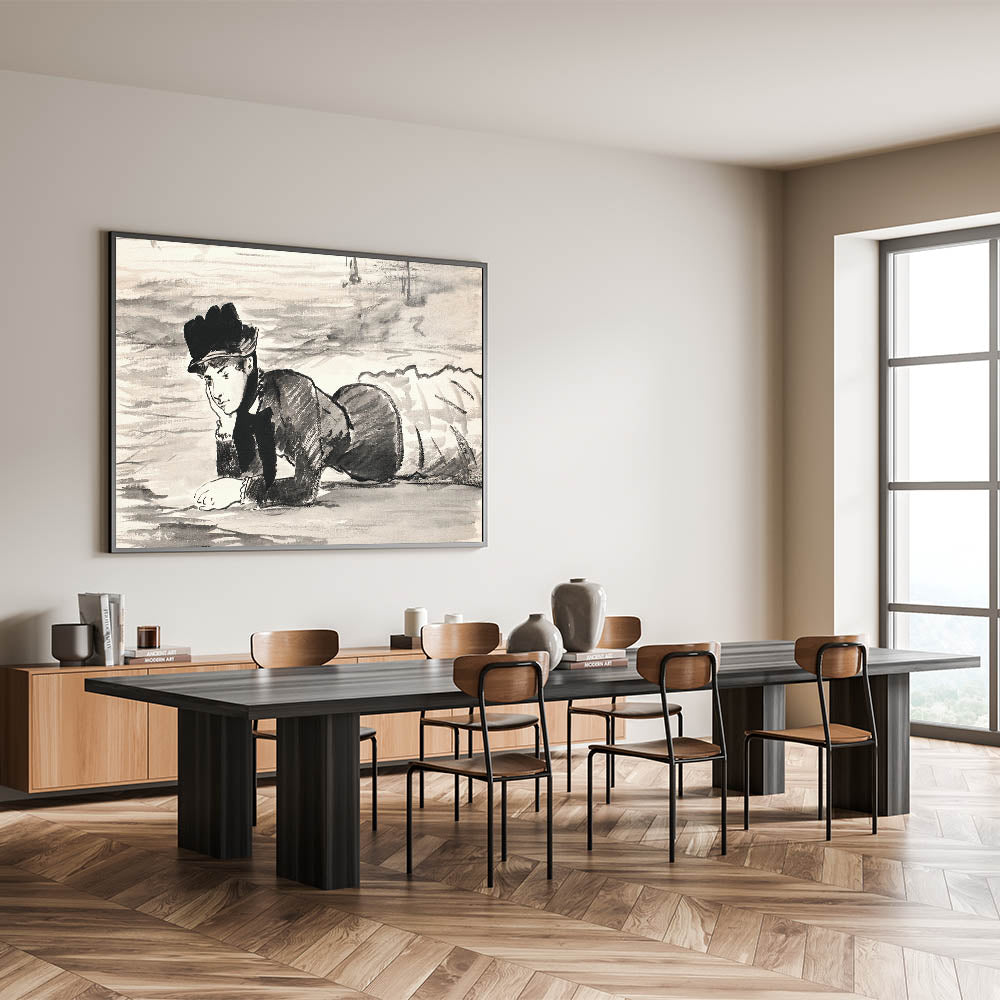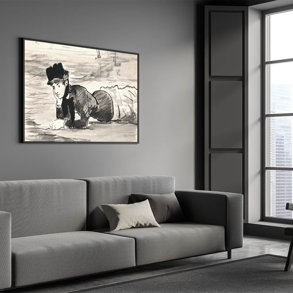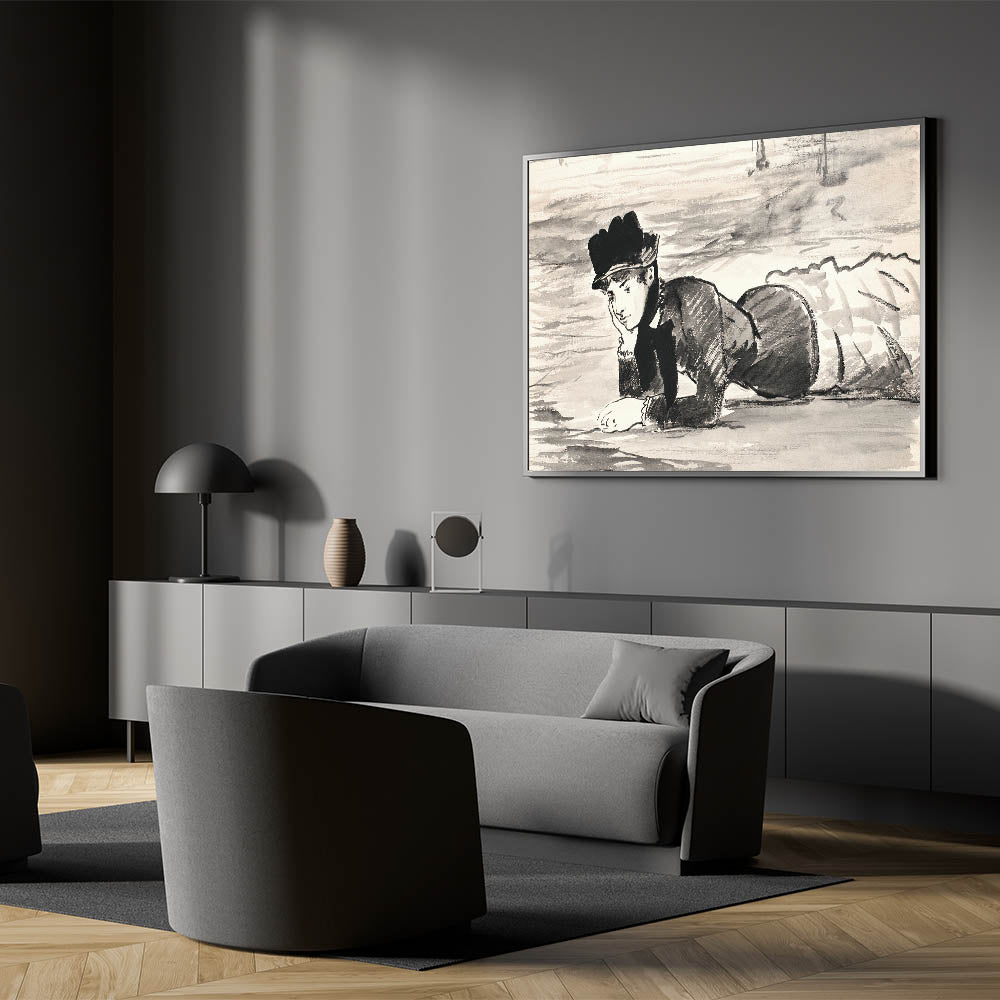 Experience the subtle elegance of Édouard Manet's Impressionist masterpiece, "Woman Lying on the Beach. Annabel Lee." Rendered in a timeless monochromatic palette, this artwork portrays a serene moment by the sea, highlighting Manet's skillful use of light and shadow. Perfect for modern or classic interiors, this Impressionist painting adds a touch of sophistication to your decor.