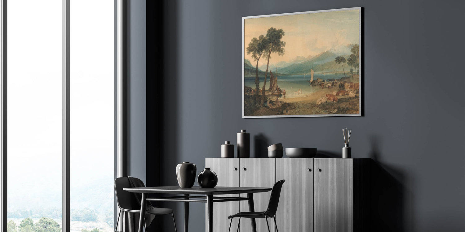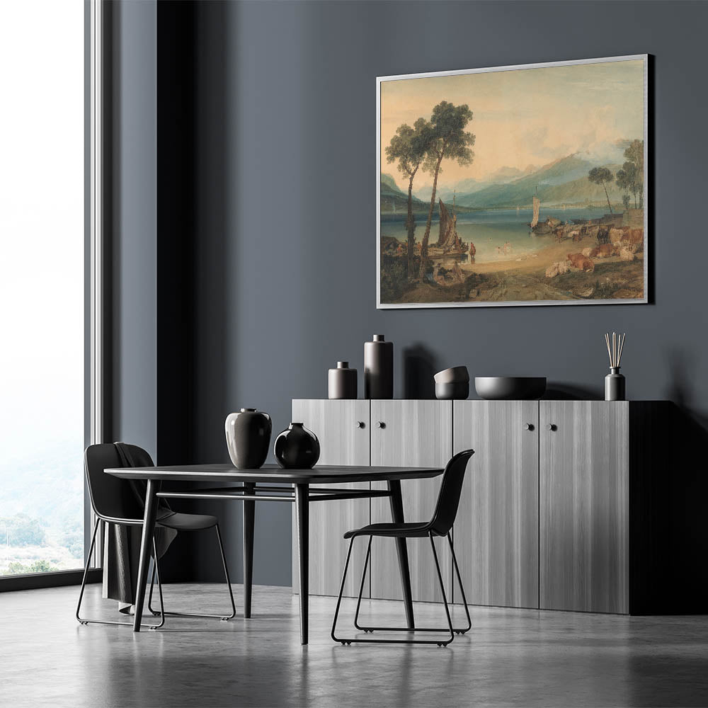 Immerse yourself in the tranquil beauty of "Lake Geneva and Mont Blanc," a masterpiece inspired by the Romantic era. This breathtaking artwork features a serene lakeside view framed by lush trees, distant sailboats, and majestic mountains. The soothing palette of soft blues, greens, and earthy tones conveys a sense of peace and connection with nature, embodying the Romanticism style of emotional landscapes. Perfect for art enthusiasts and those who appreciate historic and cultural wall decor, this piece transforms any space into a haven of timeless elegance.