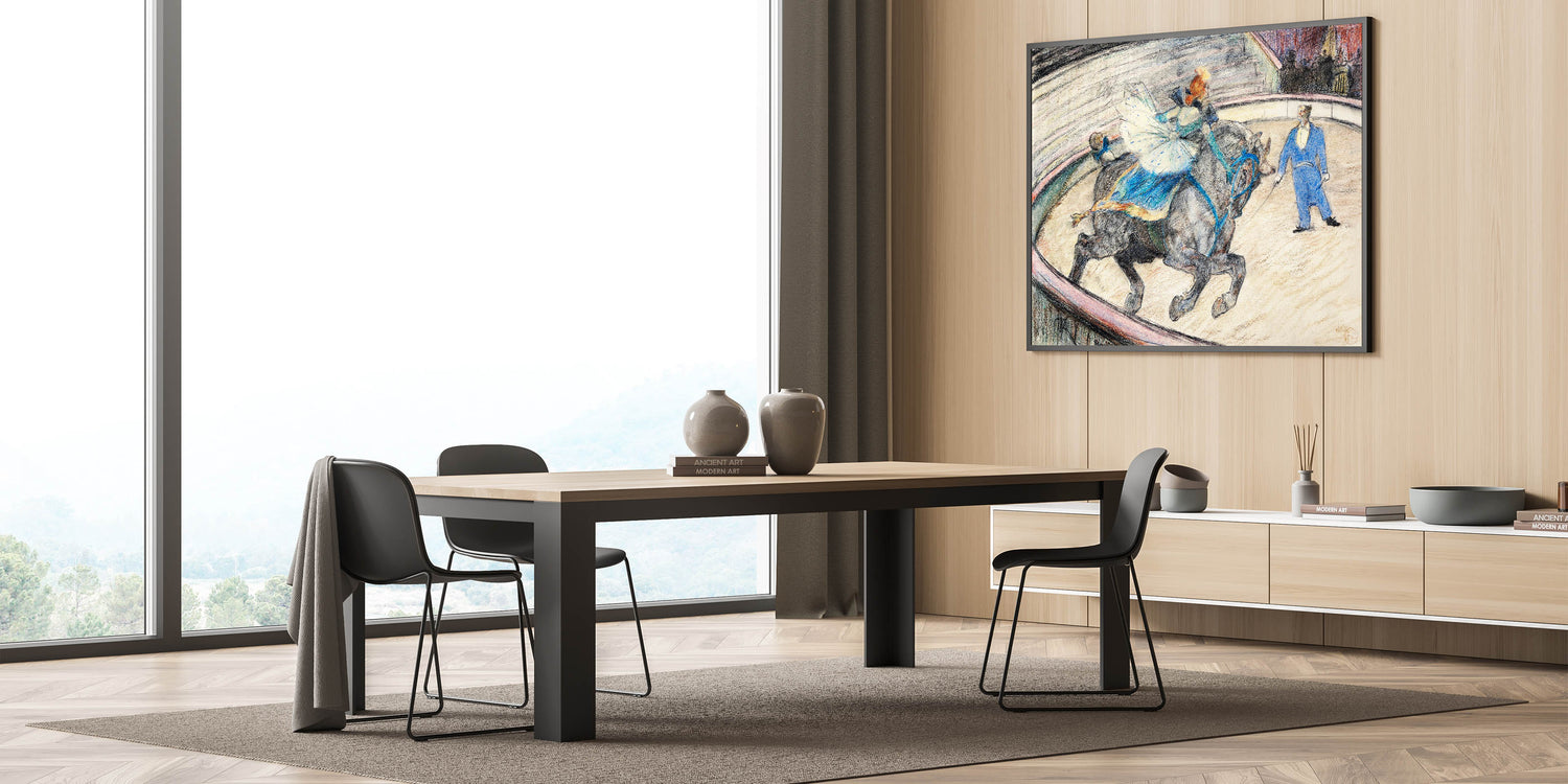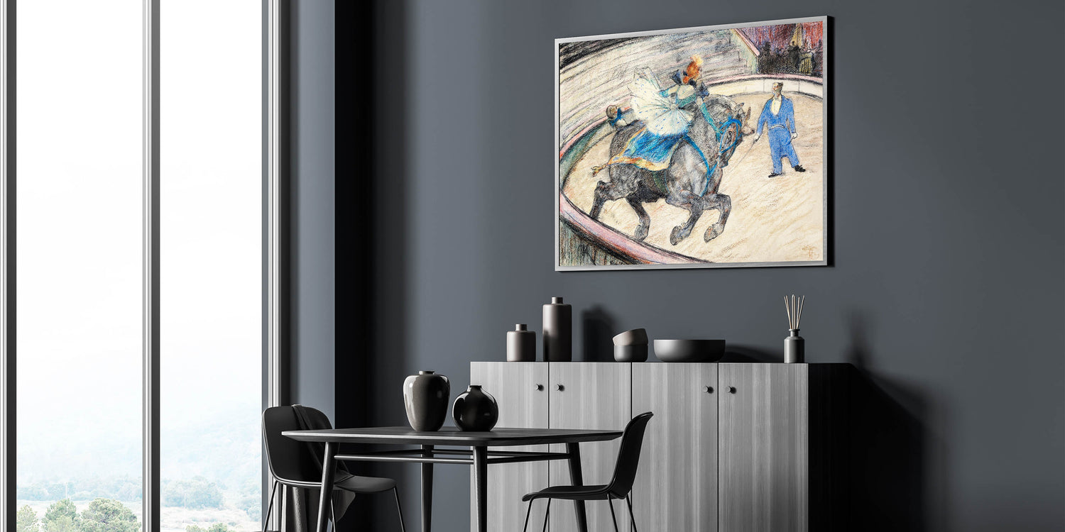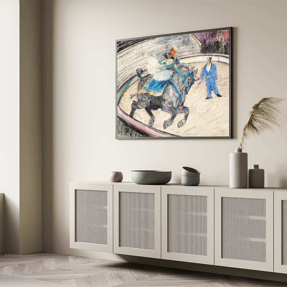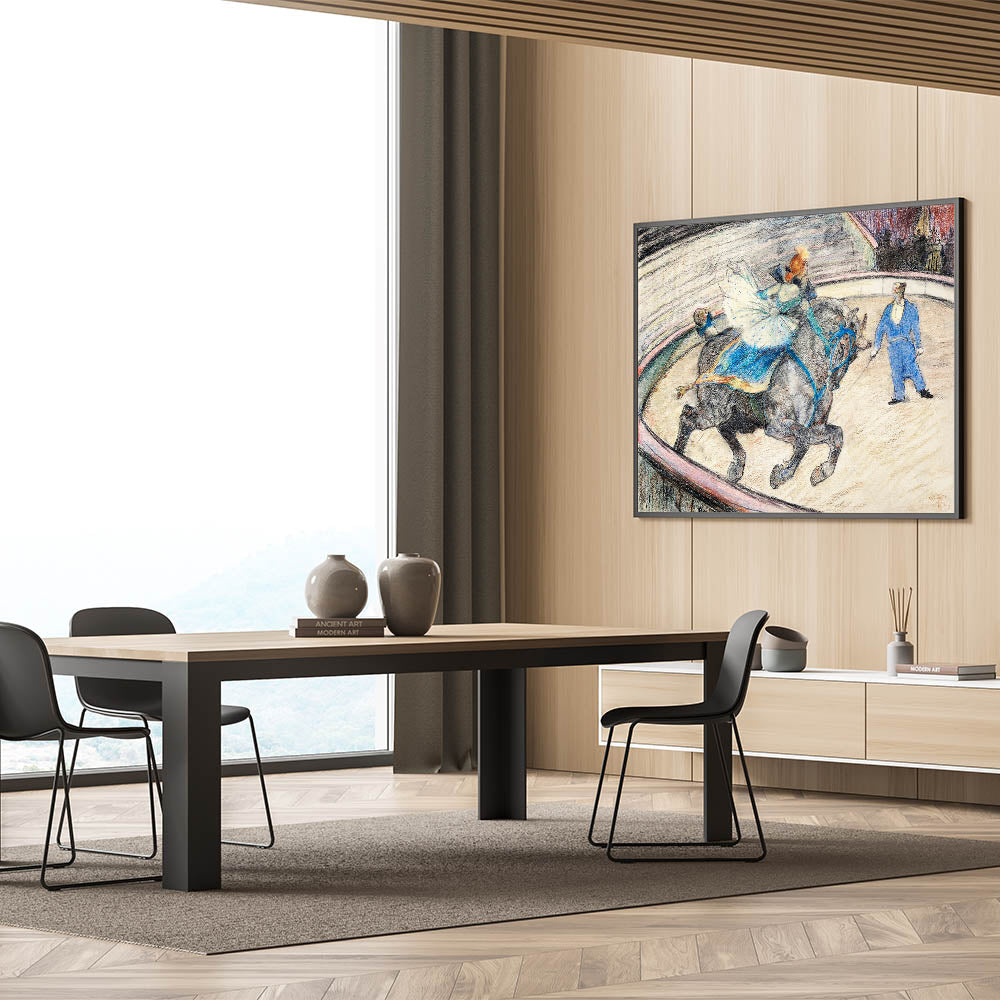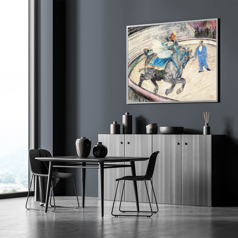 Bring energy and excitement to your space with this striking modern wall art featuring a dynamic circus scene. This captivating piece showcases a daring equestrian performance with vibrant colors and expressive details. The bold strokes and movement in this artwork make it an ideal choice for adding a lively and artistic touch to your trendy home decor.
