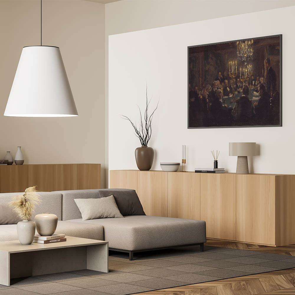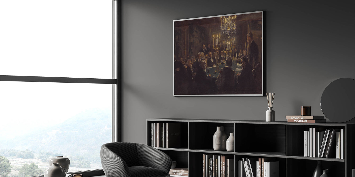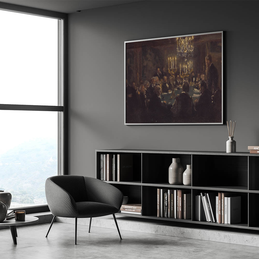 Elevate your living or office space with this timeless modern wall art, capturing an elegant society gathering illuminated by warm candlelight. This evocative piece exudes sophistication, with its deep, muted tones and atmospheric composition, perfectly balancing classic refinement and contemporary style. Ideal for those who appreciate stylish wall art that conveys intellectual and cultural depth.