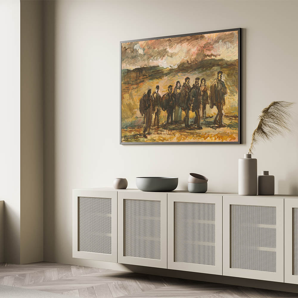 Experience the profound narrative of Refugees on the Move by Cyprián Majerník, a masterpiece that captures the emotional weight of displacement and perseverance. This Expressionist artwork depicts a group of refugees journeying across an expansive landscape, their somber expressions reflecting resilience amidst adversity. Majerník's evocative brushstrokes and earthy tones highlight the gravity of their plight, making this a deeply moving piece that resonates with the human experience.
