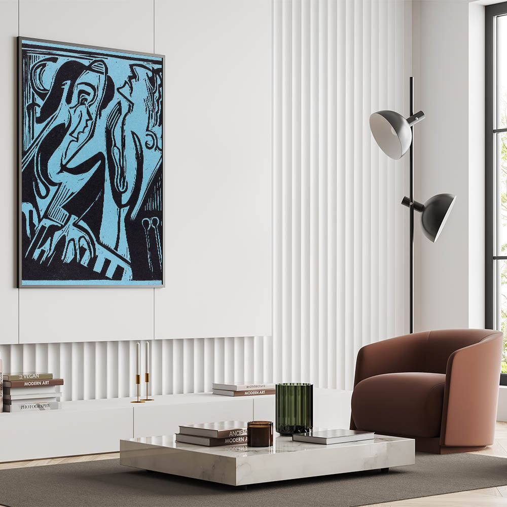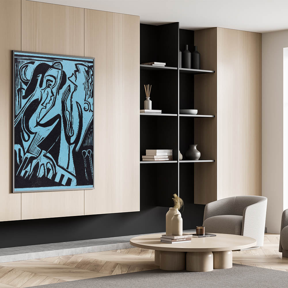 - Color Palette: A striking combination of deep blues and blacks creates a dramatic yet harmonious backdrop for the expressive figures.