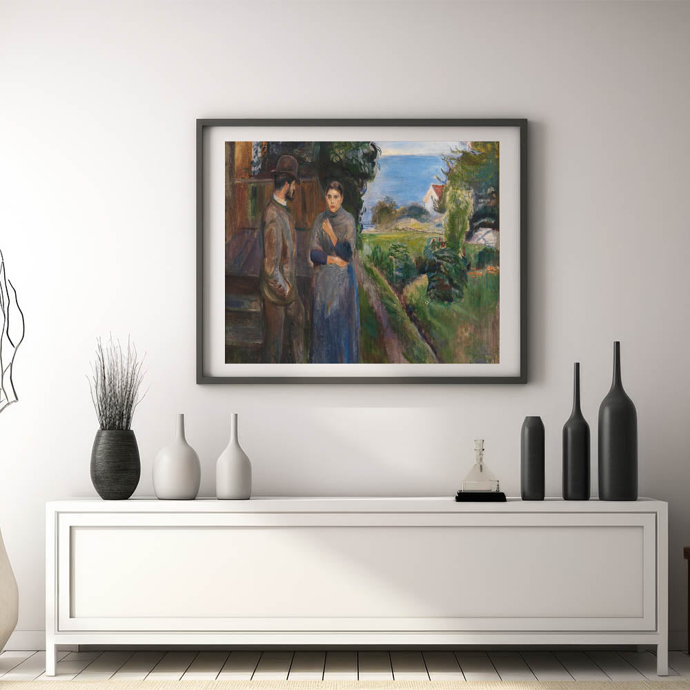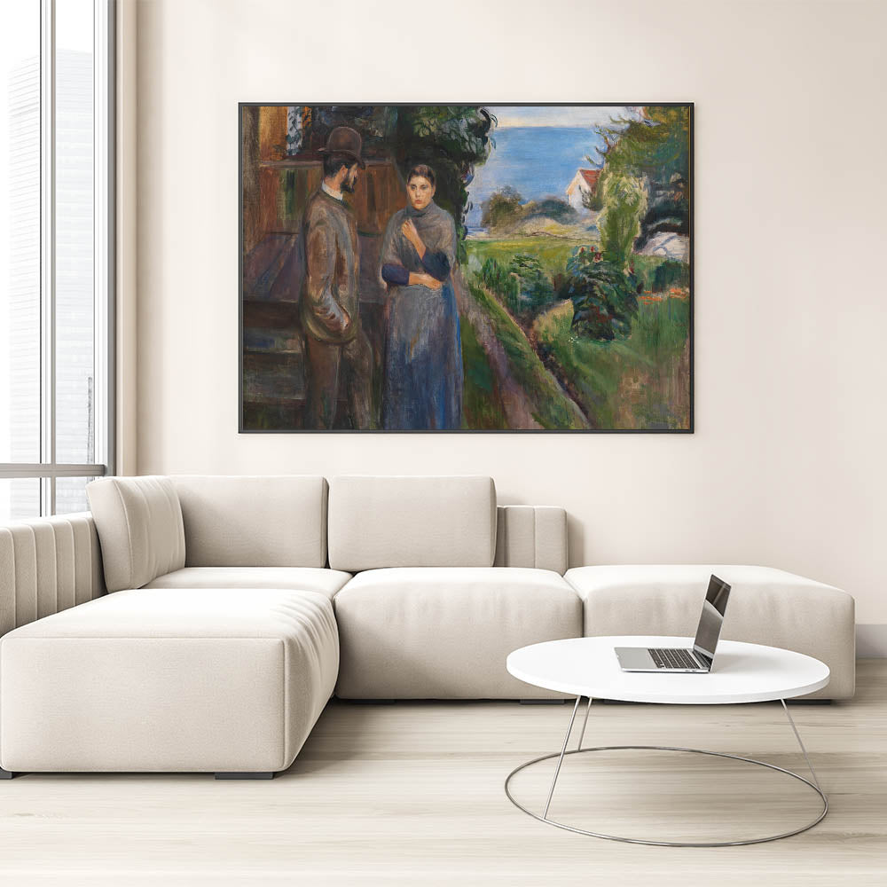 Immerse yourself in the emotional depth of Edvard Munch's Evening Passion. This evocative Expressionist art piece depicts an intimate scene between two figures in a serene, lush outdoor setting by the sea. The rich earth tones of the foreground contrast beautifully with the tranquil blues of the ocean, creating a composition filled with both tension and harmony. Munch’s expressive brushstrokes and poignant use of light bring life and emotion to this timeless masterpiece, making it a perfect addition to any sophisticated interior.