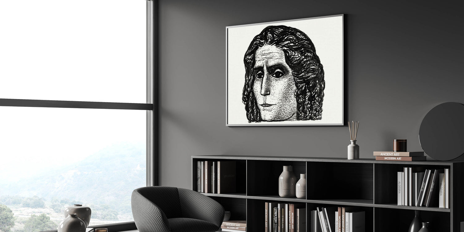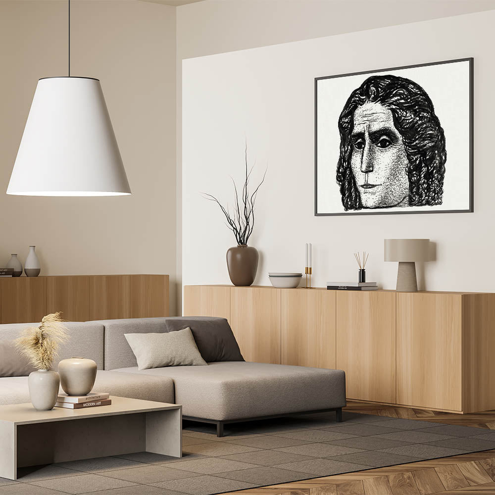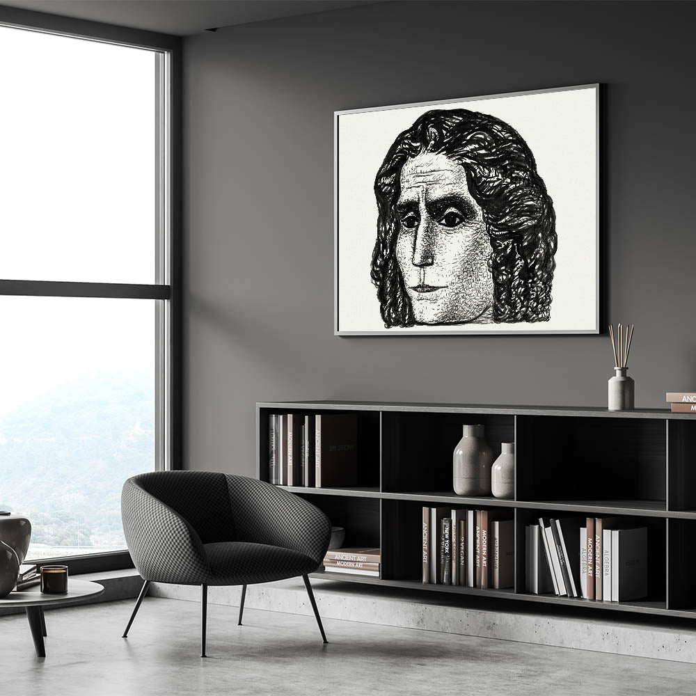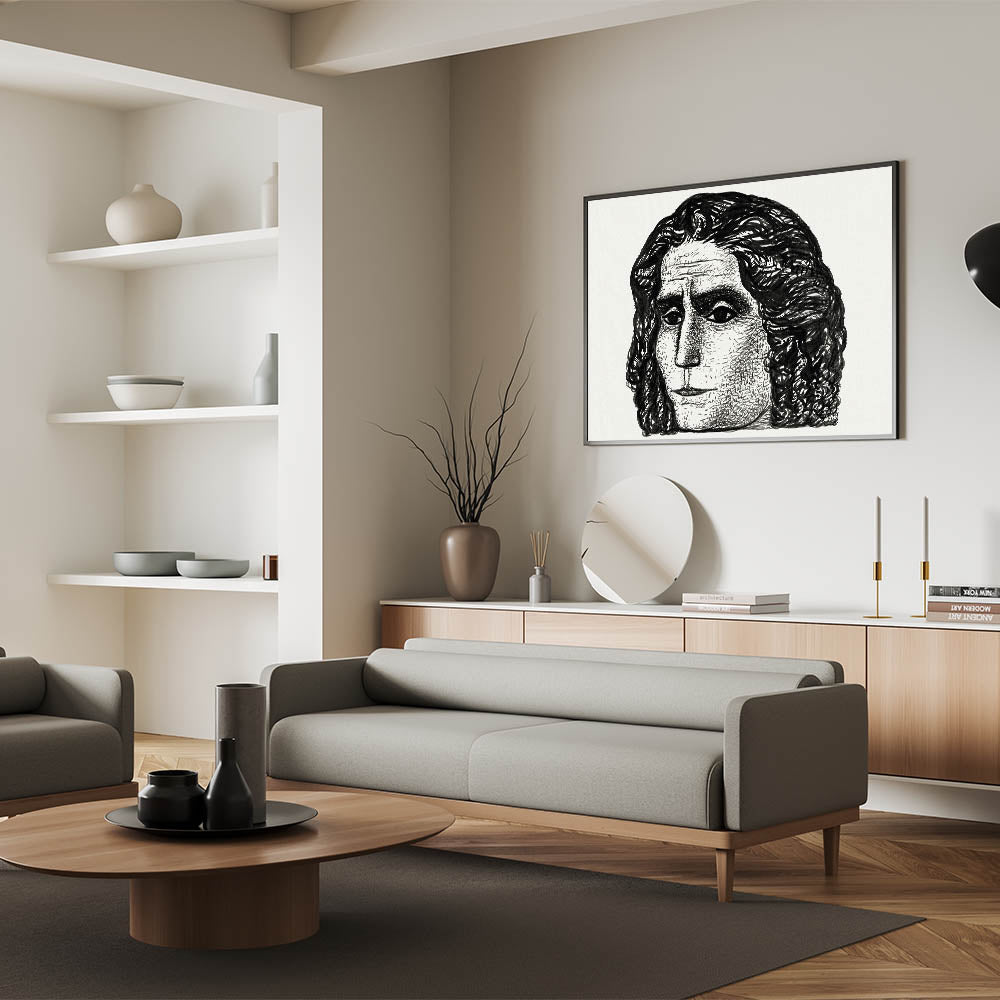 - Color Palette: Monochrome black and white, emphasizing bold contrasts and intricate textures to highlight the portrait’s expressive features.