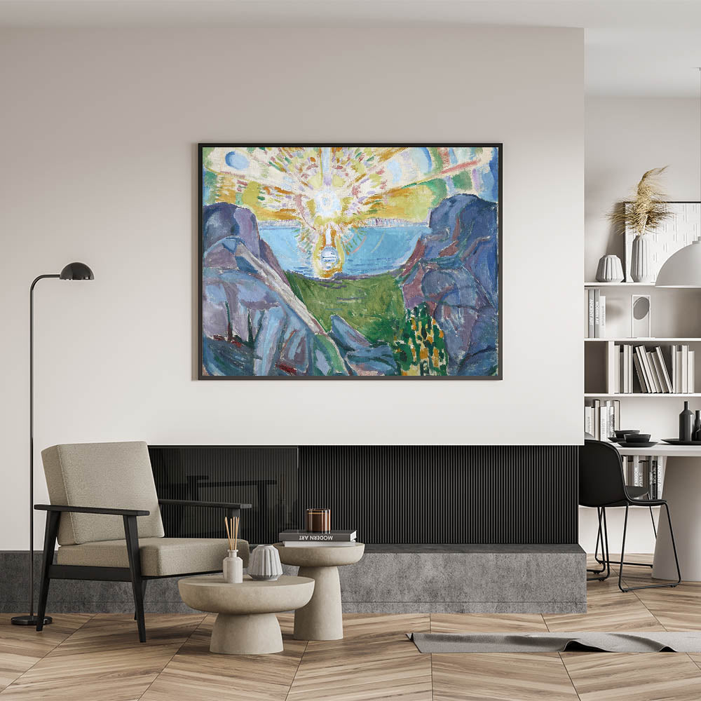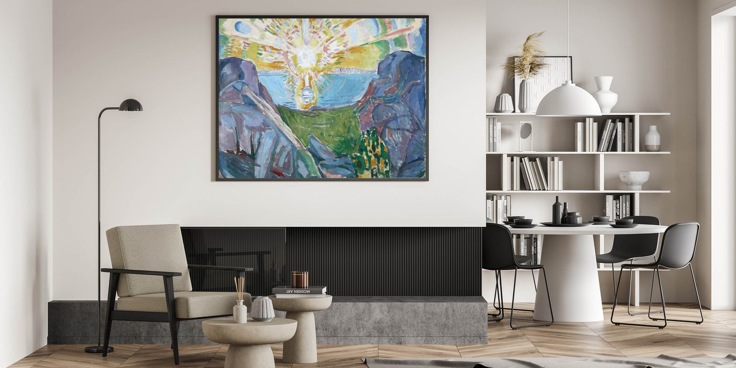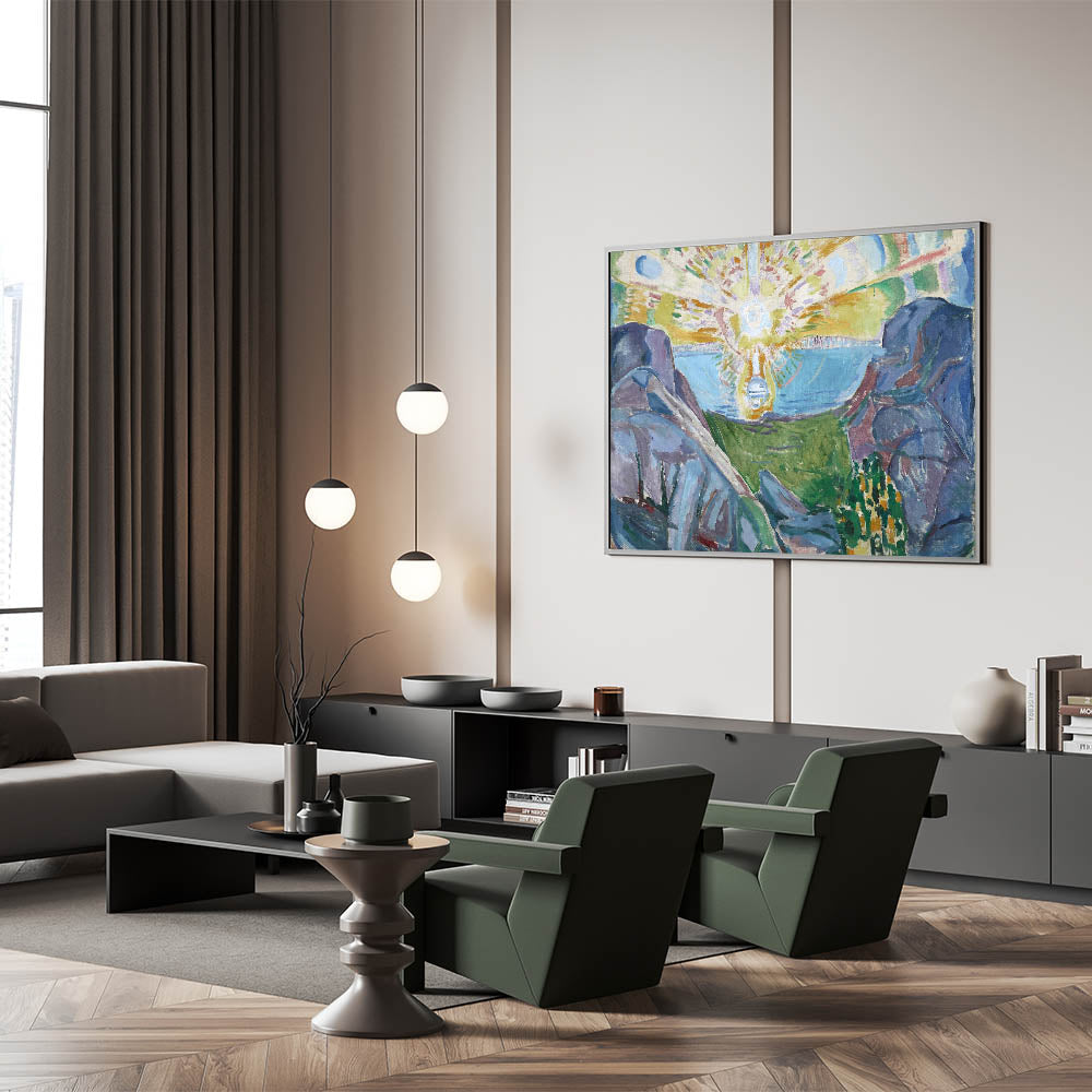 Embrace the beauty of Expressionist Art with this radiant Abstract Expressionism painting, depicting a vibrant sunburst illuminating a scenic mountain landscape. Featuring a harmonious blend of greens, blues, and yellows, this Expressionism Wall Art evokes a sense of wonder and tranquility. Perfect for contemporary and modern interiors, this artwork will transform your space with its unique charm.