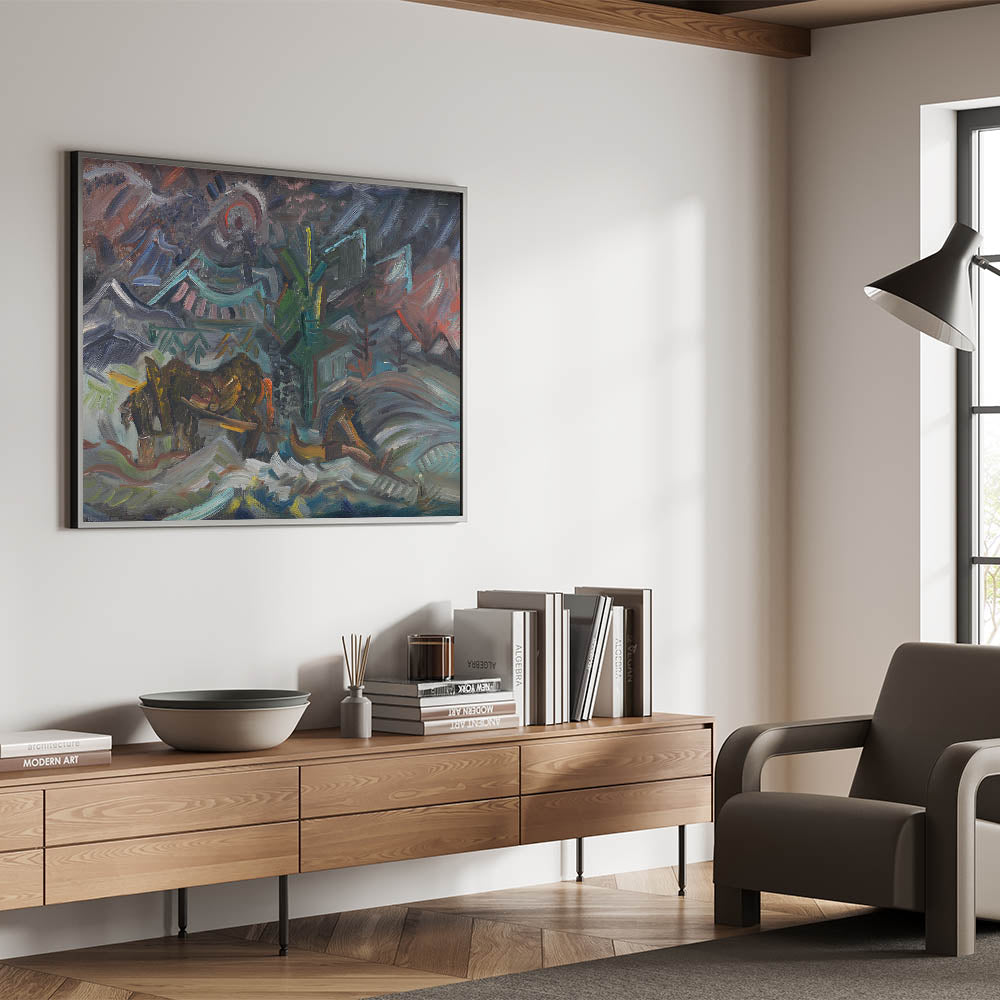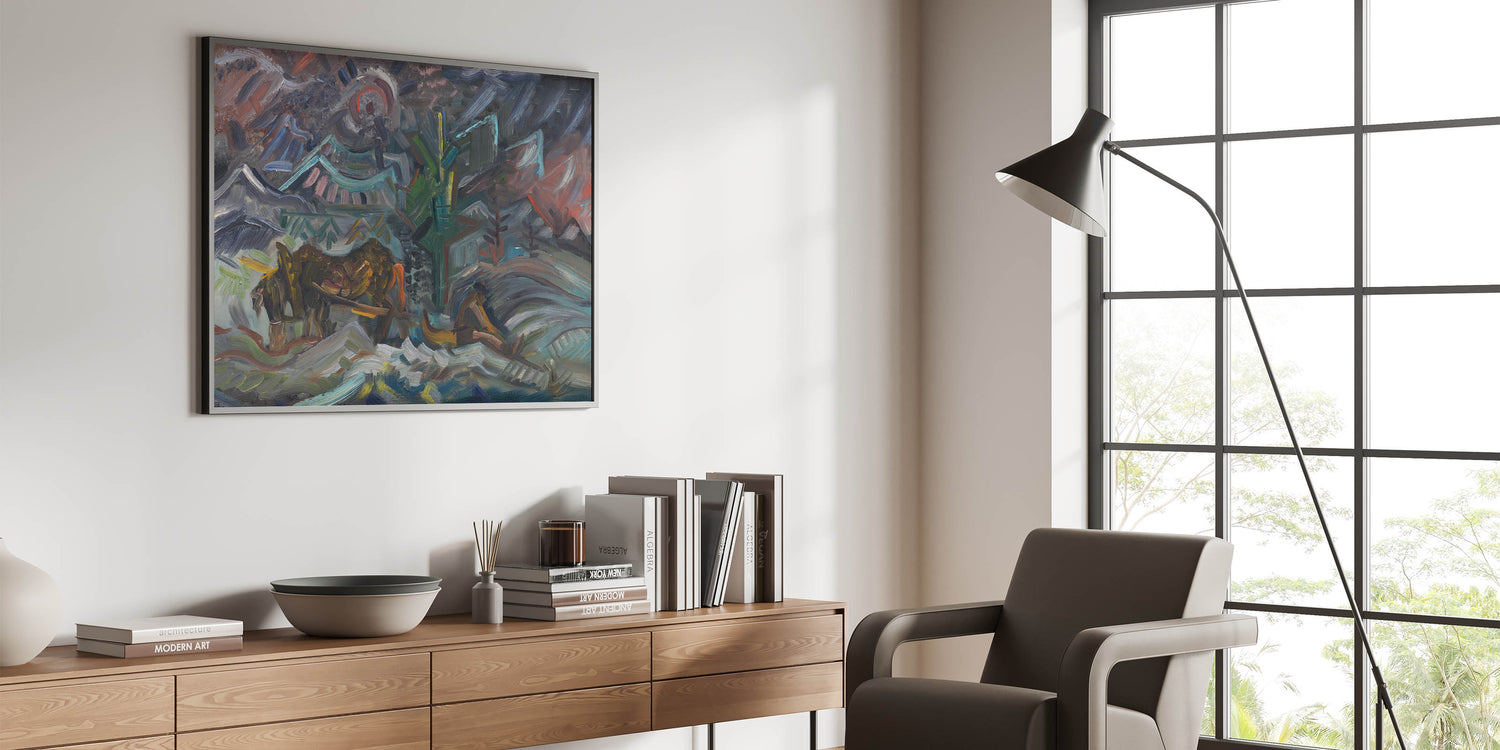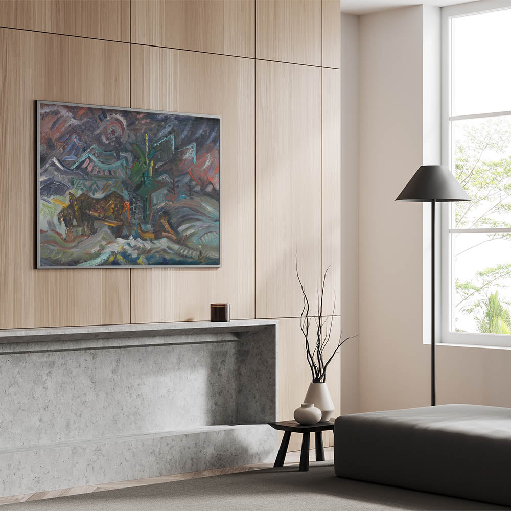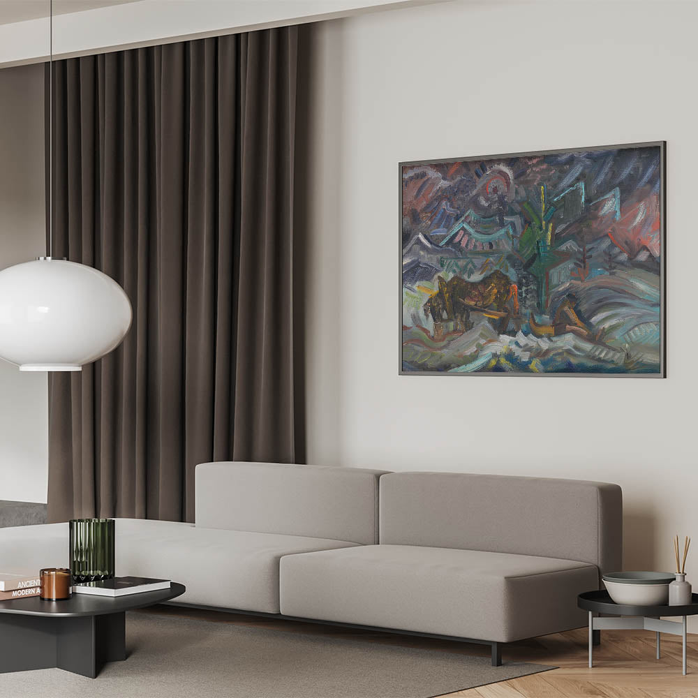 Transform your living space with this evocative artwork, embodying both the spirit of labor and the serenity of nature. Ideal for art enthusiasts who appreciate storytelling through abstract forms.