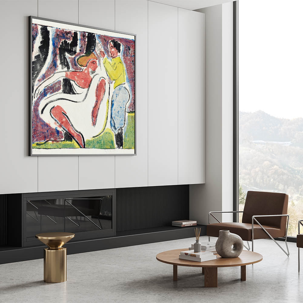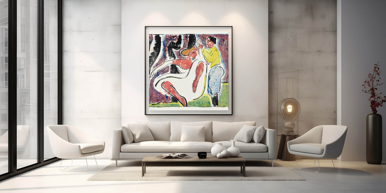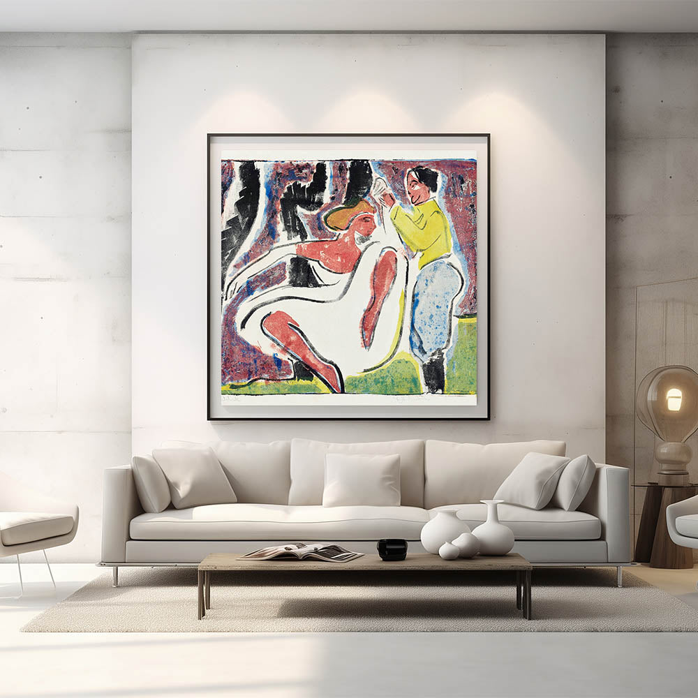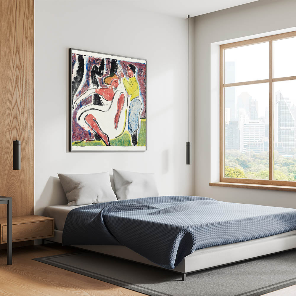 Immerse yourself in the vibrant rhythm of Russian Dancers by Ernst Ludwig Kirchner. This dynamic Expressionist artwork captures the lively interaction of two figures mid-dance, rendered in bold brushstrokes and striking colors. The rich palette of reds, yellows, blues, and blacks emphasizes the fluidity of movement and energy, creating a captivating portrayal of cultural celebration. Perfect for art lovers who appreciate movement and vibrancy, this piece brings excitement and life to any setting.