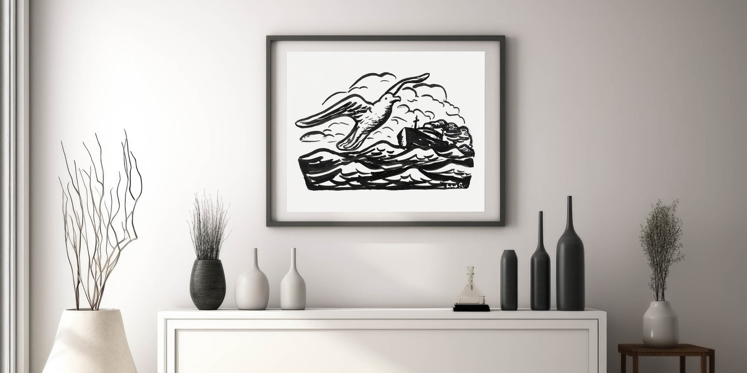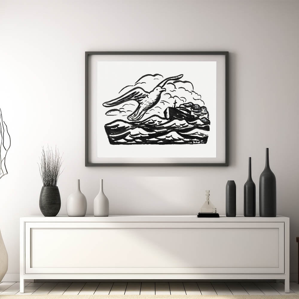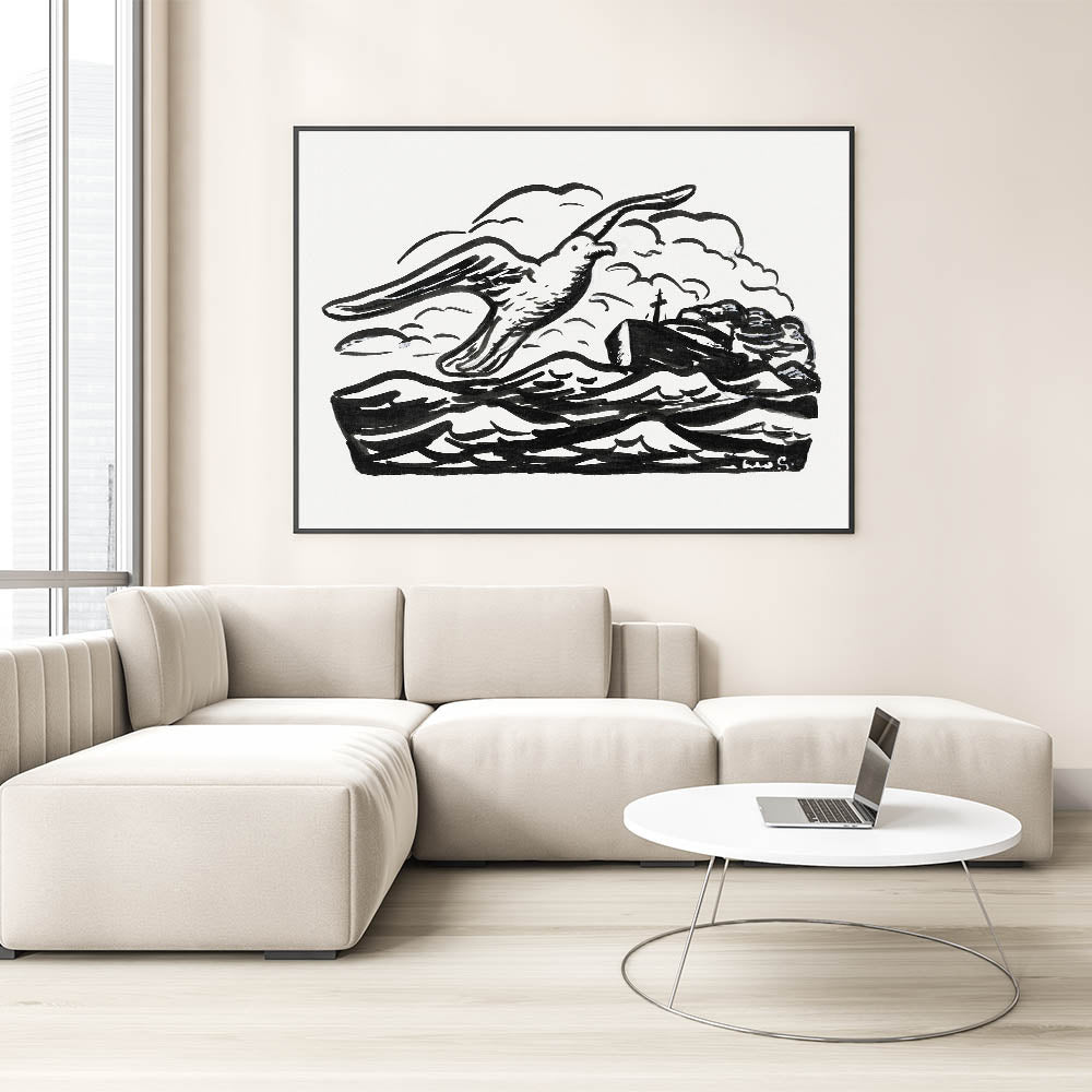 Celebrate the harmony of nature and industry with Seagull and Steamship at Sea by Leo Gestel. This monochromatic Expressionist artwork showcases a soaring seagull against a dramatic seascape, with a steamship cutting through the waves in the background. The bold black-and-white lines evoke movement and contrast, capturing the timeless interaction between the natural world and human innovation. Perfect for lovers of nautical themes and minimalist art, this piece adds sophistication and narrative to any setting.