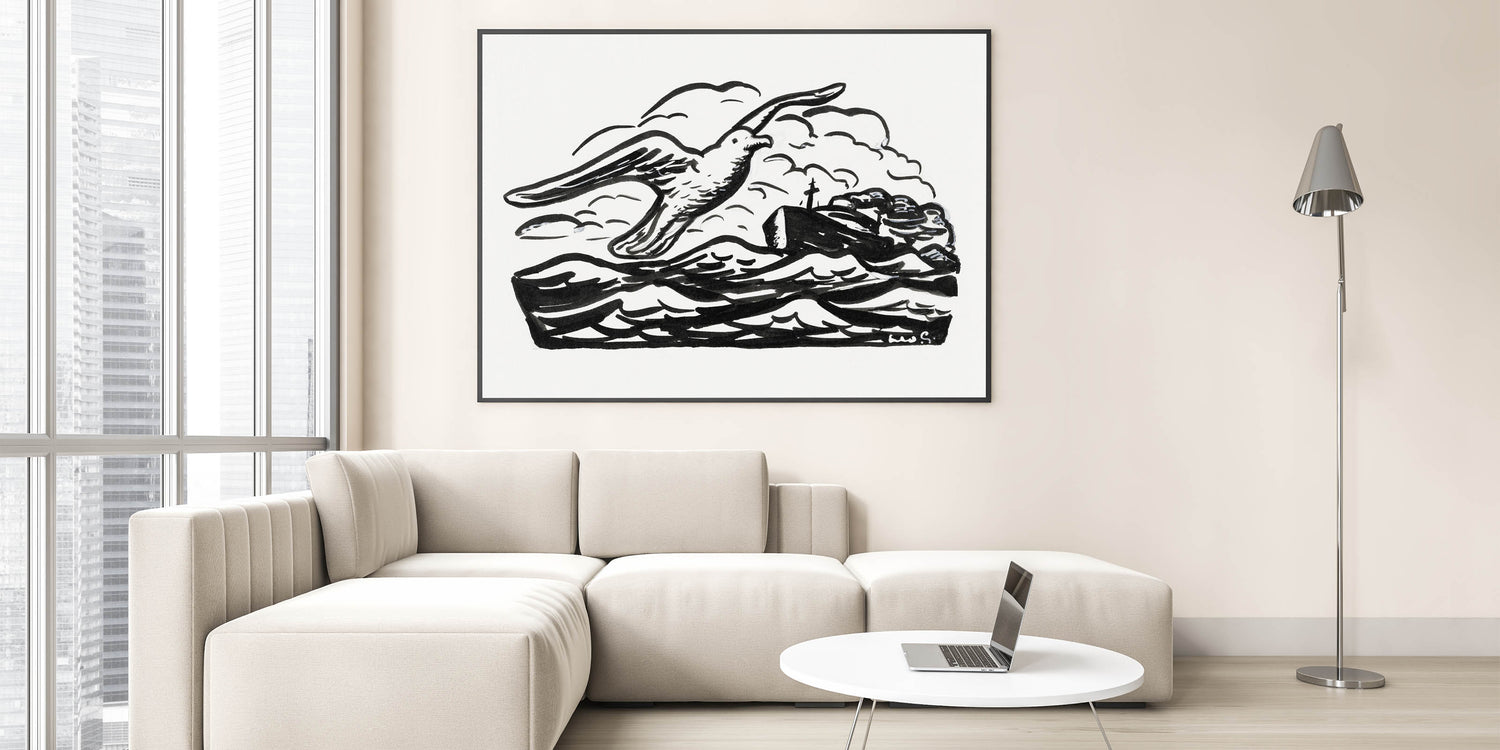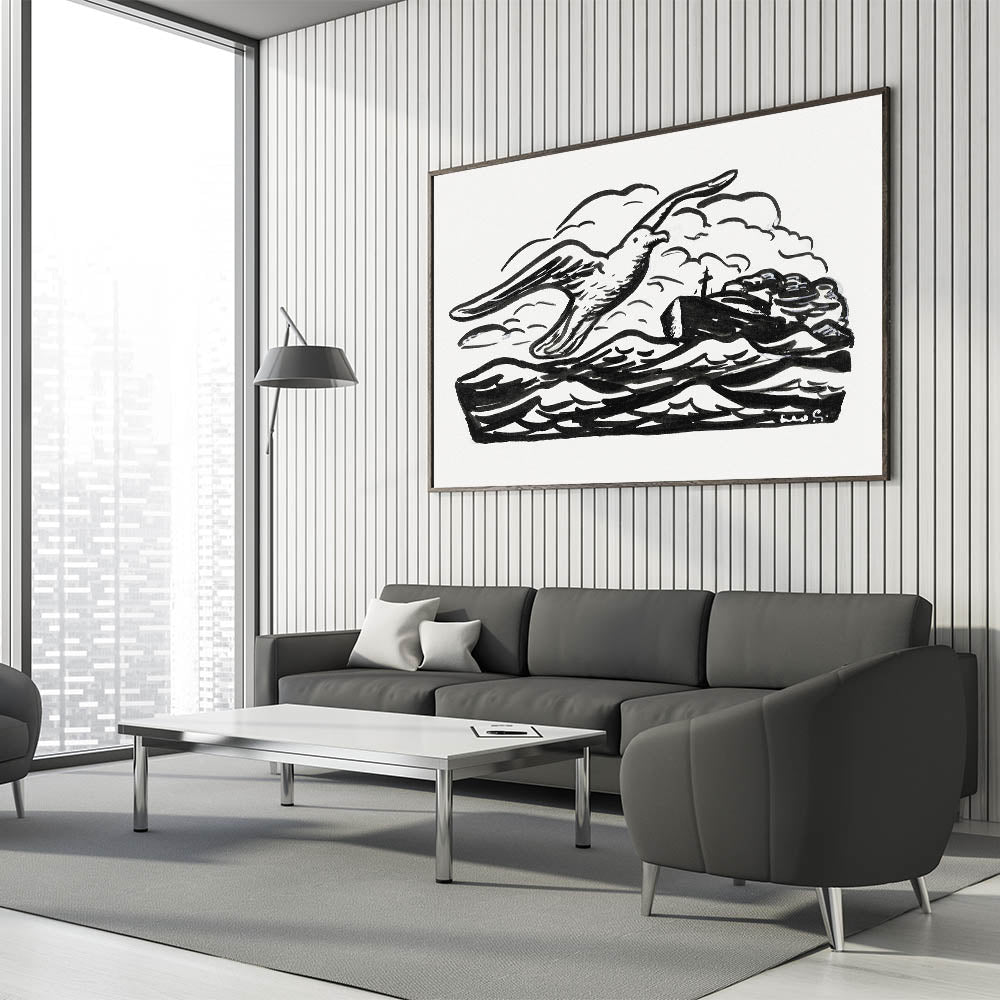 Enhance your space with the dramatic energy of Seagull and Steamship at Sea. This artwork brings a blend of power and tranquility, perfect for any art collection.