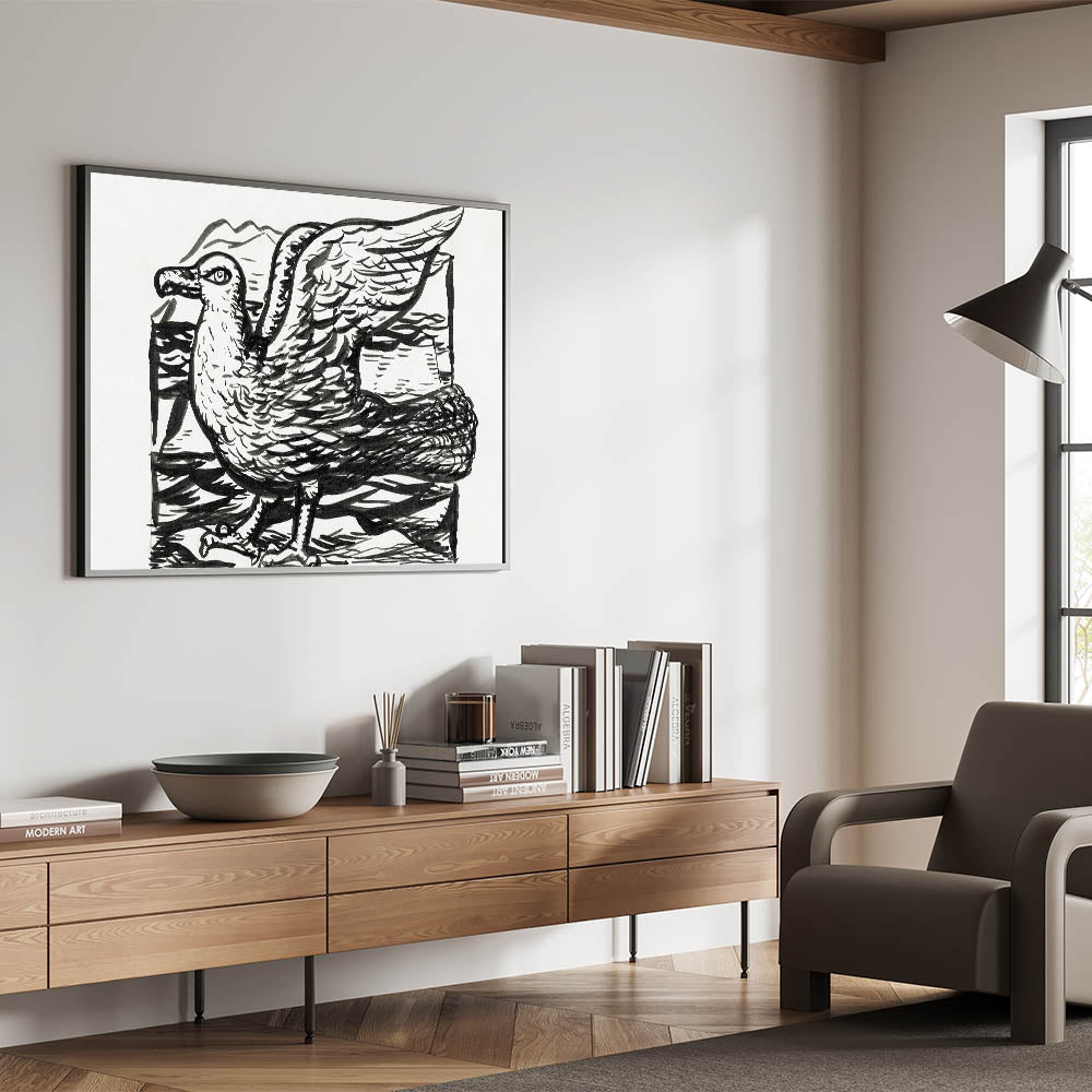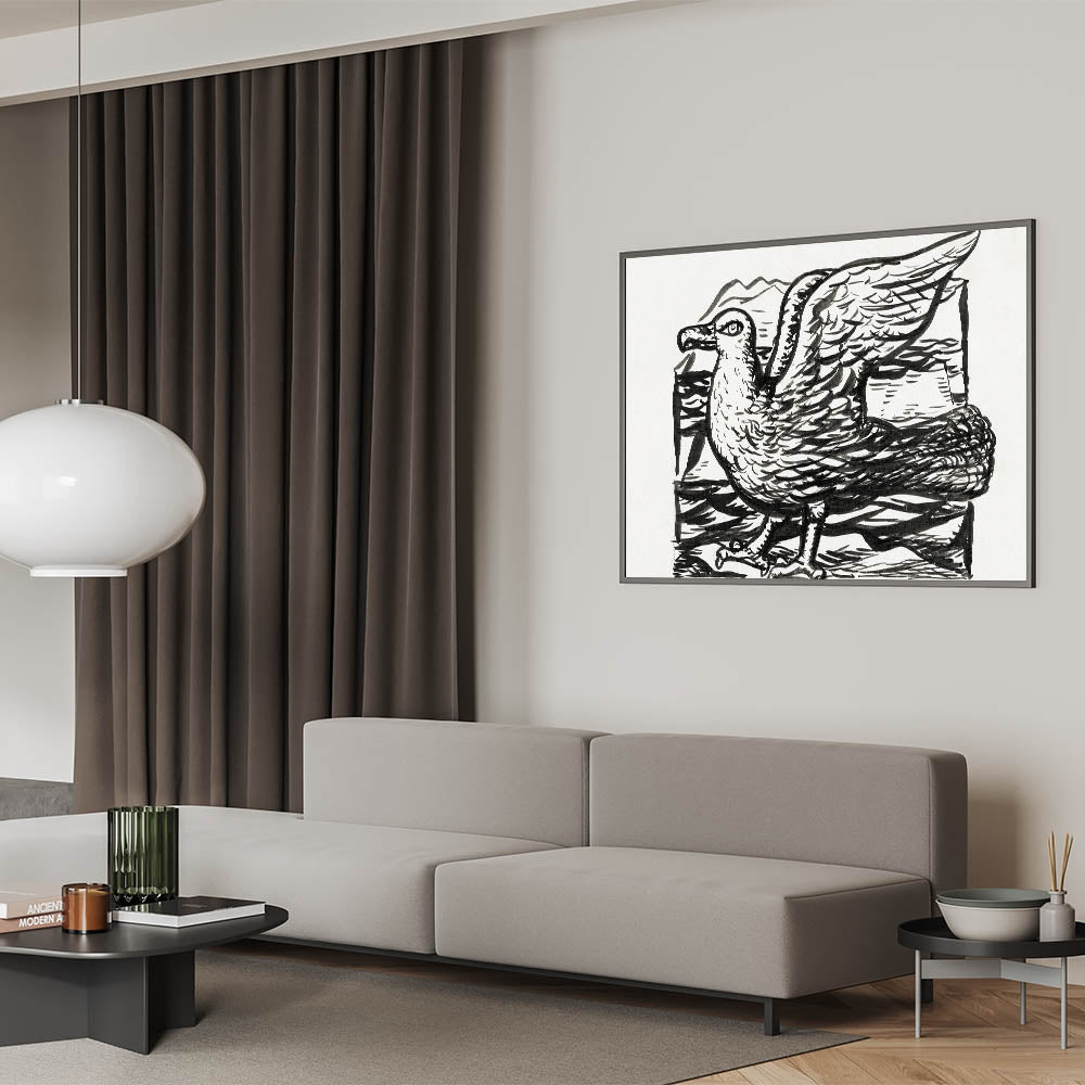 - Monochromatic Beauty: Dynamic black-and-white strokes highlighting the seagull's texture and form.