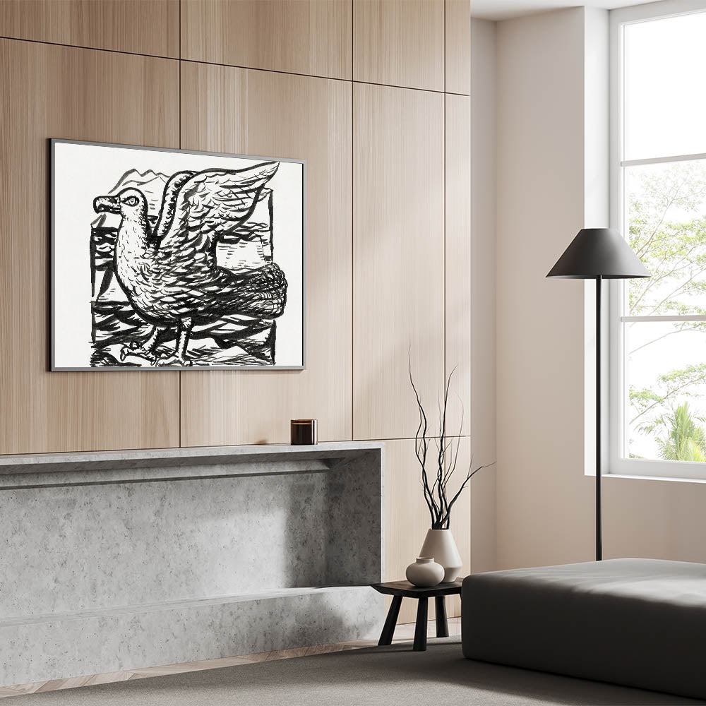 Experience the bold simplicity of Seagull by Leo Gestel, a striking Expressionist black-and-white artwork. This piece captures a powerful seagull perched against a mountainous backdrop, rendered with dynamic and textured linework. The monochromatic palette emphasizes the strength and majesty of the bird, making it a timeless example of minimalist Expressionism. Perfect for art lovers who appreciate bold subjects and intricate designs, this artwork brings a sense of freedom and elegance to any space.