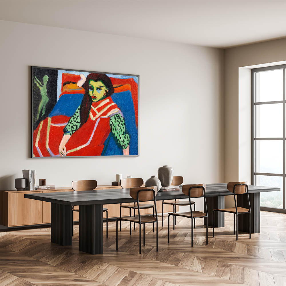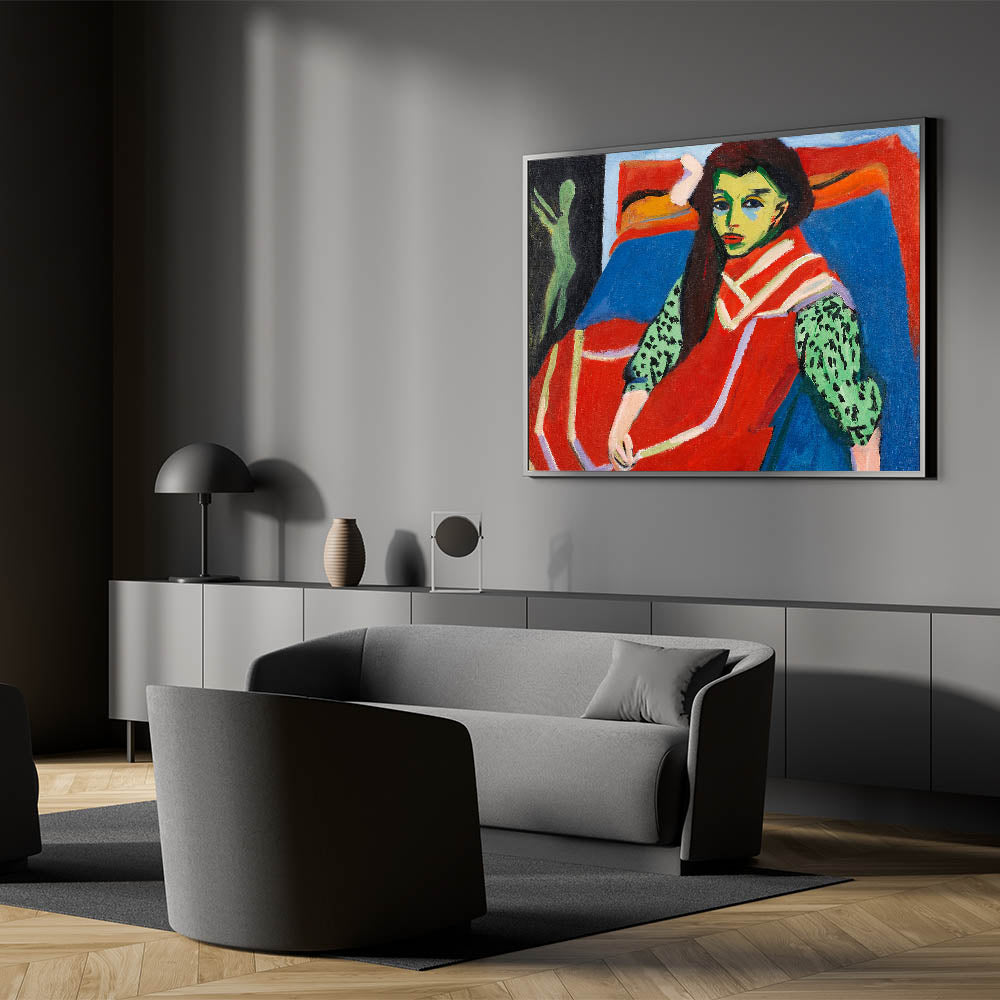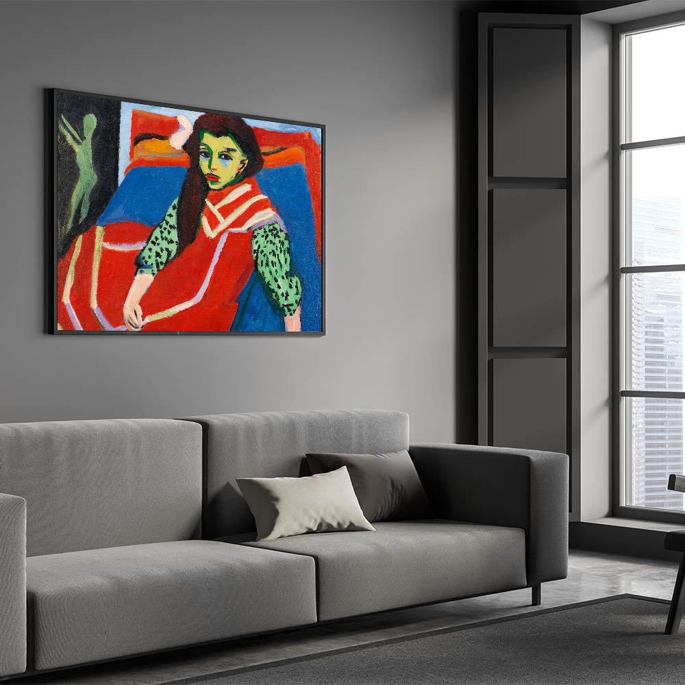 Discover the vivid and emotive world of Seated Girl (1910) by Ernst Ludwig Kirchner, a quintessential Expressionist masterpiece. This artwork showcases a seated figure adorned in vibrant red and blue, with striking green tones highlighting the contours of her face. The bold use of color and expressive brushstrokes exemplify Kirchner’s ability to evoke emotion and depth, making this piece a timeless example of Expressionism. Perfect for art enthusiasts who appreciate dramatic palettes and thought-provoking compositions, this artwork brings bold energy and narrative to any space.