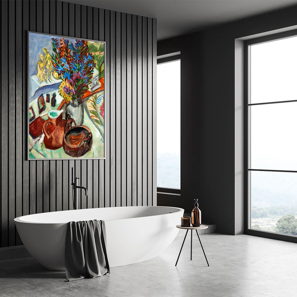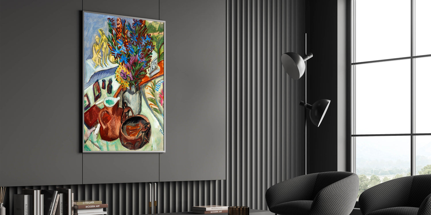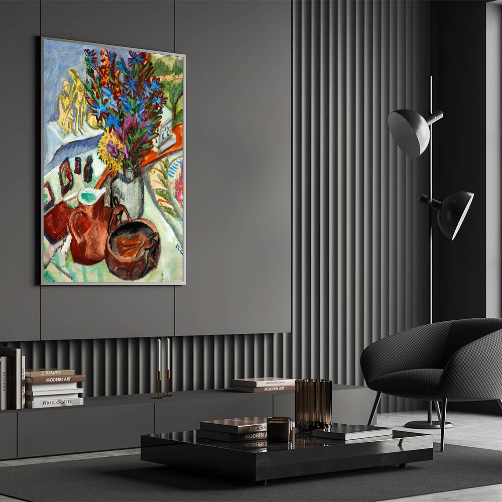 Add a vibrant touch of Expressionist Art to your space with Still Life with Jug and African Bowl by Ernst Ludwig Kirchner. This exquisite painting captures a dynamic arrangement of objects, including a striking bouquet of blue and violet flowers, earthy-toned pottery, and intricate patterns. The artist’s bold use of color and fluid brushstrokes embodies Modern Expressionism, making this piece a perfect choice for anyone seeking both sophistication and artistic depth.
