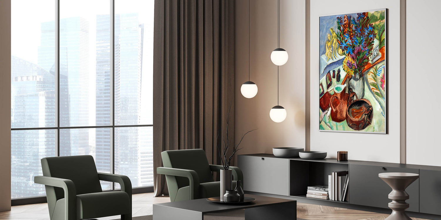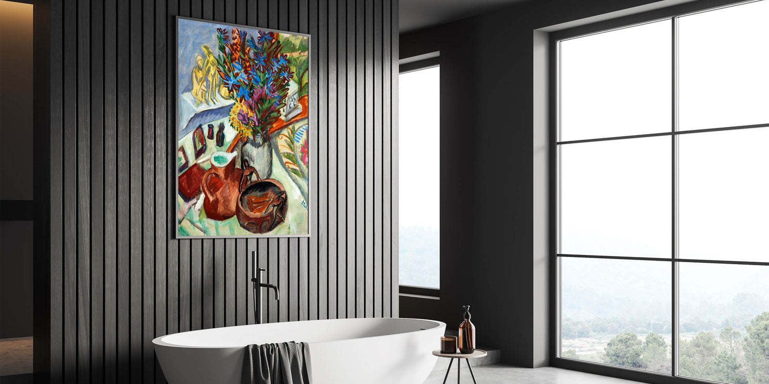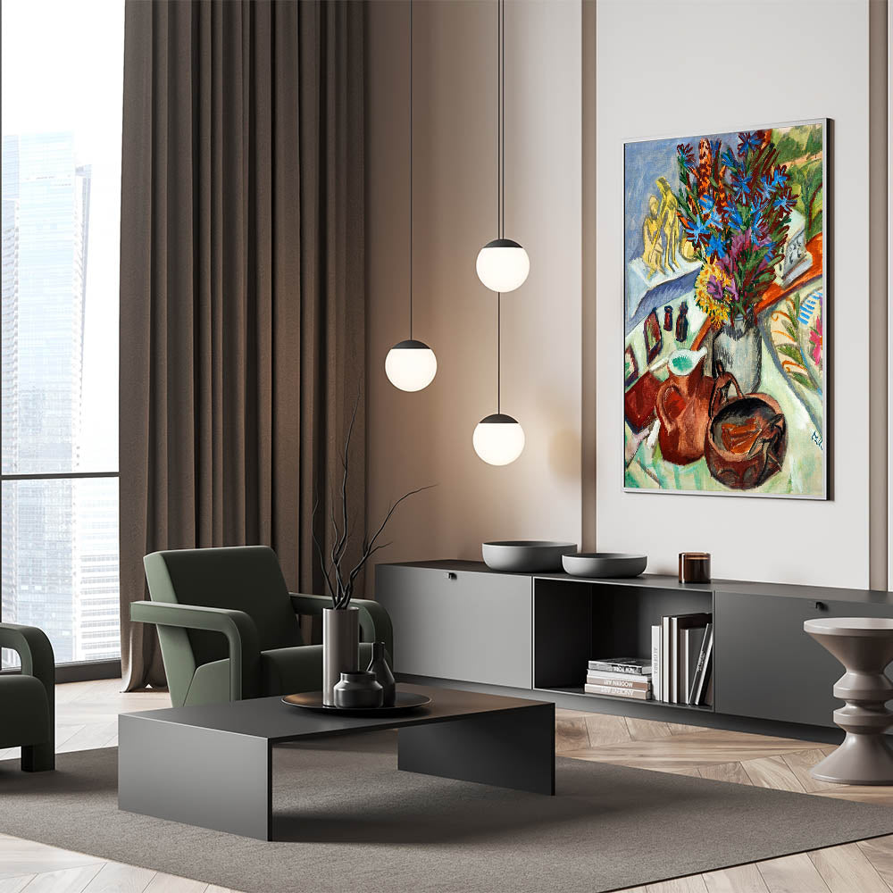 Add a vibrant touch of Expressionist Art to your space with Still Life with Jug and African Bowl by Ernst Ludwig Kirchner. This exquisite painting captures a dynamic arrangement of objects, including a striking bouquet of blue and violet flowers, earthy-toned pottery, and intricate patterns. The artist’s bold use of color and fluid brushstrokes embodies Modern Expressionism, making this piece a perfect choice for anyone seeking both sophistication and artistic depth.