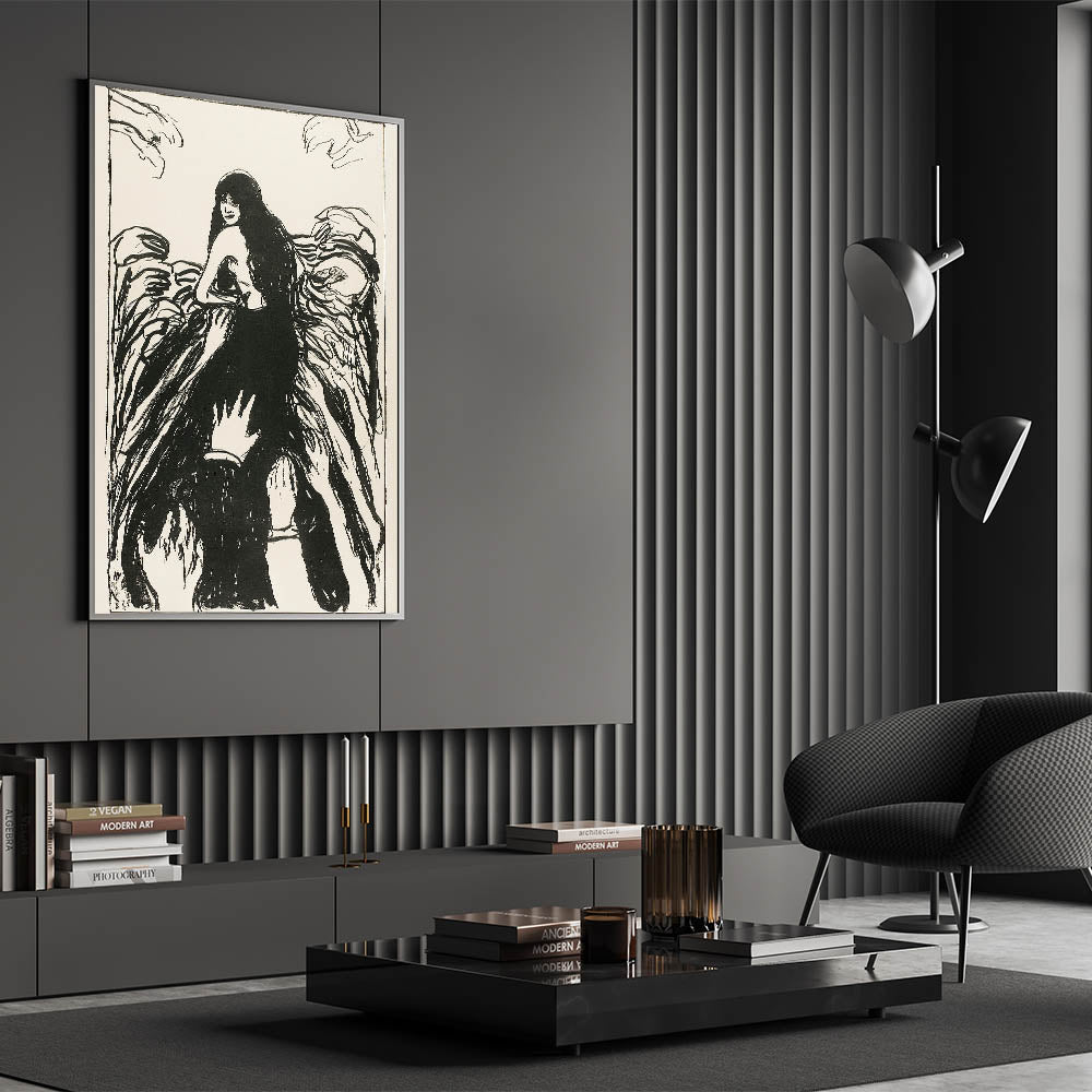 Discover Edvard Munch's hauntingly beautiful "The Hands," a powerful black-and-white Expressionist masterpiece from 1895. This artwork explores the complexities of human emotions, featuring a central figure with flowing hair, surrounded by shadowy, abstract hands reaching into the frame. Munch’s bold, expressive lines evoke an atmosphere of mystery and introspection, making this piece a profound addition to any space.