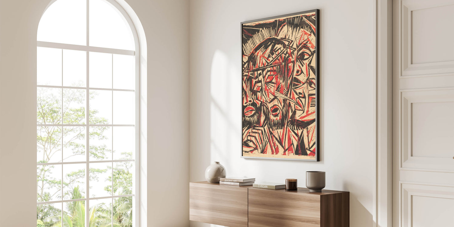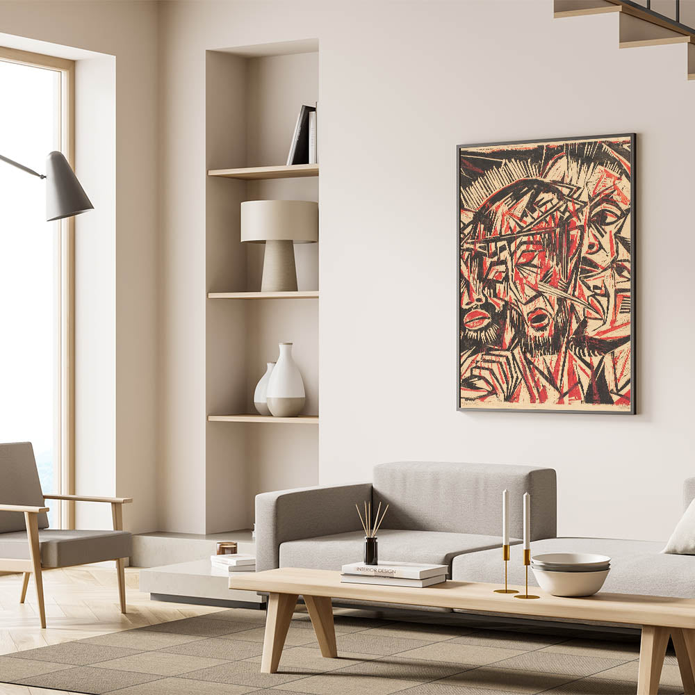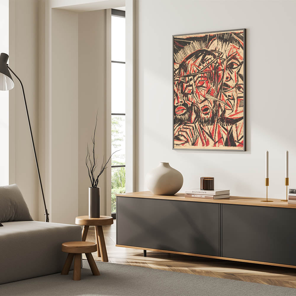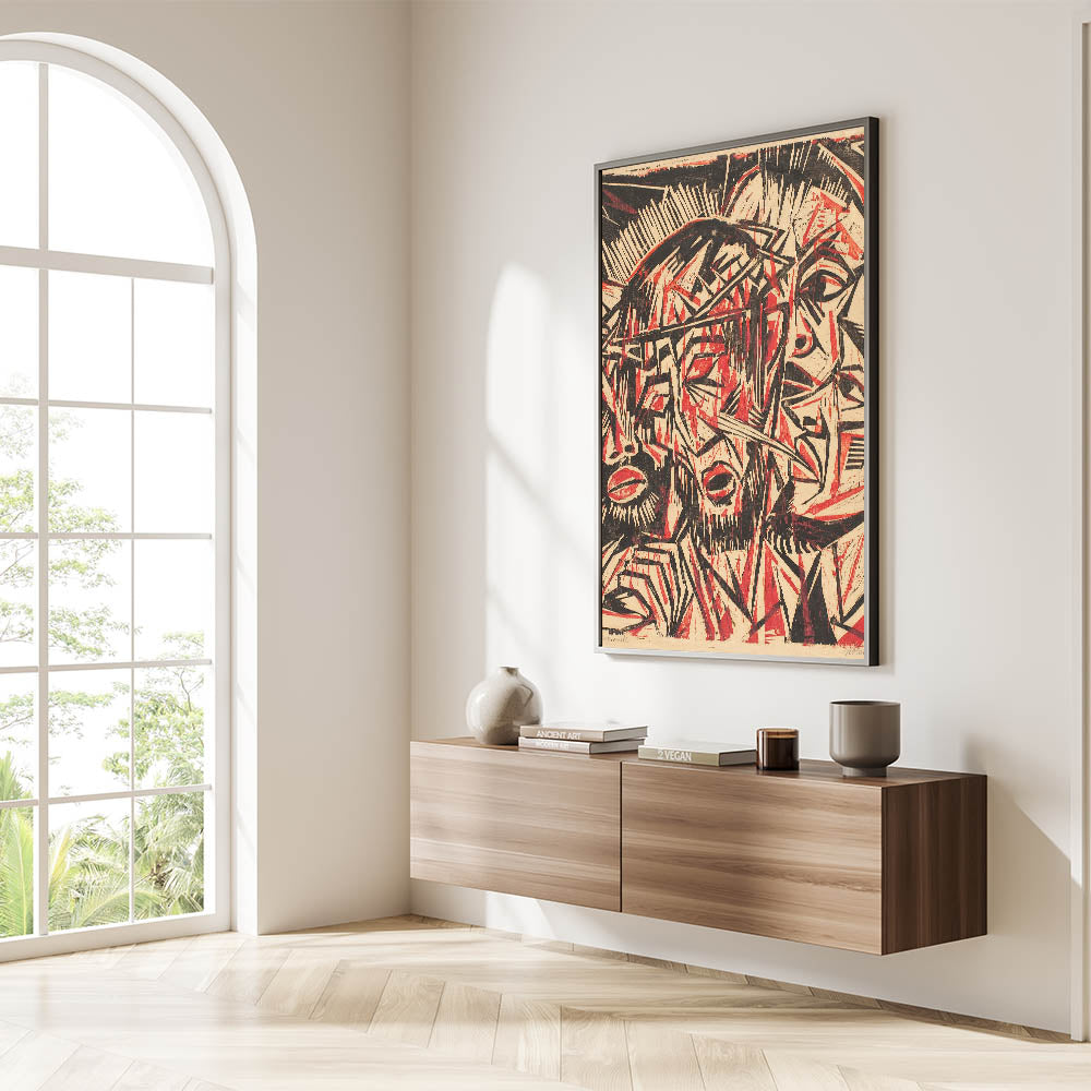 Experience the dramatic intensity of Otto Lange's "The Mocking of Christ," an impactful Expressionist masterpiece. This powerful artwork features a dynamic composition of red, black, and white, creating sharp contrasts and angular forms that convey raw emotion and suffering. Lange’s bold style and deep religious themes make this piece both visually striking and thought-provoking, ideal for those seeking art with profound narrative depth.