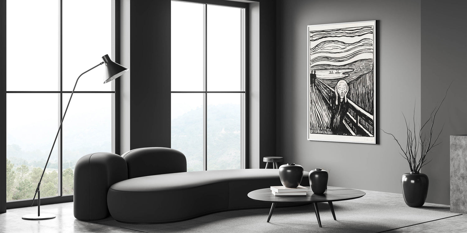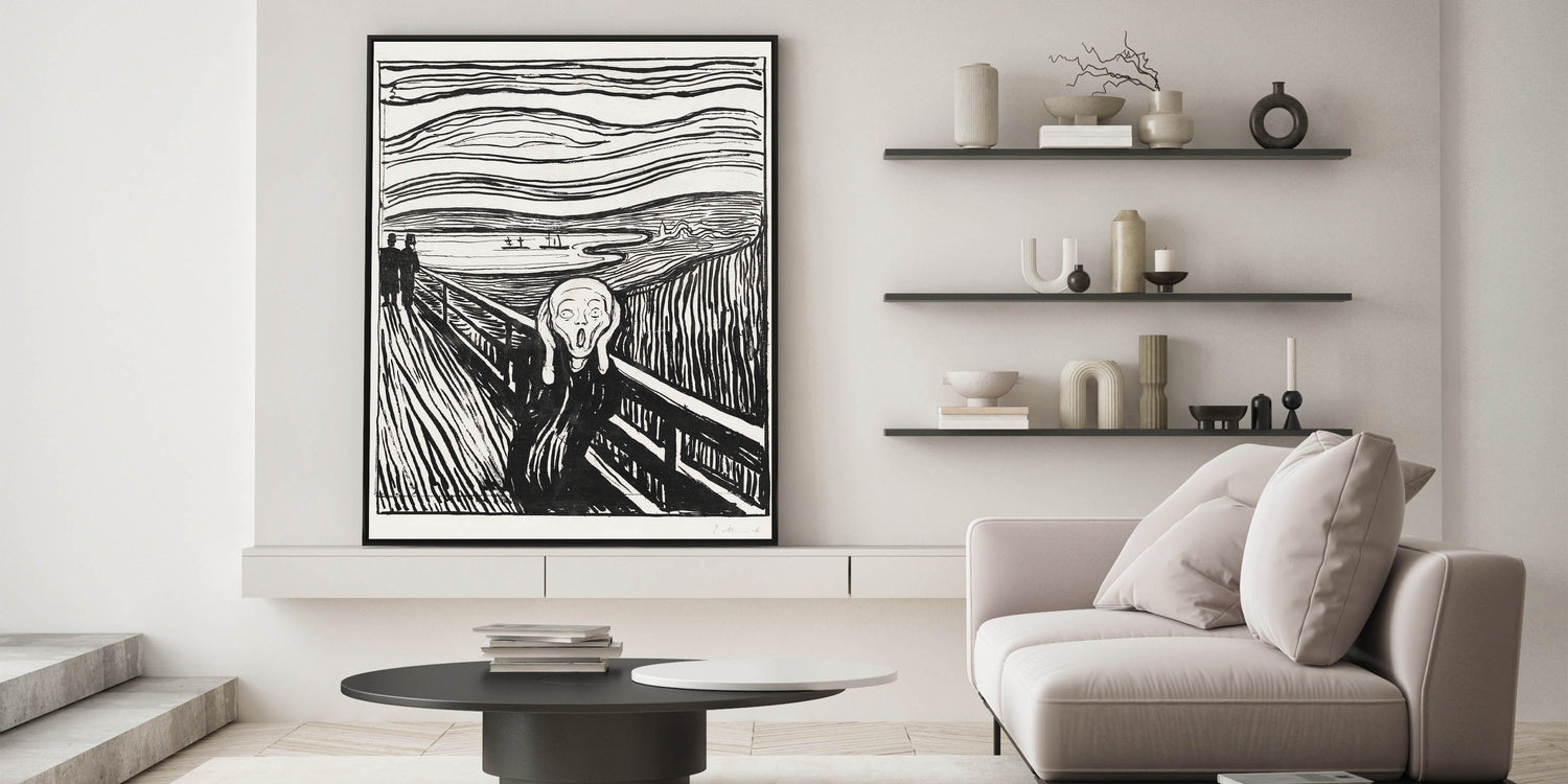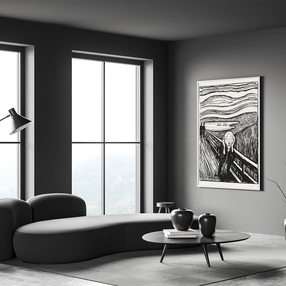 Own a piece of art history with Edvard Munch's "The Scream, a timeless Expressionist masterpiece from 1895. This black-and-white woodcut version of Munch’s iconic artwork captures the raw emotion and existential angst that has resonated with audiences for over a century. The bold, undulating lines of the sky and landscape create a sense of chaos and despair, perfectly framing the central figure’s haunting expression. The Scream" is not just an artwork—it’s a universal symbol of human emotion and a powerful centerpiece for any collection.