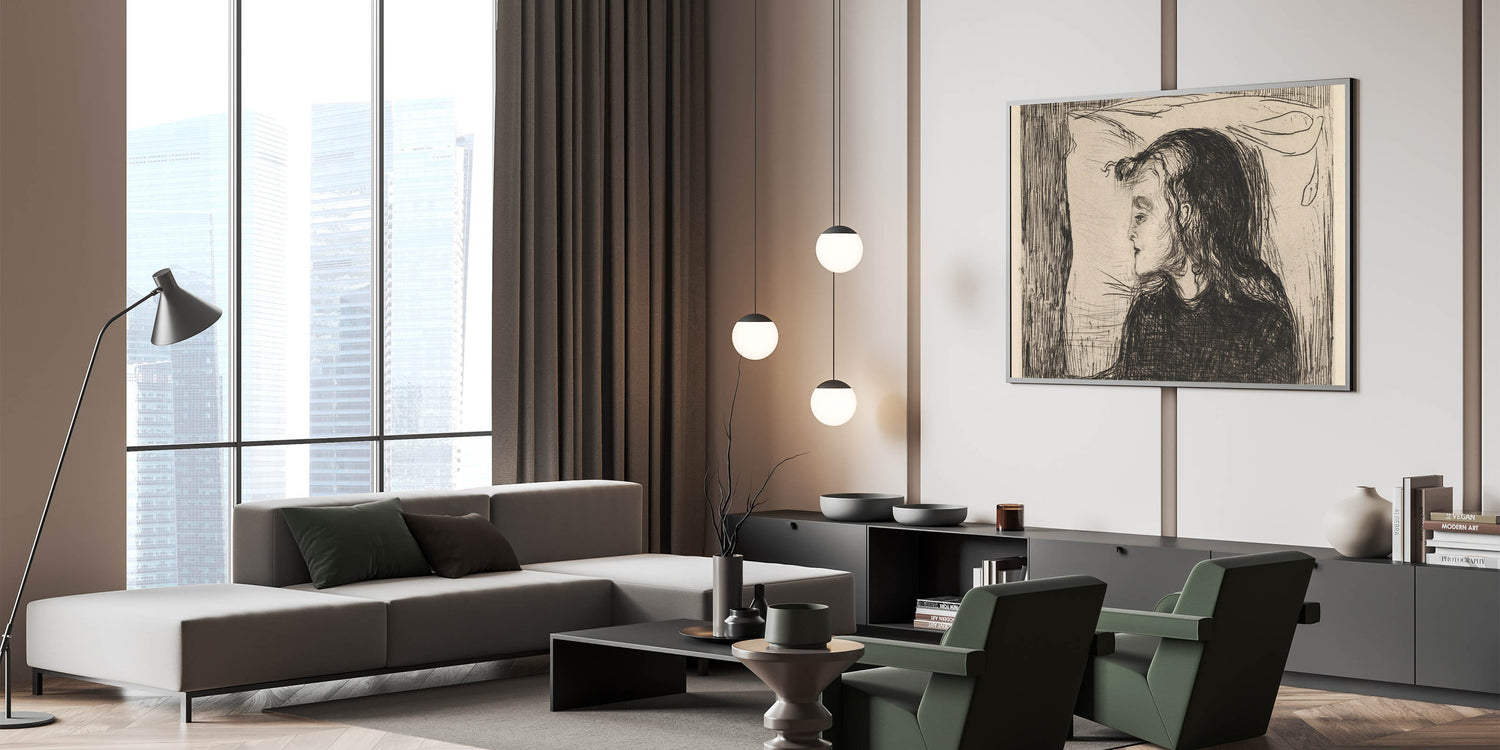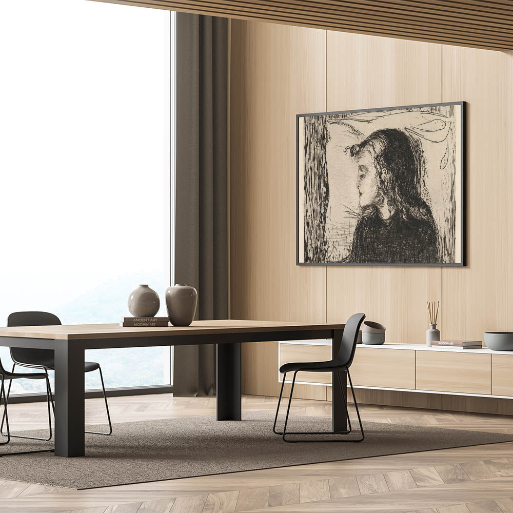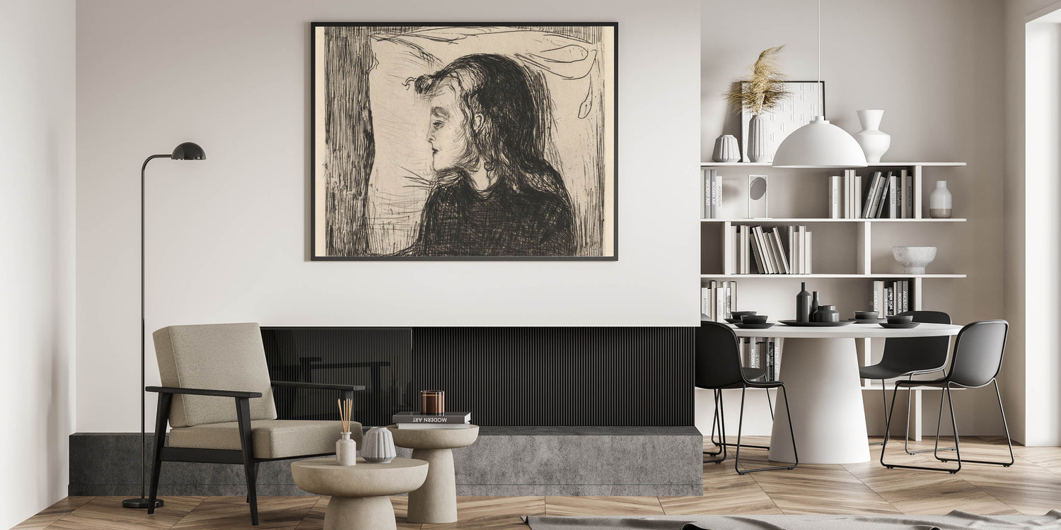 Discover the haunting beauty of Edvard Munch’s "The Sick Girl," a deeply moving Expressionist piece from 1896. This monochromatic artwork captures the frailty of life with raw emotion, portraying a young girl resting with delicate yet evocative lines. Munch's sensitive treatment of the subject matter conveys a sense of introspection and vulnerability, making this piece a timeless reflection on human emotion and mortality. The intricate linework and minimalist palette amplify the artwork's emotional depth, creating a striking visual narrative that resonates with audiences across generations.