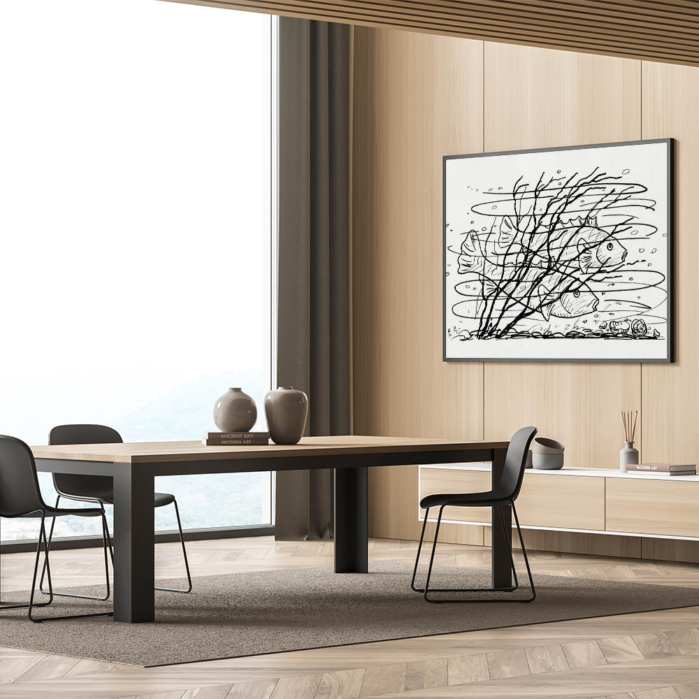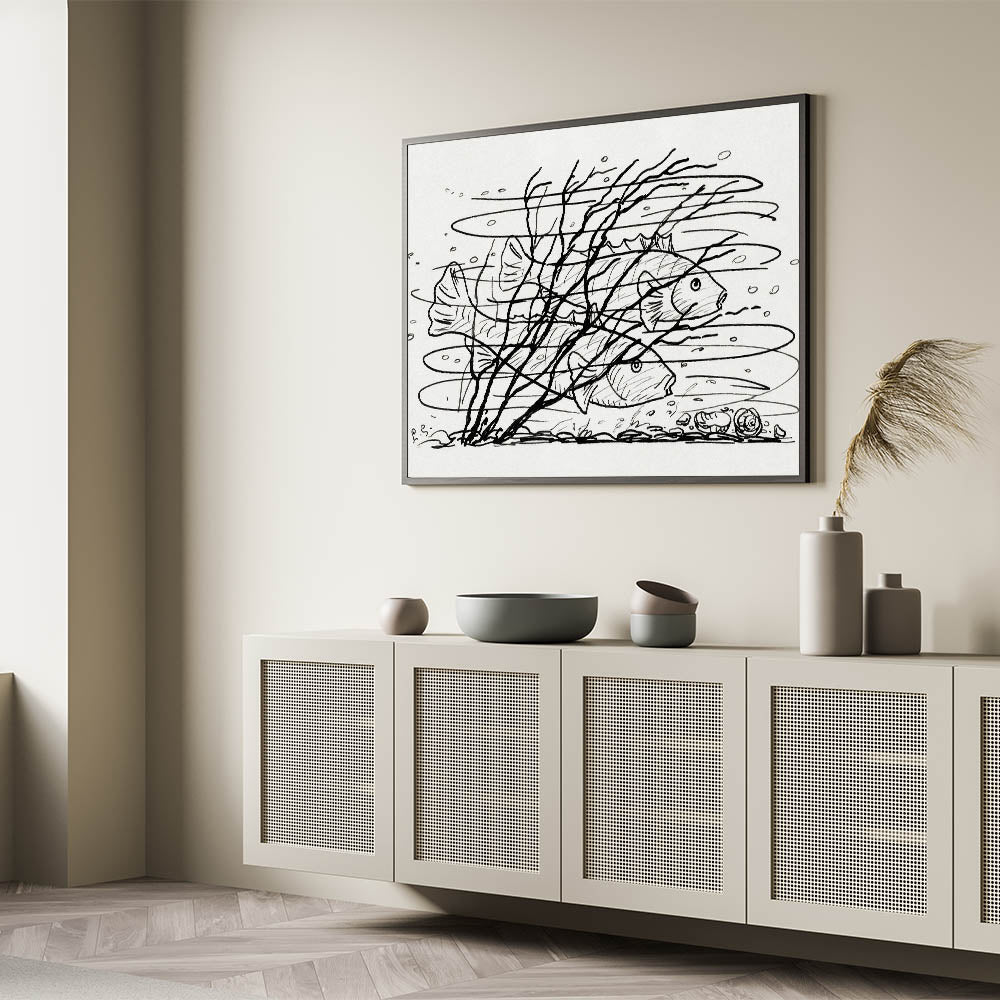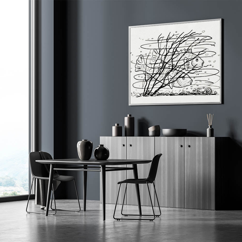 Introduce the elegance of "Two Fish in Water," a stunning piece of Expressionist art that encapsulates movement and depth. This abstract expressionism design captures the harmony of aquatic life with a vibrant play of black ink on a light background, making it an ideal addition to modern and classic interiors alike.