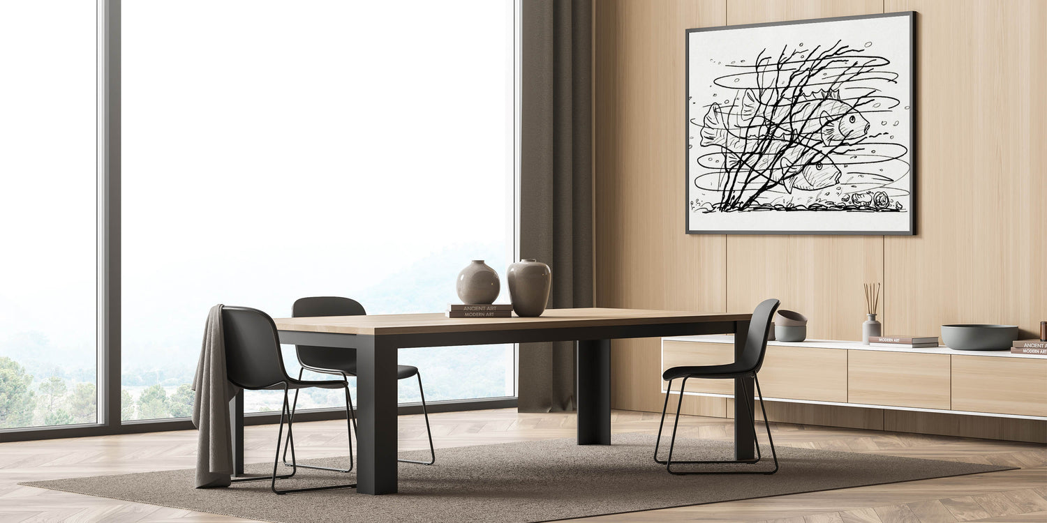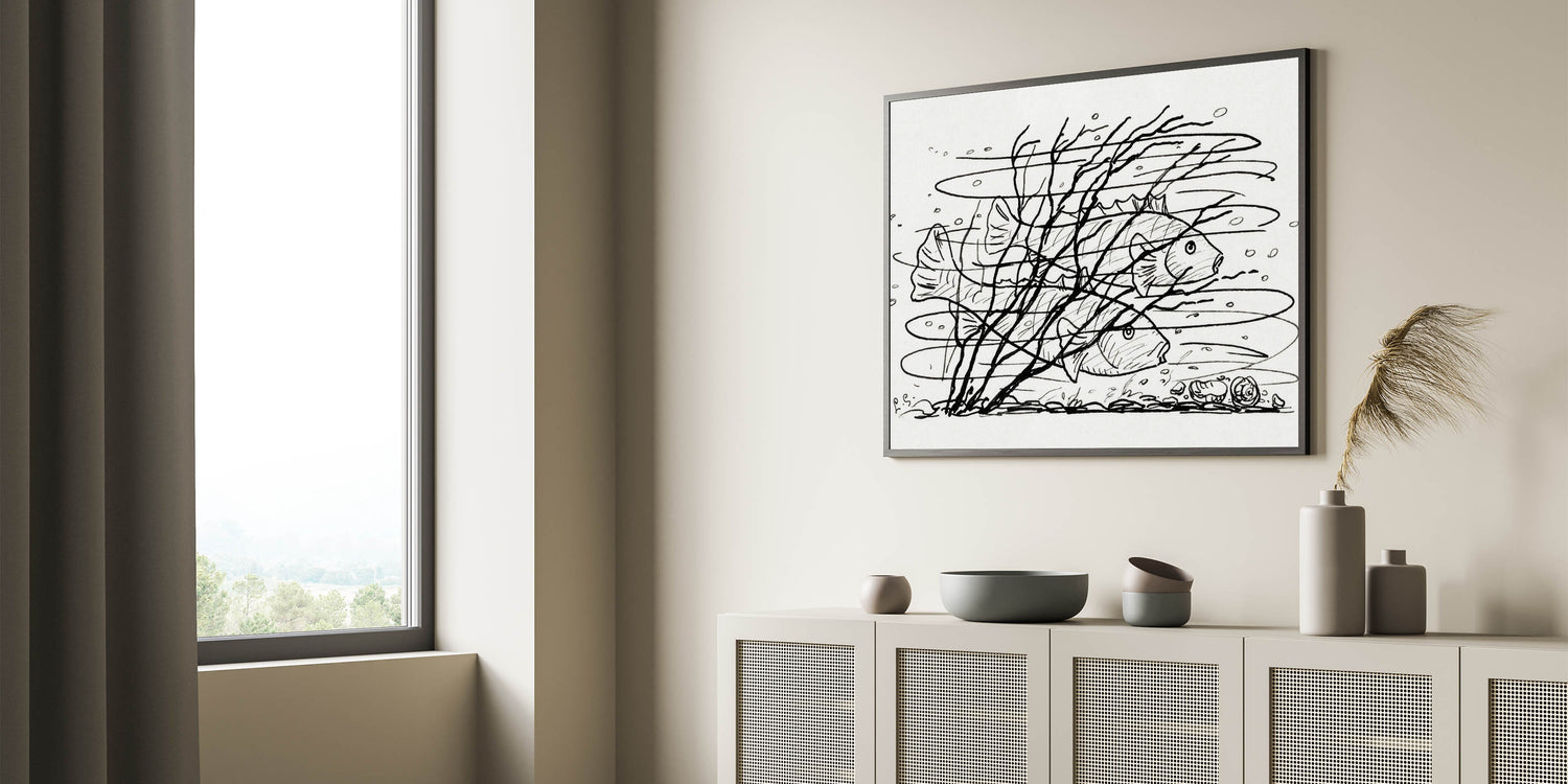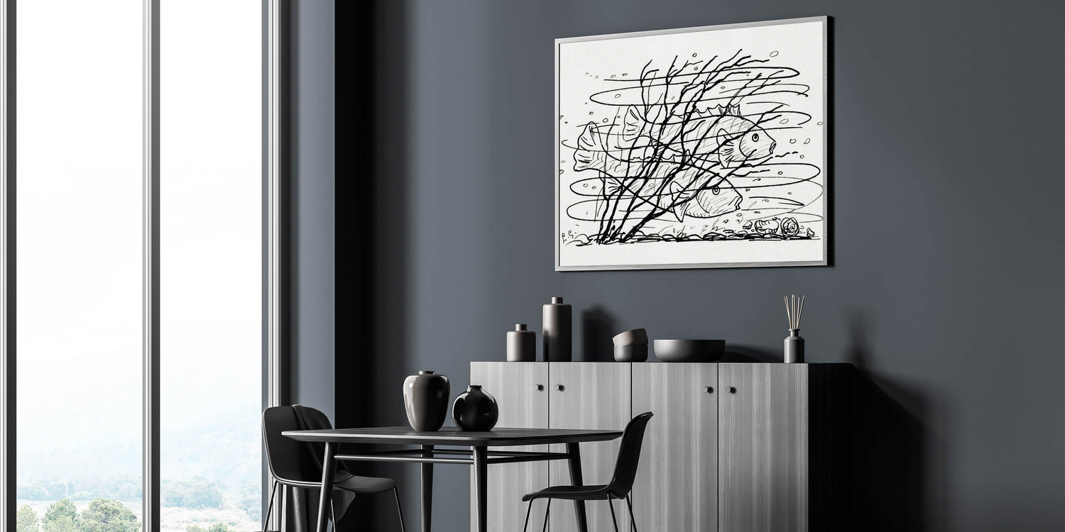 Introduce the elegance of "Two Fish in Water," a stunning piece of Expressionist art that encapsulates movement and depth. This abstract expressionism design captures the harmony of aquatic life with a vibrant play of black ink on a light background, making it an ideal addition to modern and classic interiors alike.