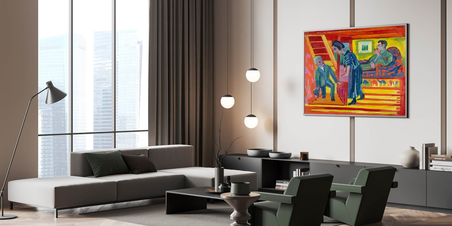 Immerse yourself in the vibrant world of Expressionist art with this stunning depiction of human interaction and emotion. This Expressionist Canvas Print showcases the essence of Modern Expressionism, characterized by bold colors, striking brushstrokes, and a dynamic composition that brings the scene to life.