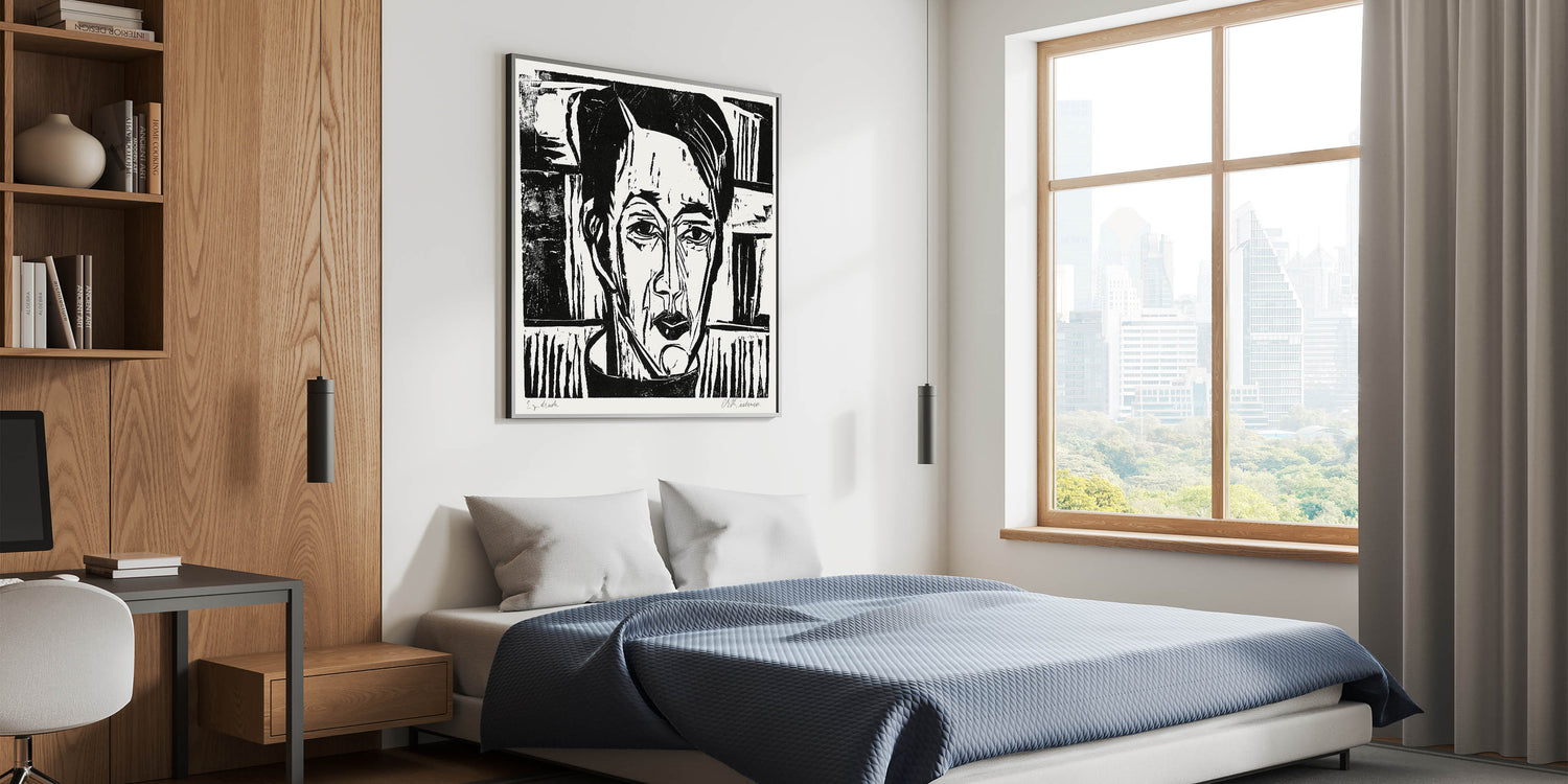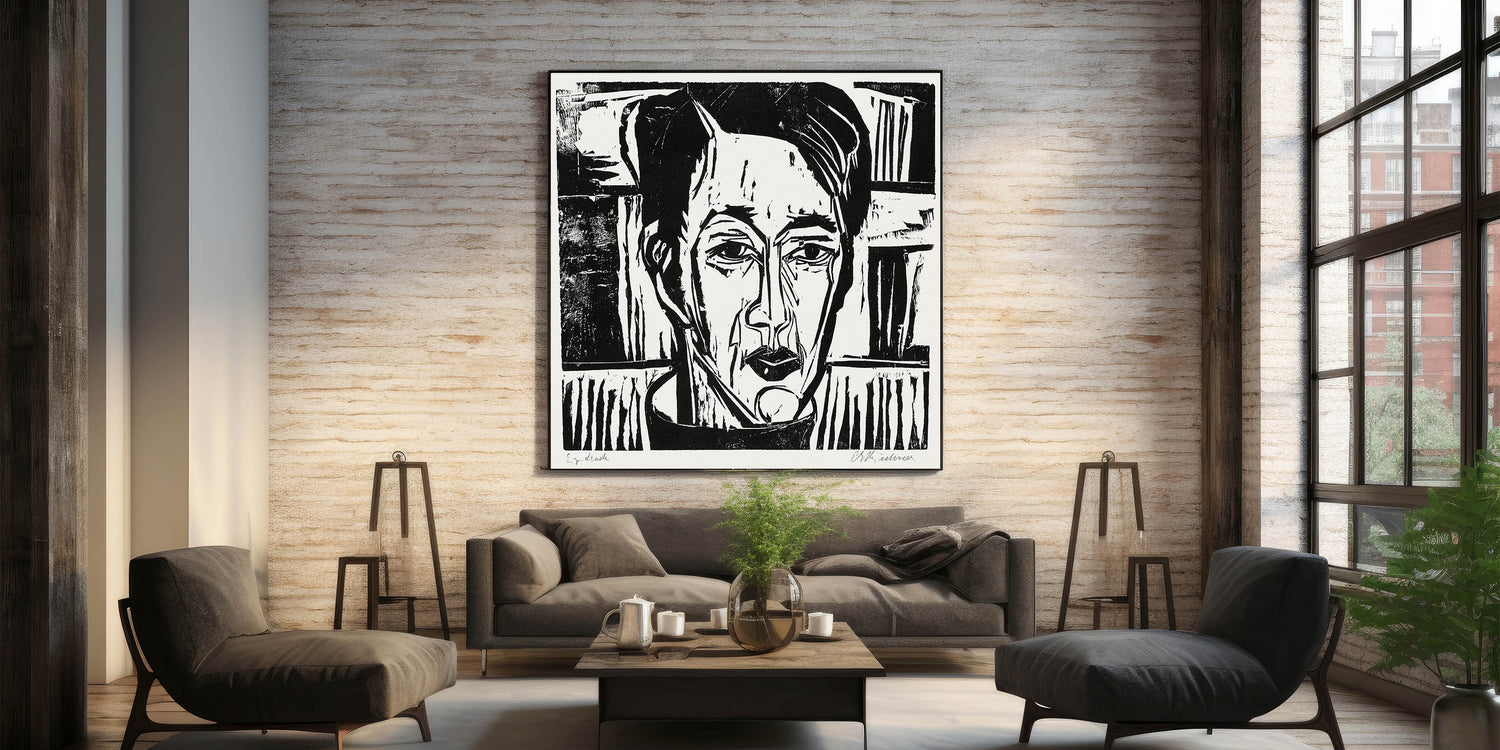 Introduce a striking piece of Expressionist history to your space with "Wehrlin, Facing Front," a bold woodcut print by renowned artist Ernst Ludwig Kirchner. This monochromatic portrait showcases Kirchner’s mastery of sharp lines and dynamic contrasts, capturing the raw intensity and emotional depth characteristic of Expressionism. The interplay of light and shadow in this artwork creates a compelling visual narrative, making it a centerpiece for modern and classic interiors alike.