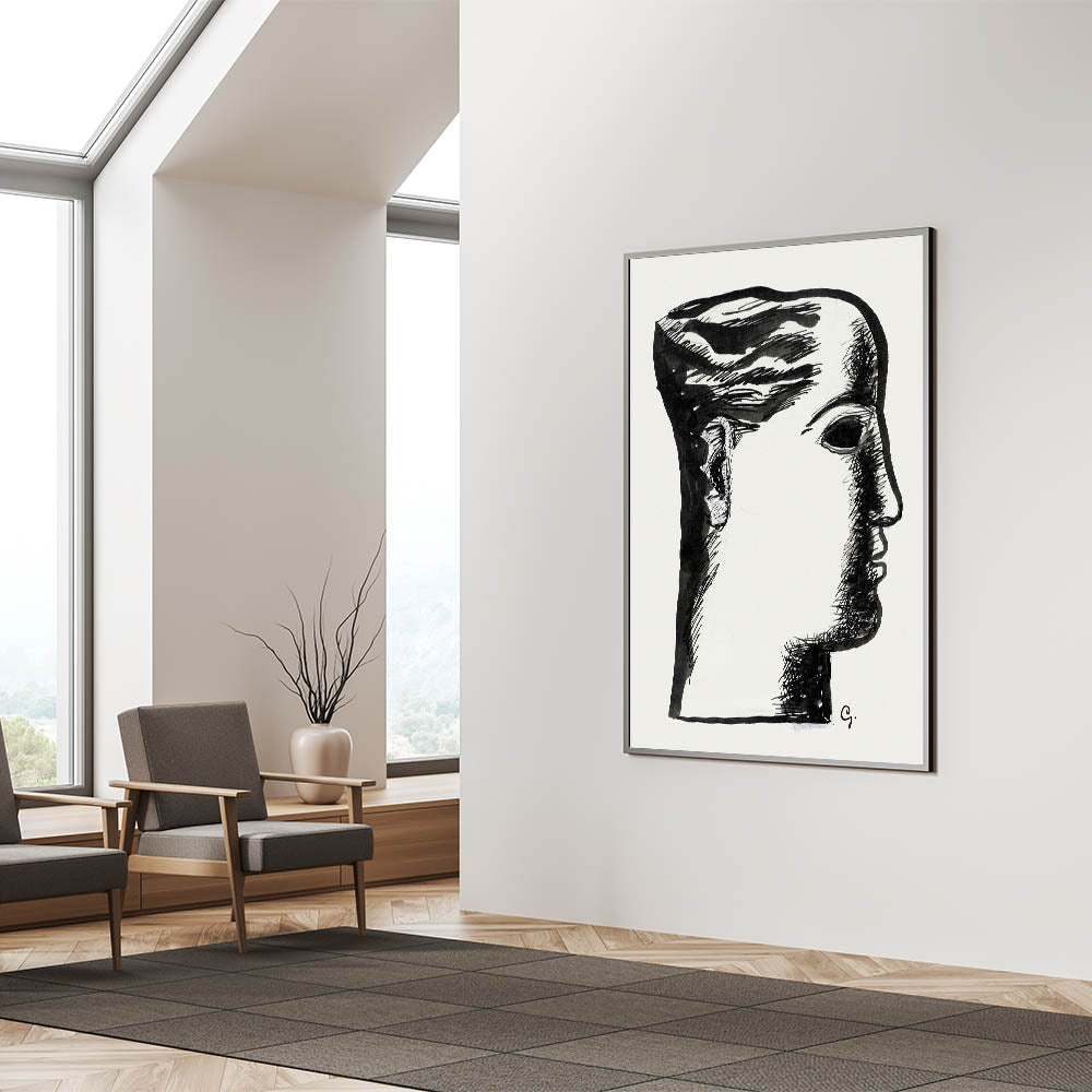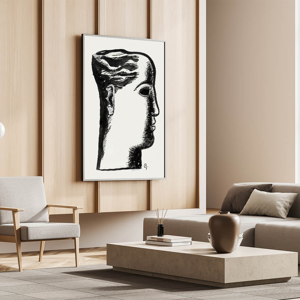 Elevate your decor with "Woman's Head," a striking profile portrait by the renowned Expressionist artist Leo Gestel. This bold ink drawing captures the elegance and strength of the female figure, rendered in dynamic black strokes that emphasize contrast and depth. The minimalist yet impactful design reflects the raw emotion and creativity central to the Expressionism movement.