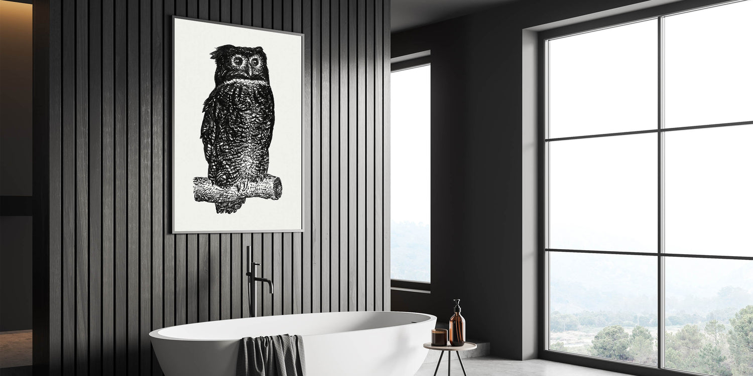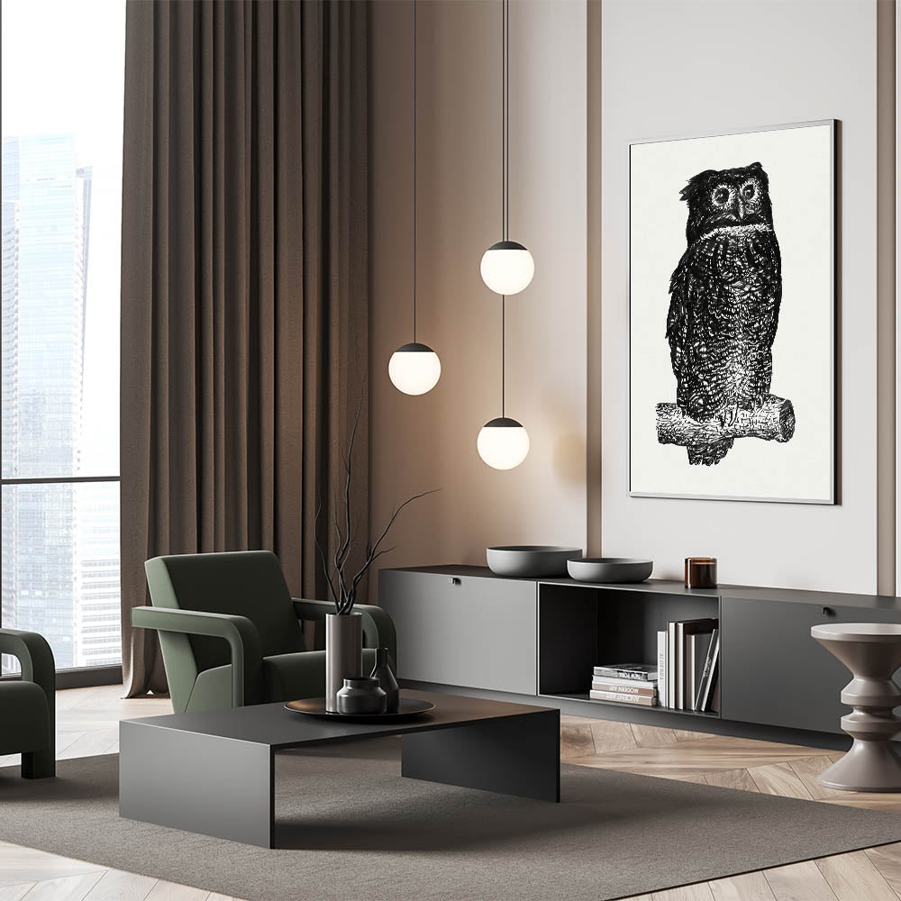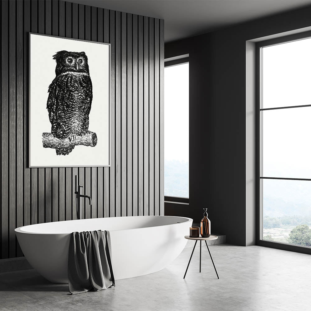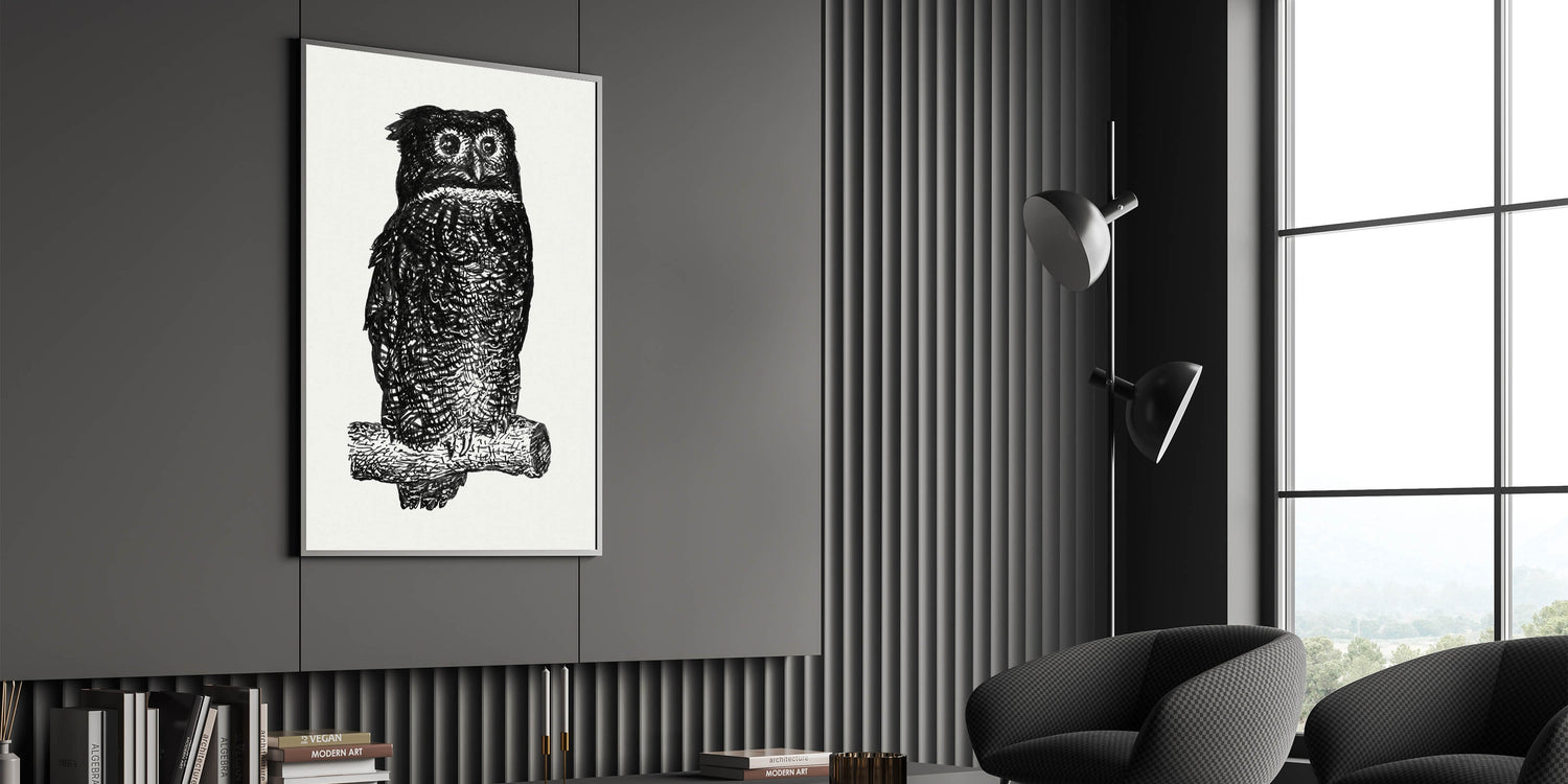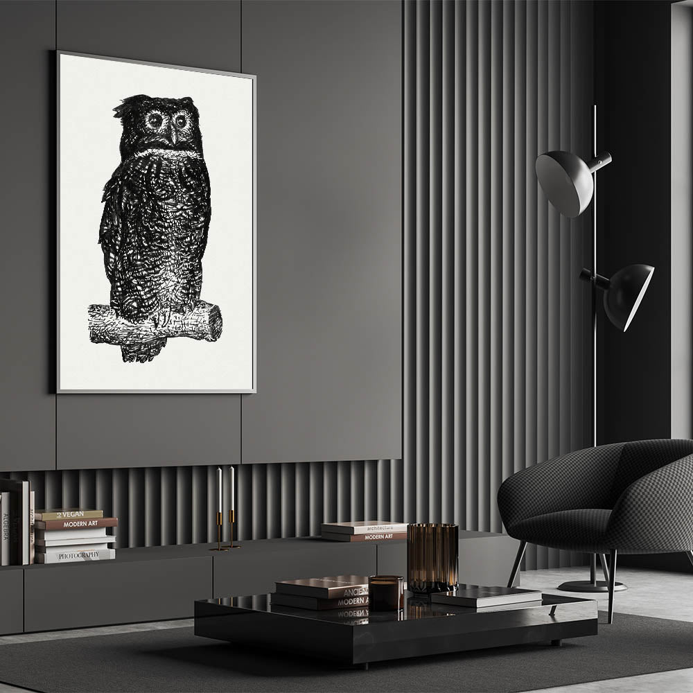 - Striking Monochrome Design: The sharp contrasts of black and white emphasize the owl’s intricate details and textured composition.