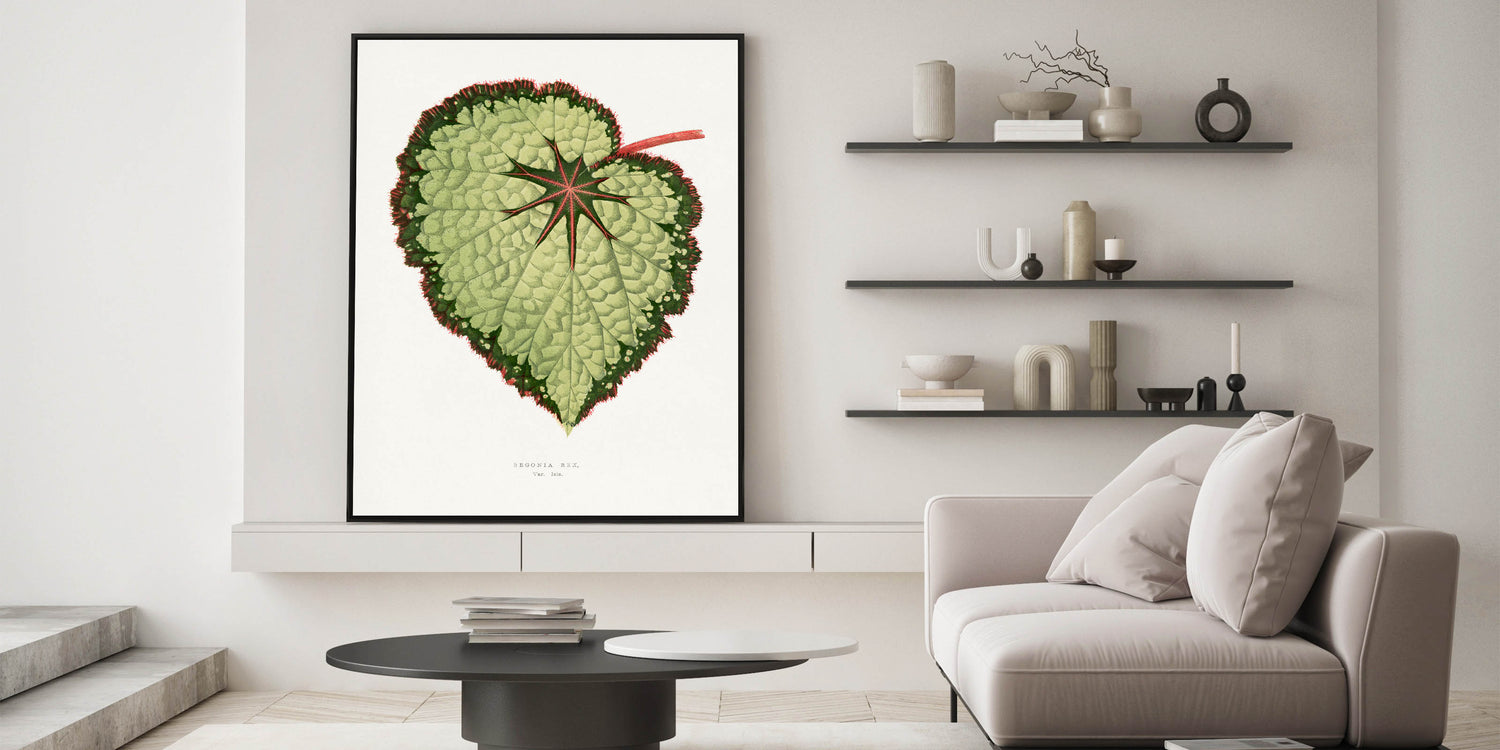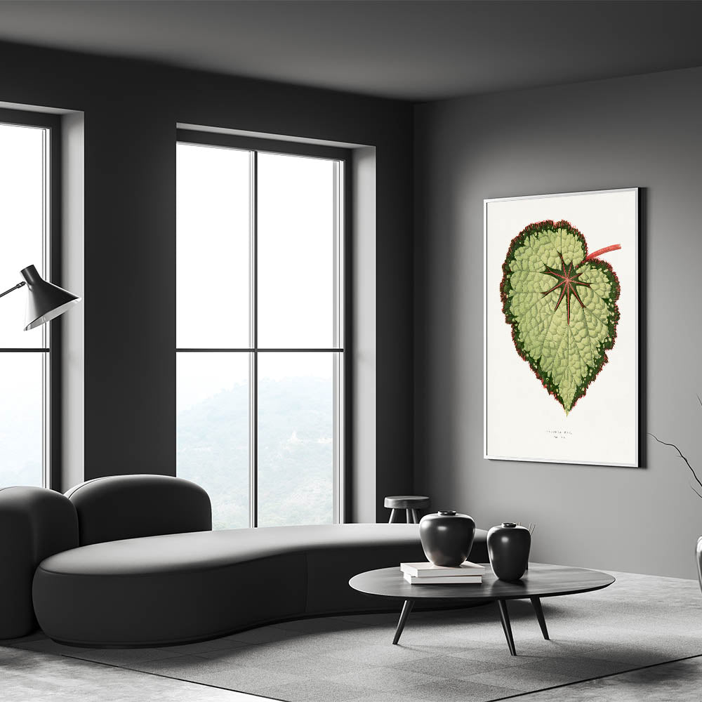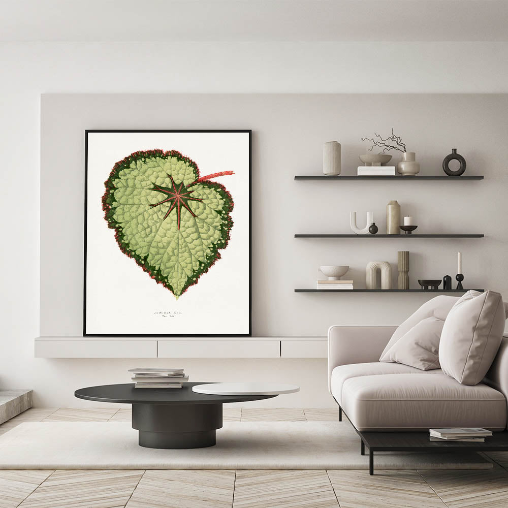 Transform your living space with this stunning "Green Begonia Rex" illustration, a masterpiece inspired by the Romanticism art movement. This intricate depiction of the begonia leaf features vibrant shades of green, complemented by red highlights, embodying the timeless appeal of Romantic art prints. Perfect for art collectors and nature enthusiasts alike, this piece captures the essence of classic Romantic paintings and the emotional connection to natural beauty.