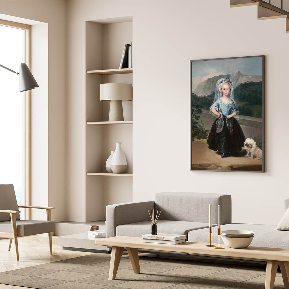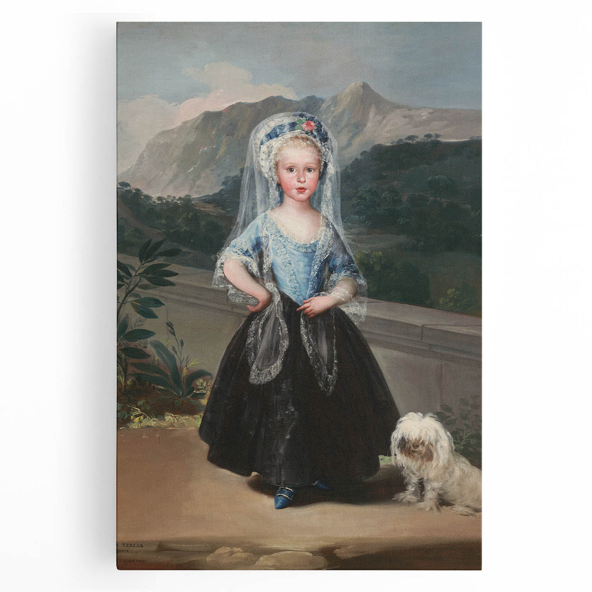 This stunning portrait of María Teresa de Borbón y Vallabriga, painted by Francisco de Goya, is a masterpiece of Romanticism art. The artwork captures the grace and poise of the young countess, standing against a lush mountainous backdrop, with an elegant blend of soft textures and vibrant colors. The attention to detail in her lace-trimmed gown, delicate veil, and the charming inclusion of her small dog evokes a sense of timeless refinement and aristocratic elegance.