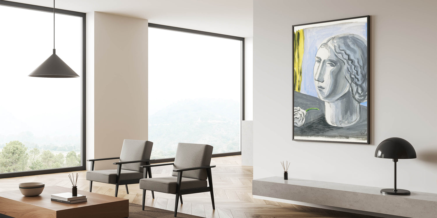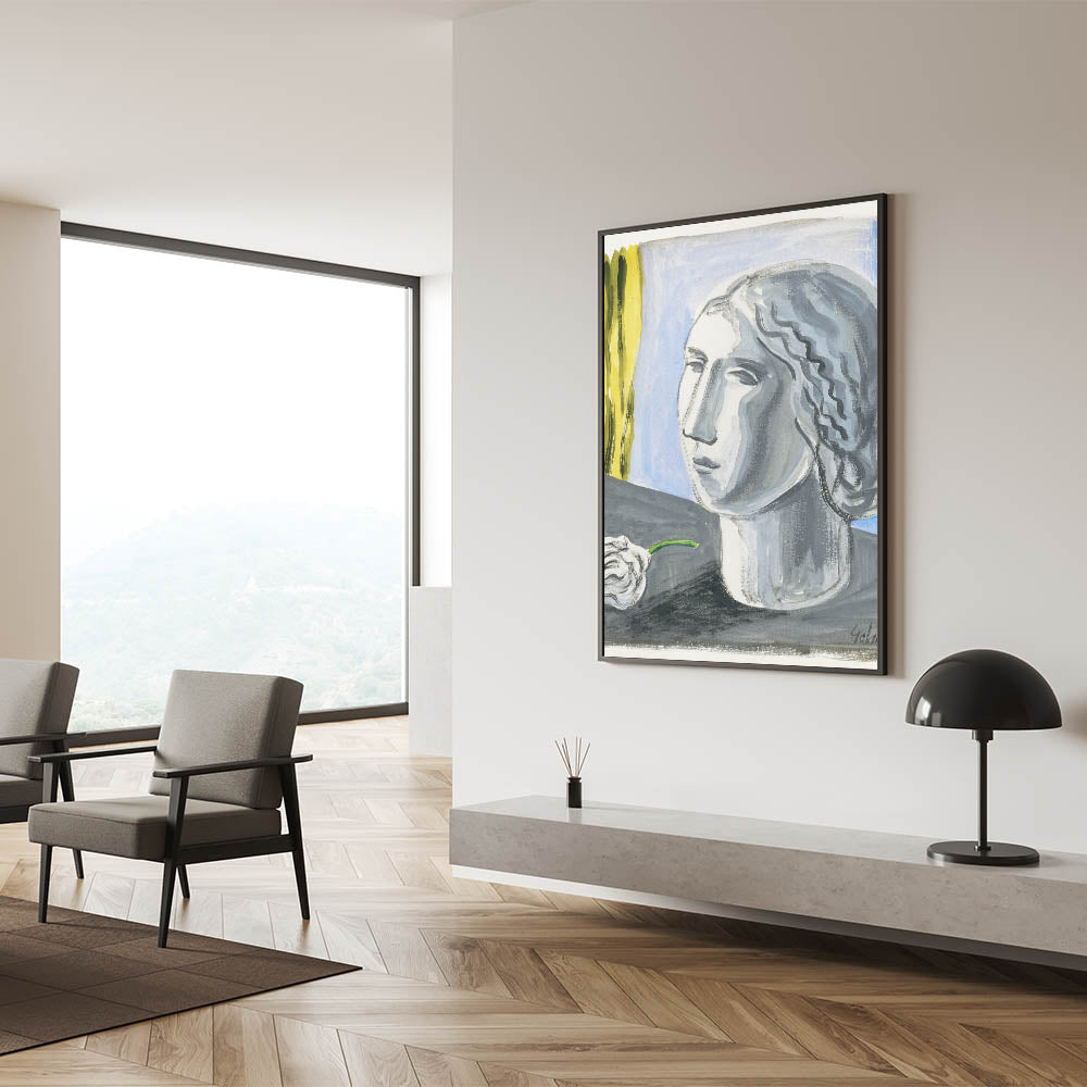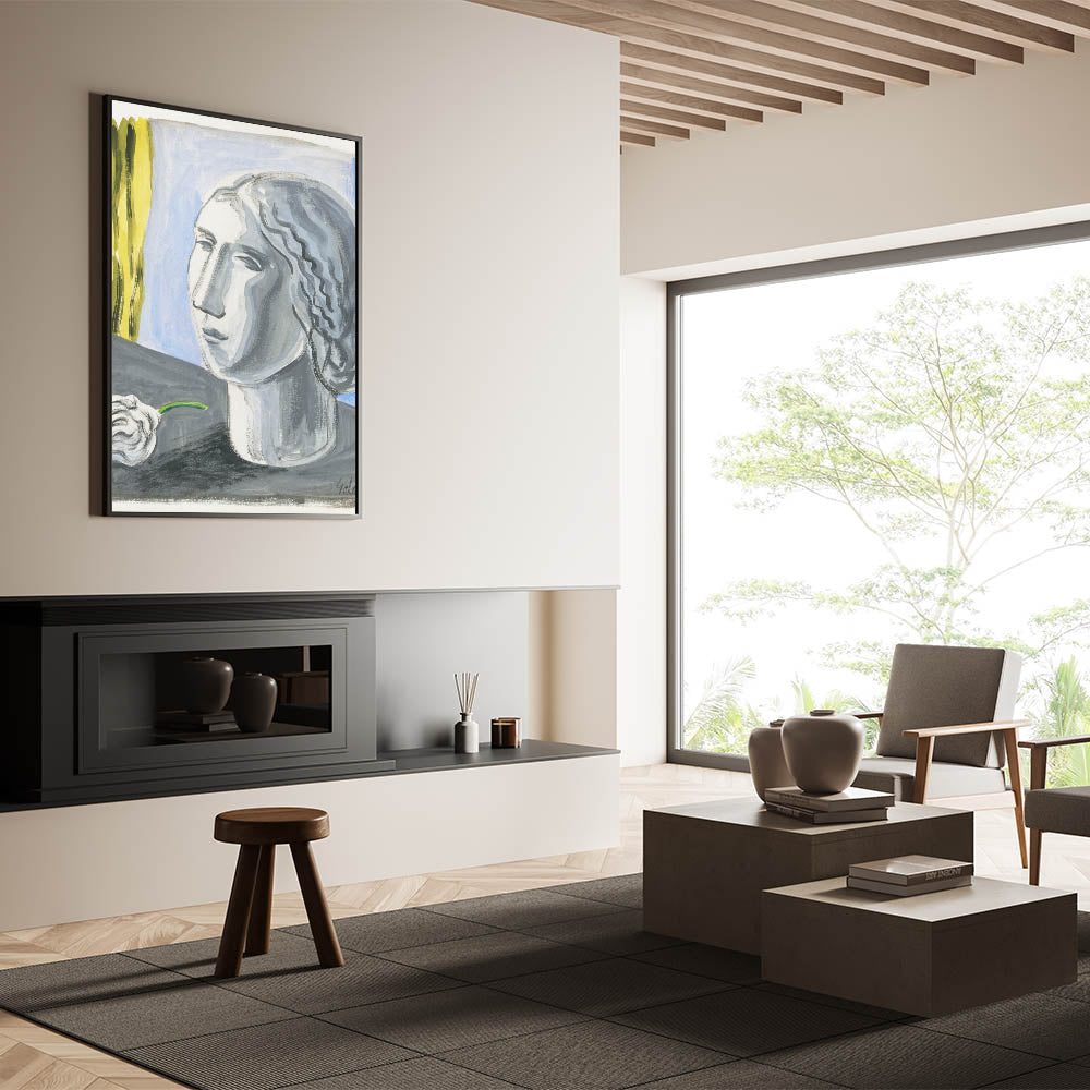 - Design: A stunning monochrome portrait with contrasting yellow and blue elements for modern interiors.