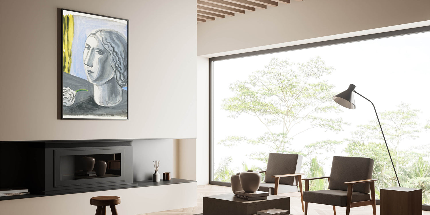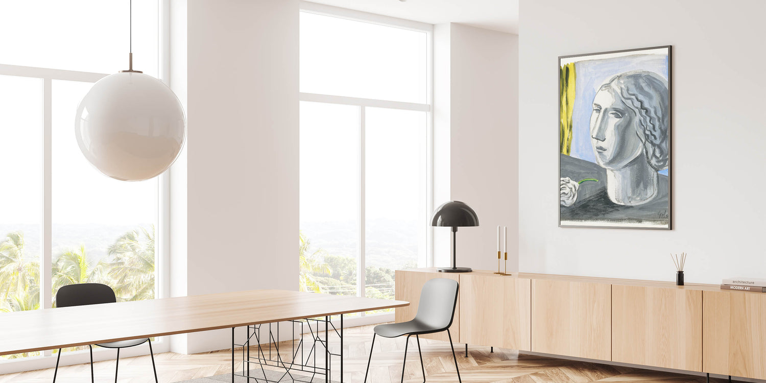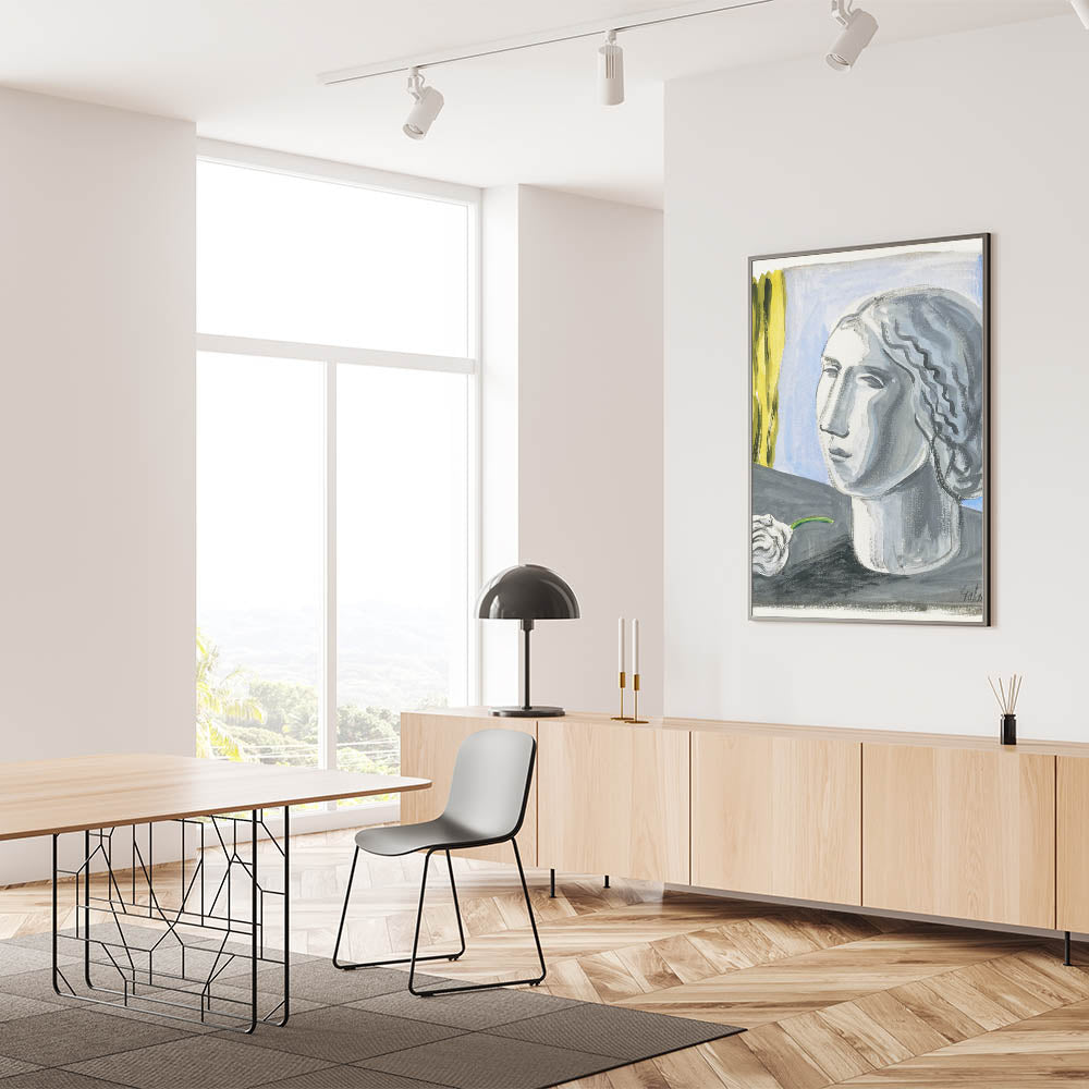 - Design: A stunning monochrome portrait with contrasting yellow and blue elements for modern interiors.