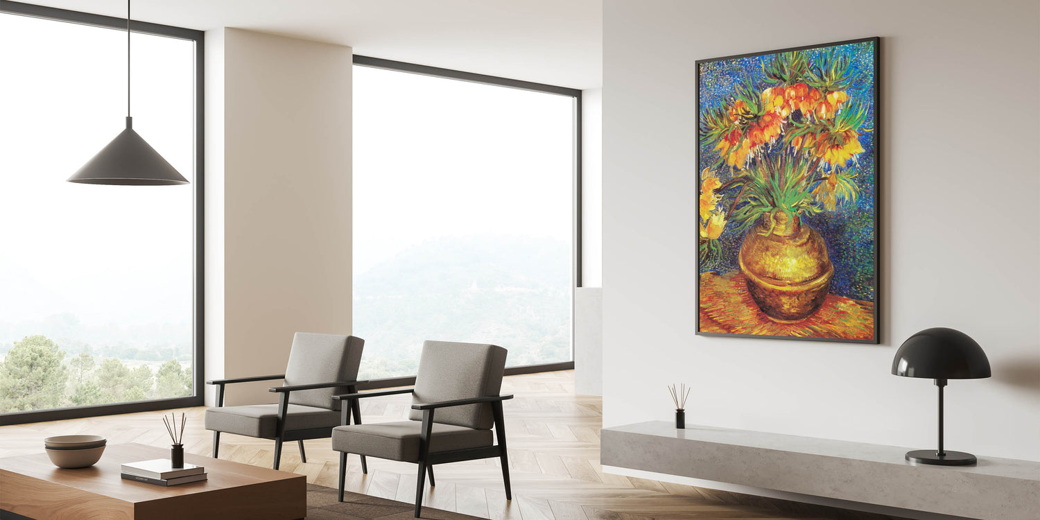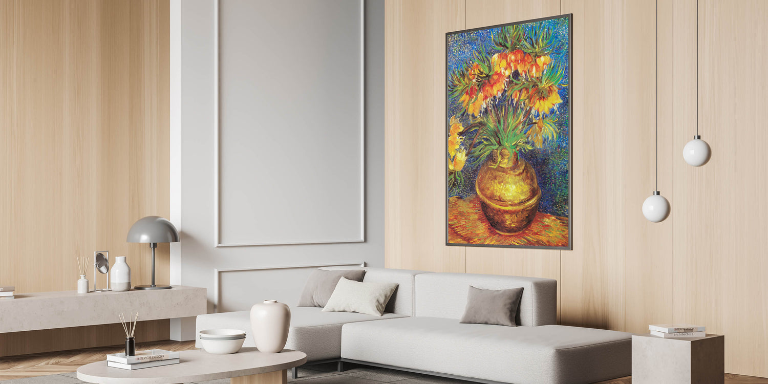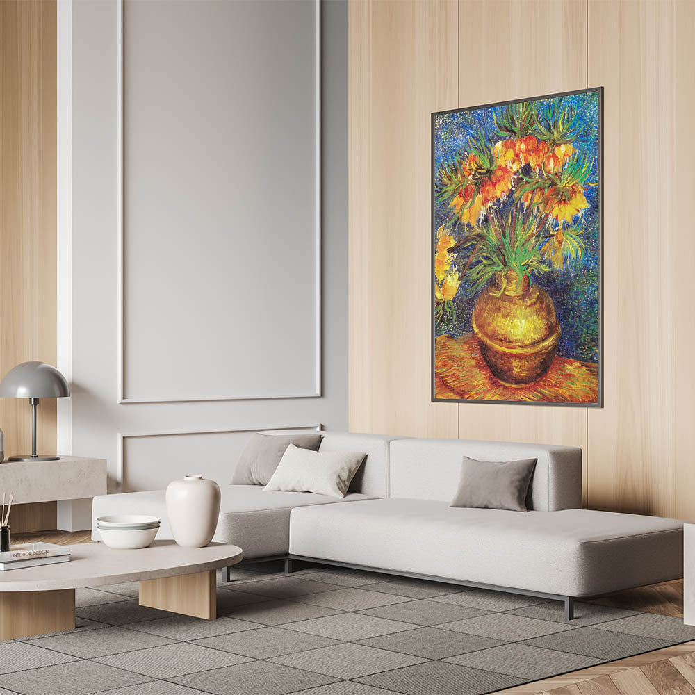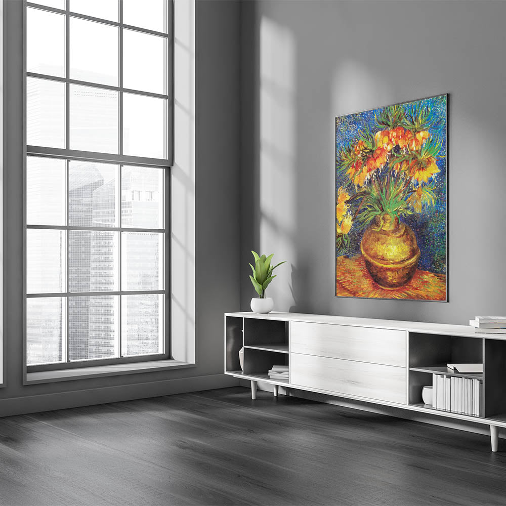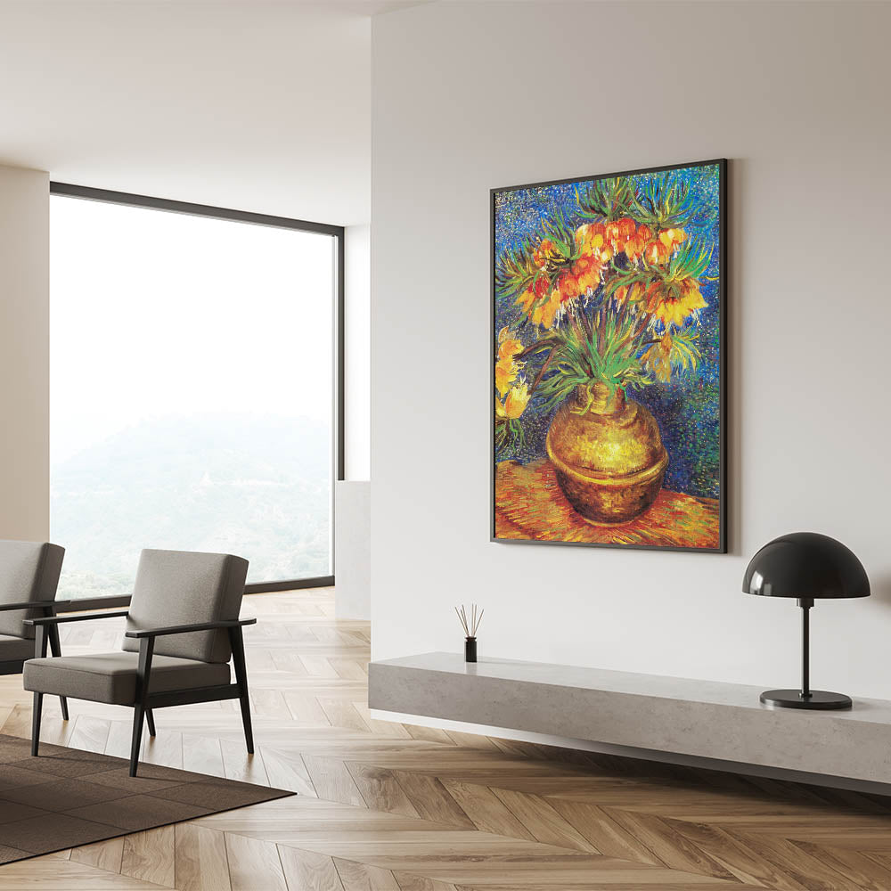 Brighten your space with the vivid beauty of Vincent van Gogh's "Imperial Fritillaries in a Copper Vase." This iconic painting captures the bold and expressive style of Impressionism, featuring vibrant orange and yellow fritillaries in a glowing copper vase, set against a dazzling blue background.