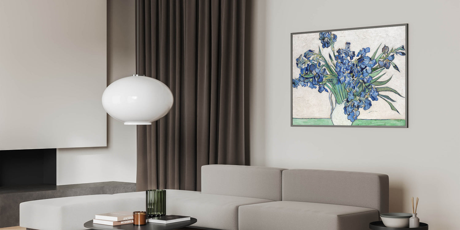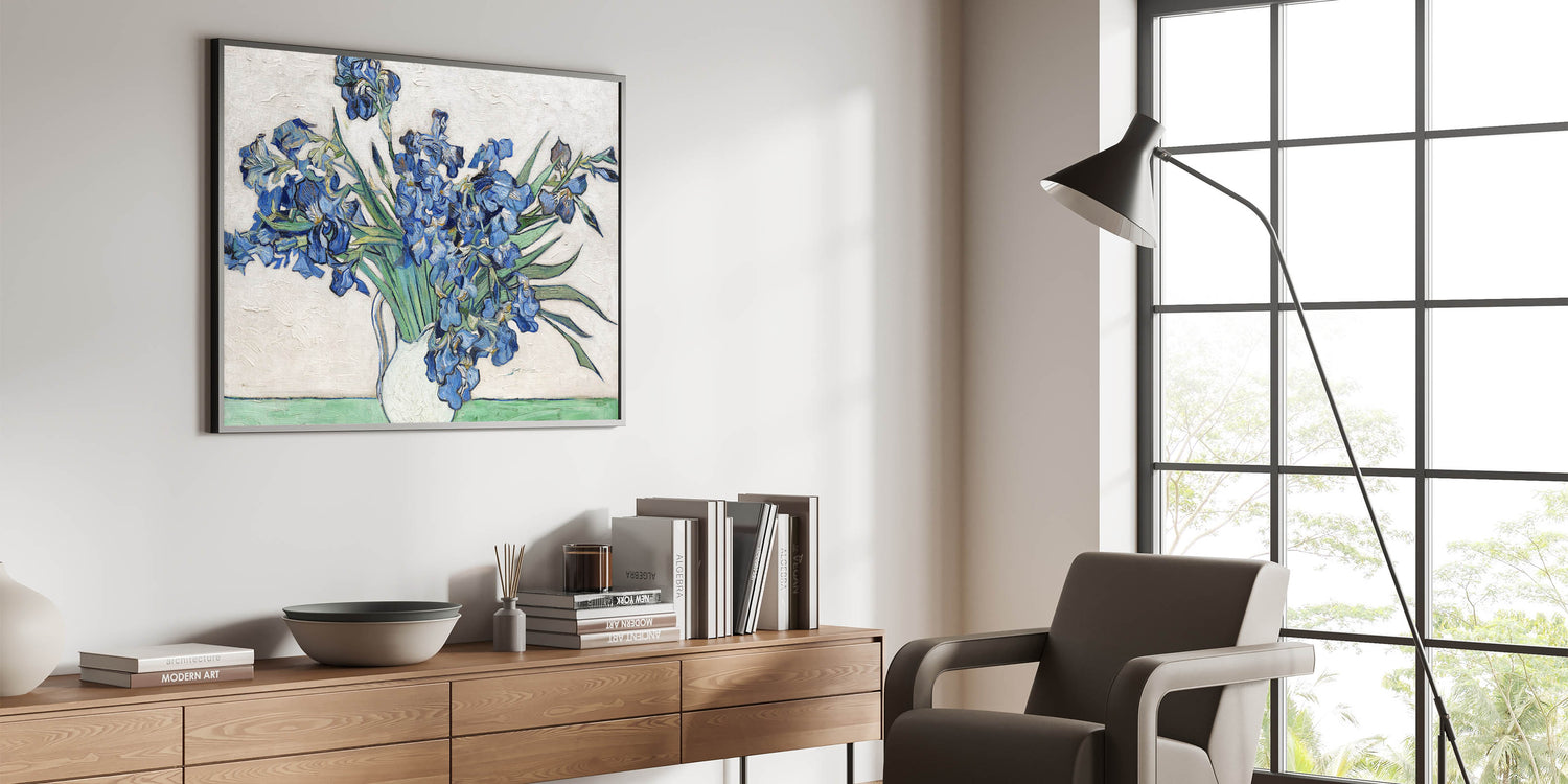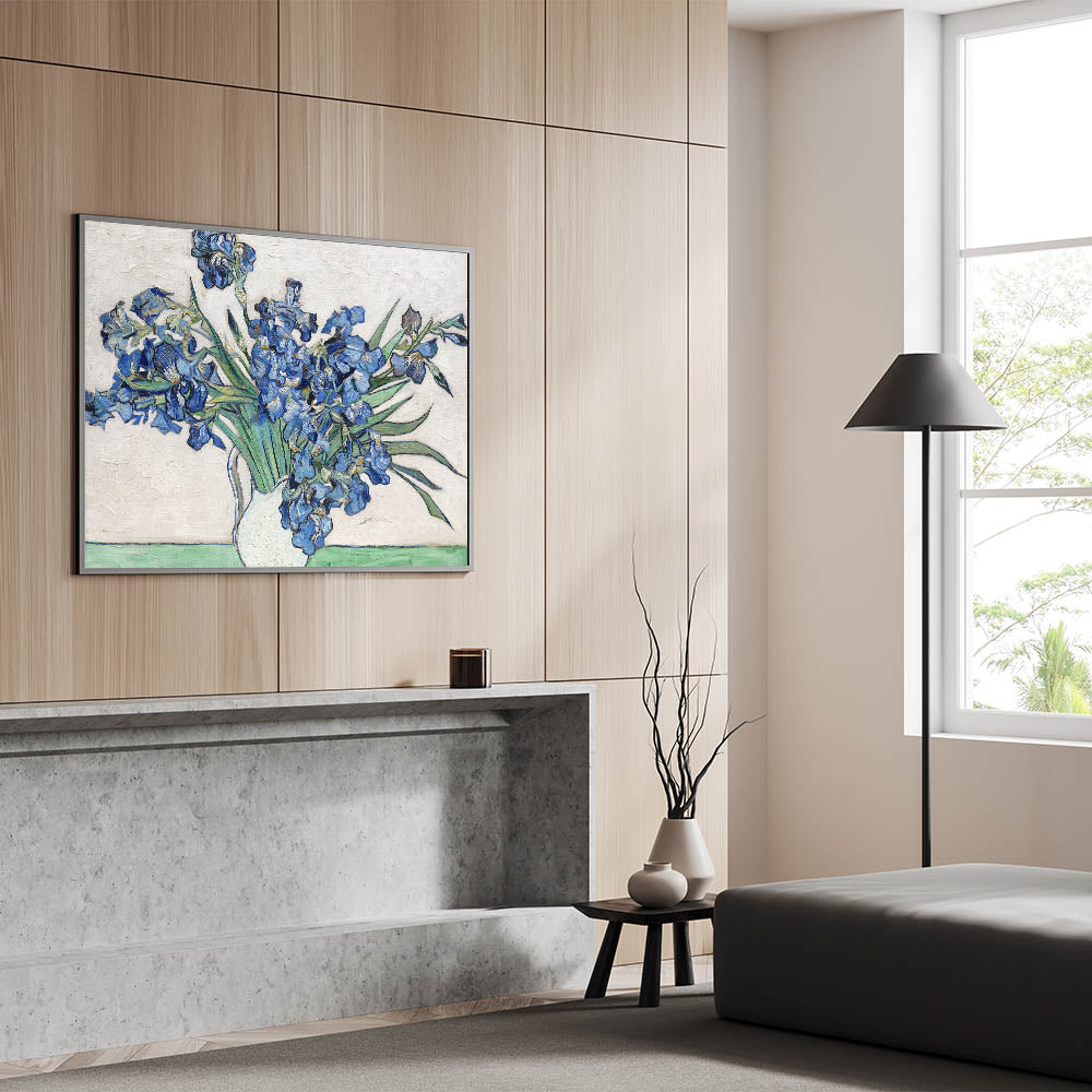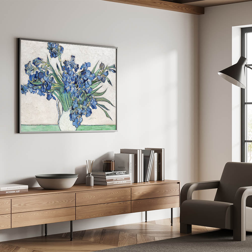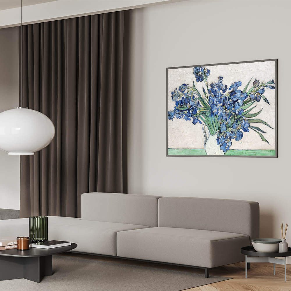 Elevate your space with the serene beauty of Vincent van Gogh's Vase of Irises (1890). This Impressionism wall art presents a vibrant bouquet of deep blue irises set in a simple white vase, contrasting beautifully with the muted background and soft green tabletop. The delicate details of each petal and leaf, combined with Van Gogh’s bold brushstrokes, create a harmonious and elegant composition.