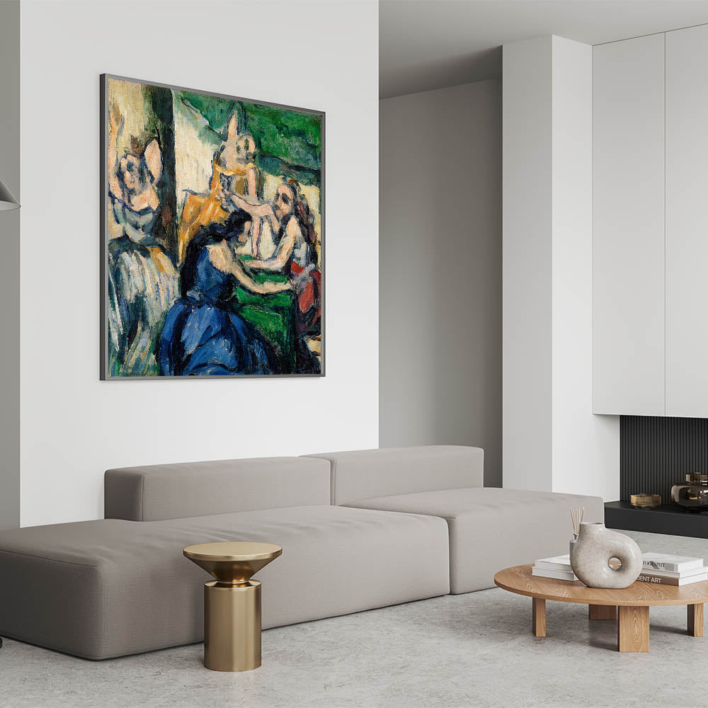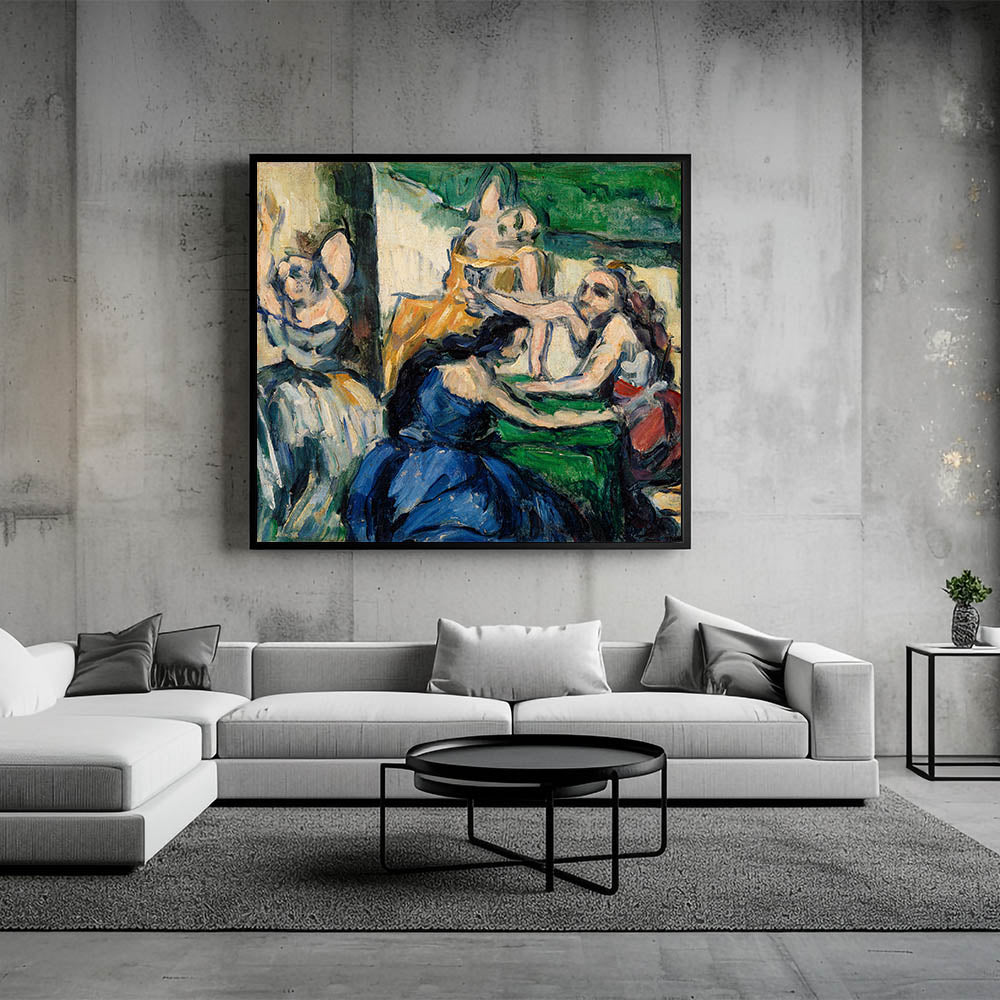 Add a striking piece of art history to your collection with this vivid Impressionist wall art by Paul Cézanne. Titled "The Courtesans," this painting showcases Cézanne's bold brushstrokes and dramatic use of color to capture an intimate and expressive scene. The interplay of deep blues, greens, and warm tones creates a compelling visual experience that evokes both emotion and movement.