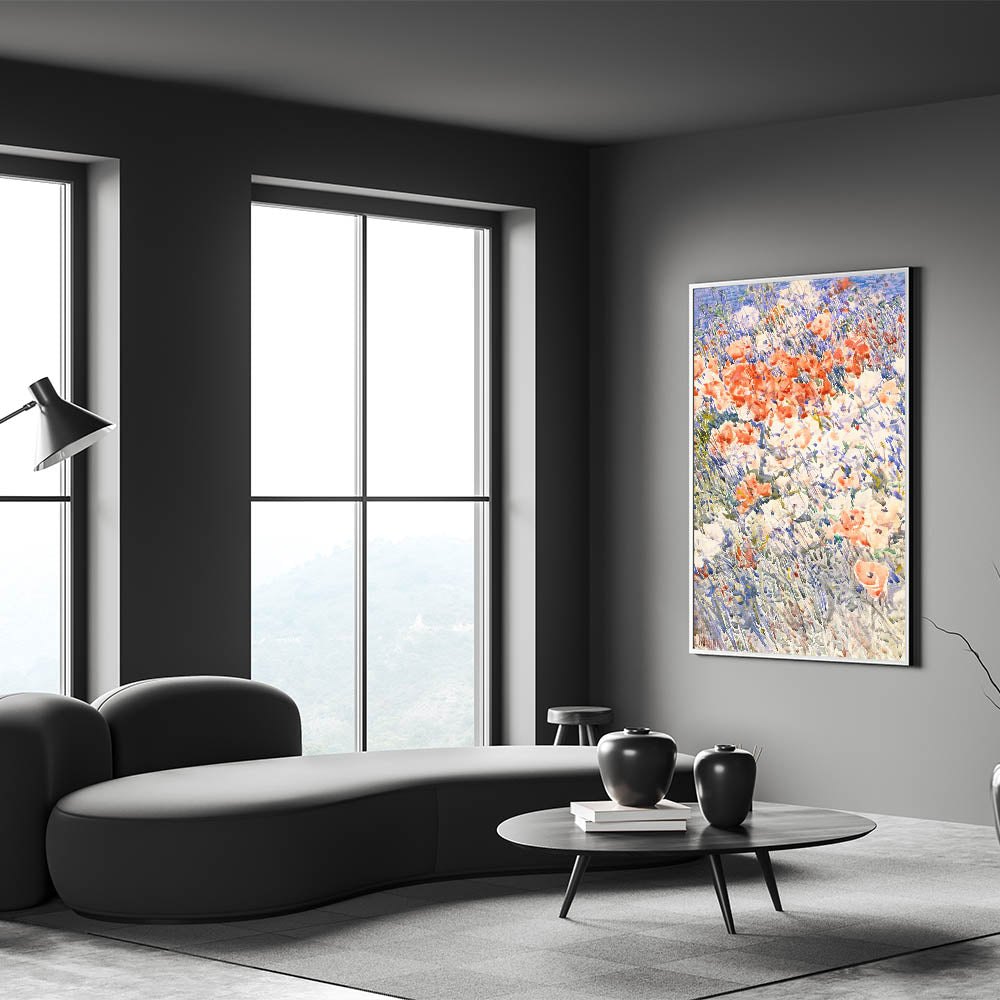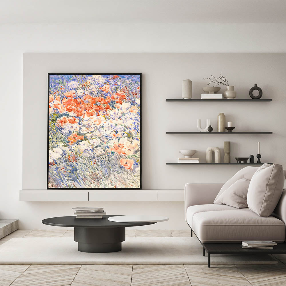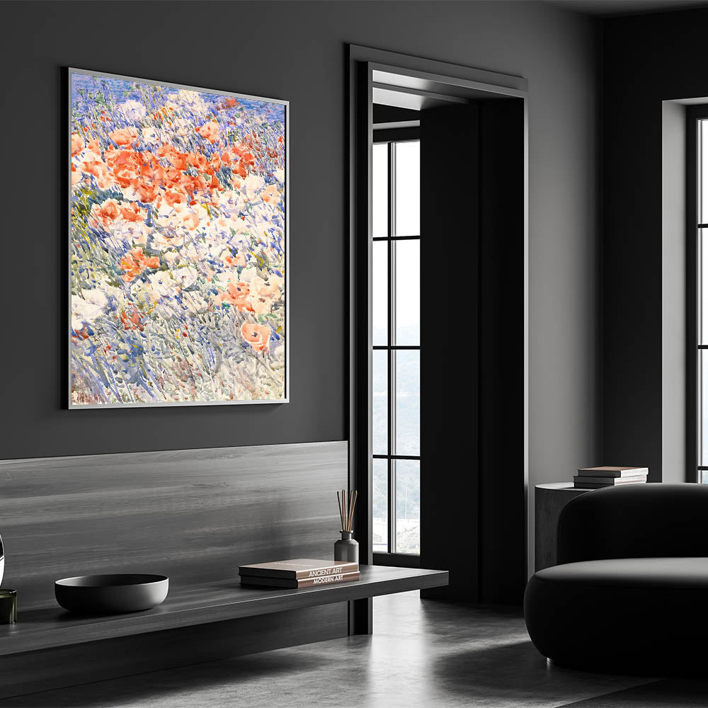 Brighten your home with "The Island Garden" by Childe Hassam, a masterful Impressionist artwork capturing a vibrant floral meadow. The painting's lively composition, featuring blooming flowers in shades of coral, white, and lavender, evokes the essence of a breezy, sunlit garden. Hassam's delicate brushstrokes and harmonious color palette bring this floral paradise to life.