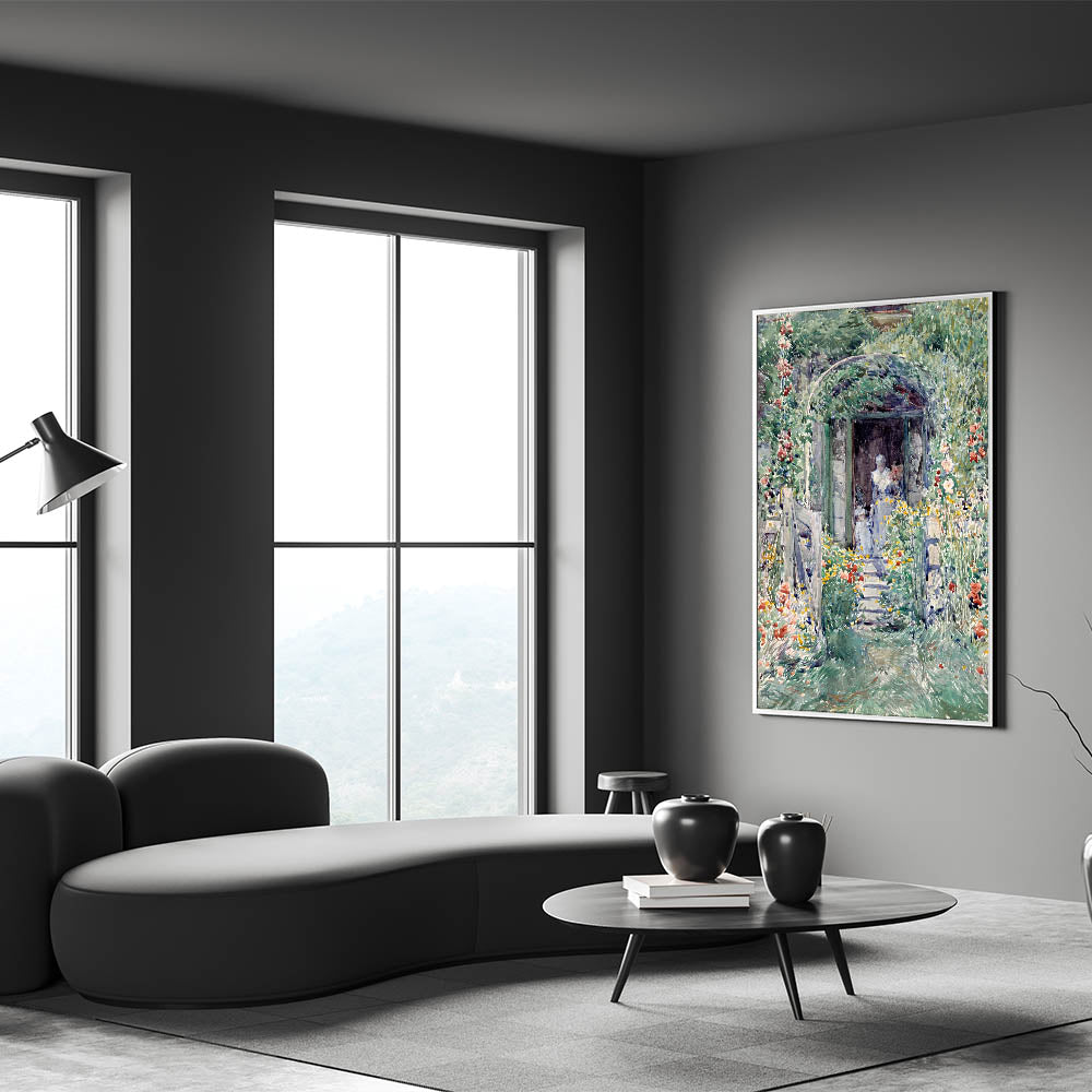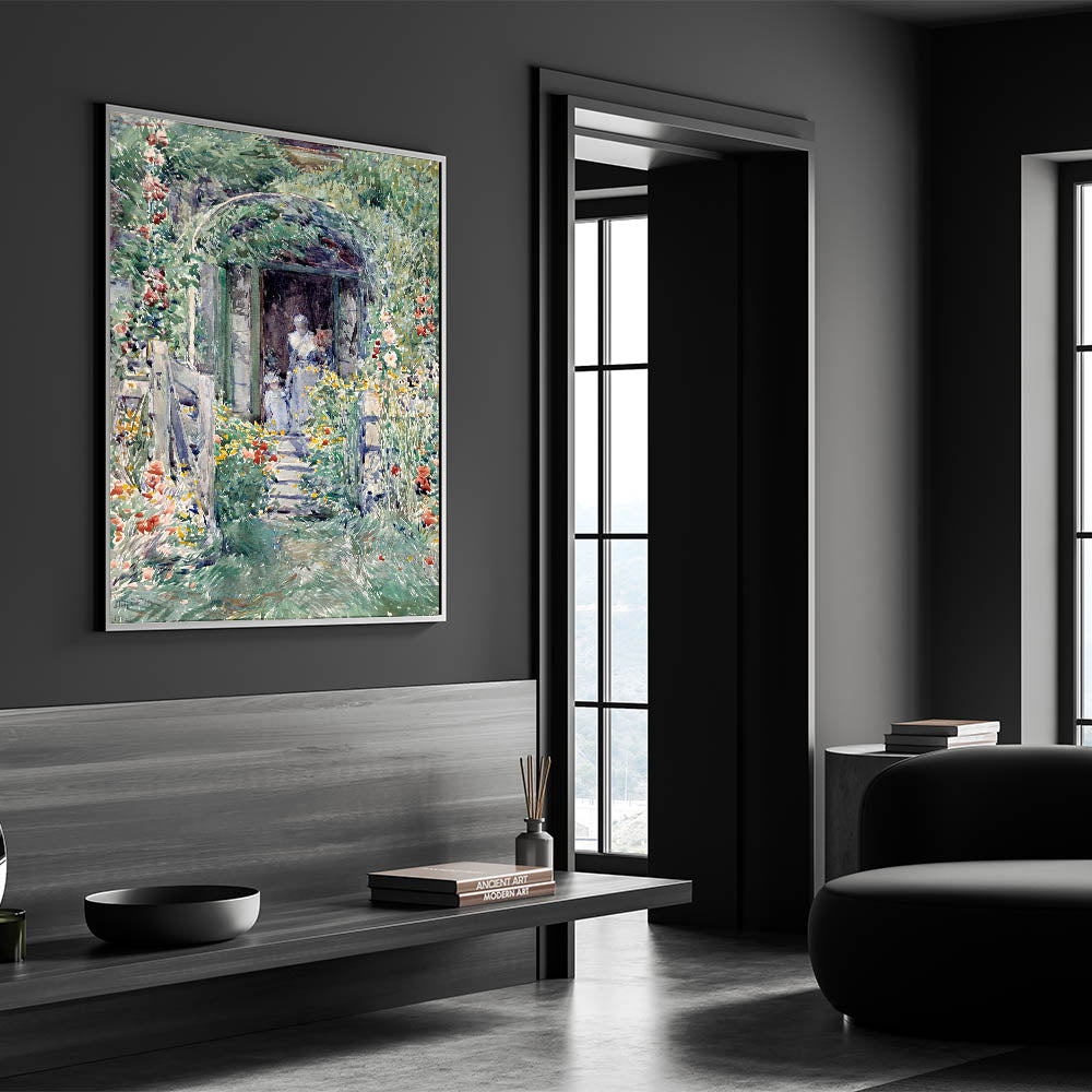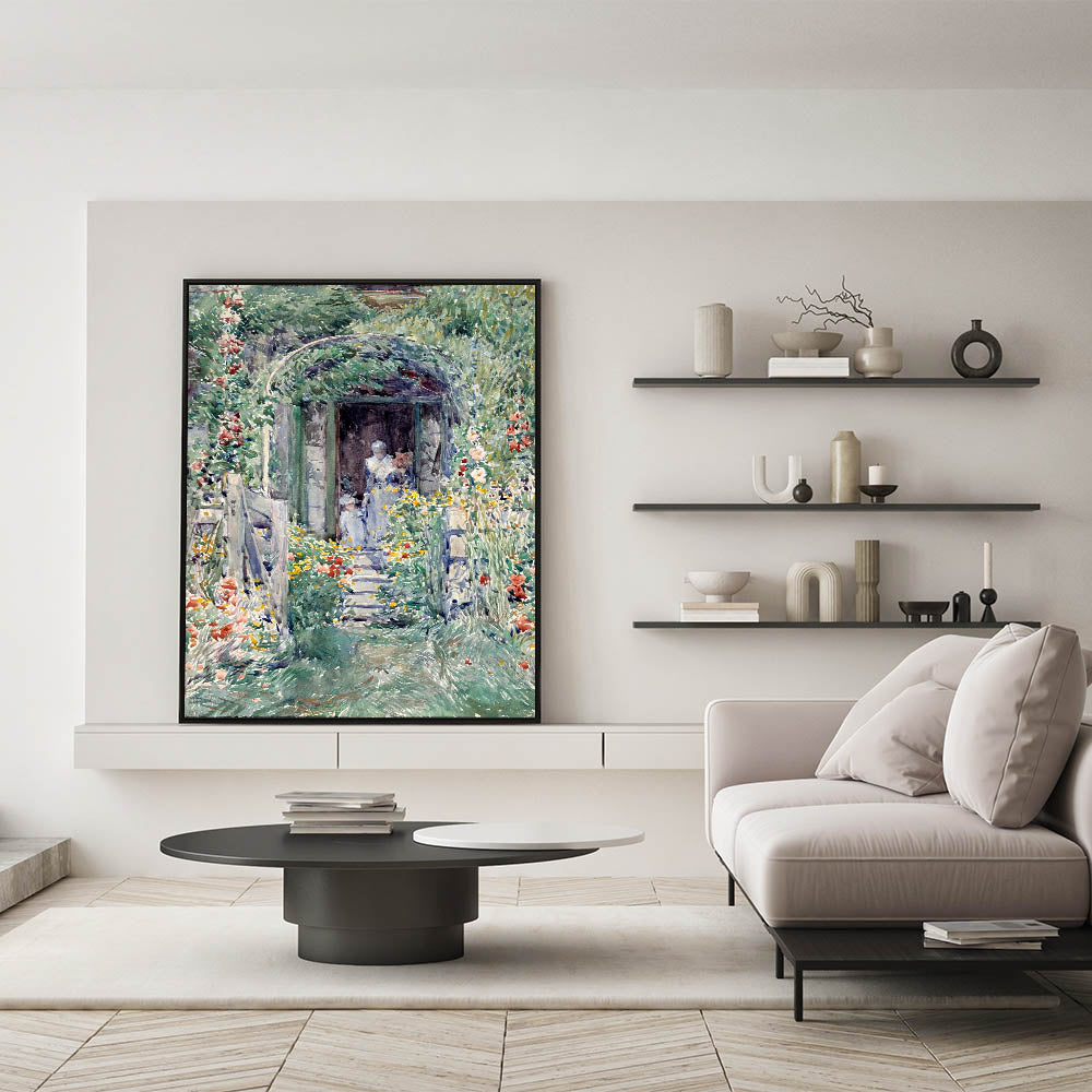 Celebrate the beauty of nature with this Impressionist garden wall art, "The Garden in Its Glory" by Frederick Childe Hassam. This masterpiece showcases a vivid floral landscape, brimming with colorful blooms and a serene pathway leading to a quaint doorway. The delicate brushstrokes and soft, vibrant hues bring this Impressionist artwork to life, embodying the tranquility of a lush garden in full bloom.