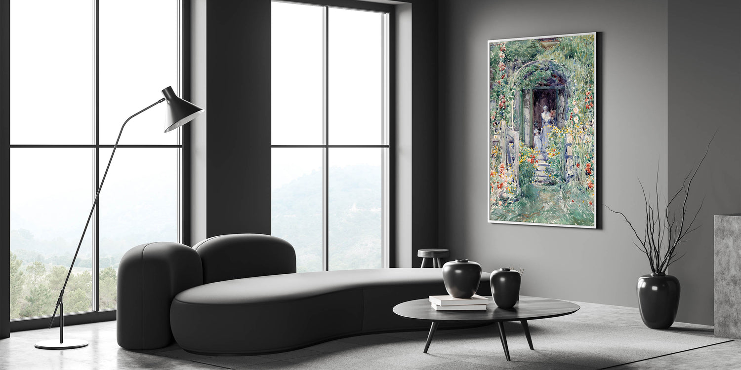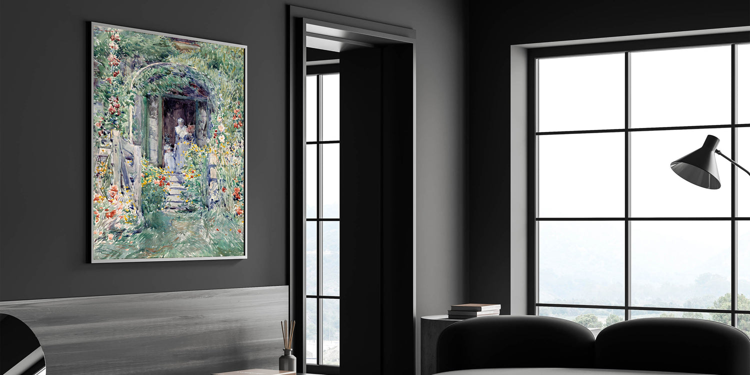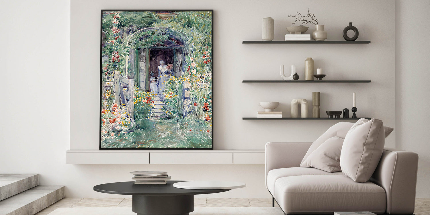 Celebrate the beauty of nature with this Impressionist garden wall art, "The Garden in Its Glory" by Frederick Childe Hassam. This masterpiece showcases a vivid floral landscape, brimming with colorful blooms and a serene pathway leading to a quaint doorway. The delicate brushstrokes and soft, vibrant hues bring this Impressionist artwork to life, embodying the tranquility of a lush garden in full bloom.