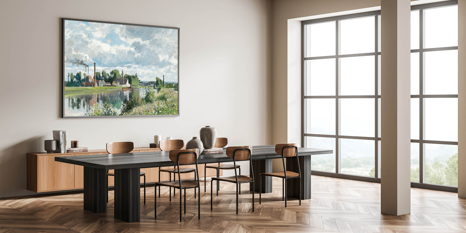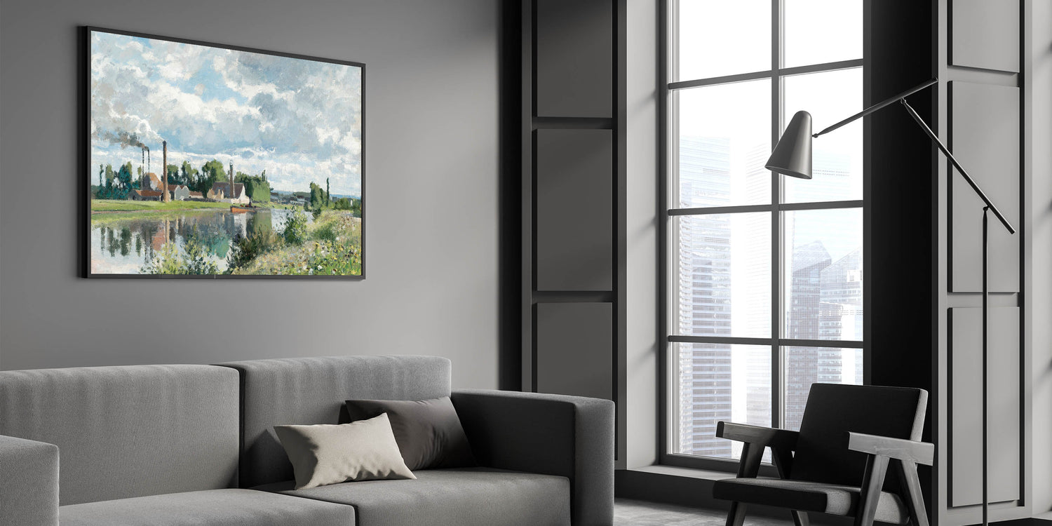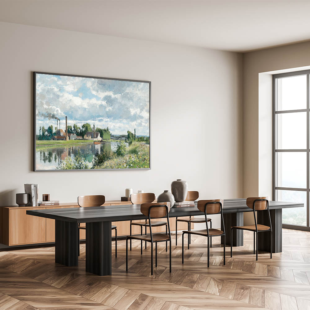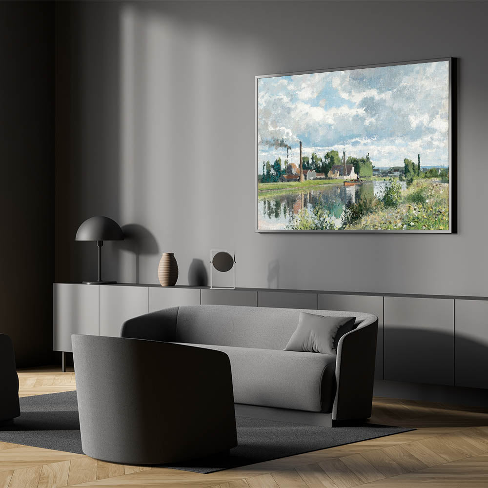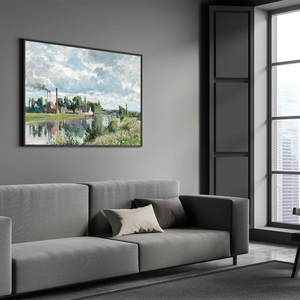 Elevate your home décor with Camille Pissarro’s "The River Oise near Pontoise," a remarkable Impressionist painting from 1873. This serene landscape captures the natural beauty of the French countryside, with its lush greenery, reflective river waters, and dramatic sky. Pissarro’s skillful brushstrokes and vibrant palette bring this tranquil scene to life, making it a timeless addition to any space.