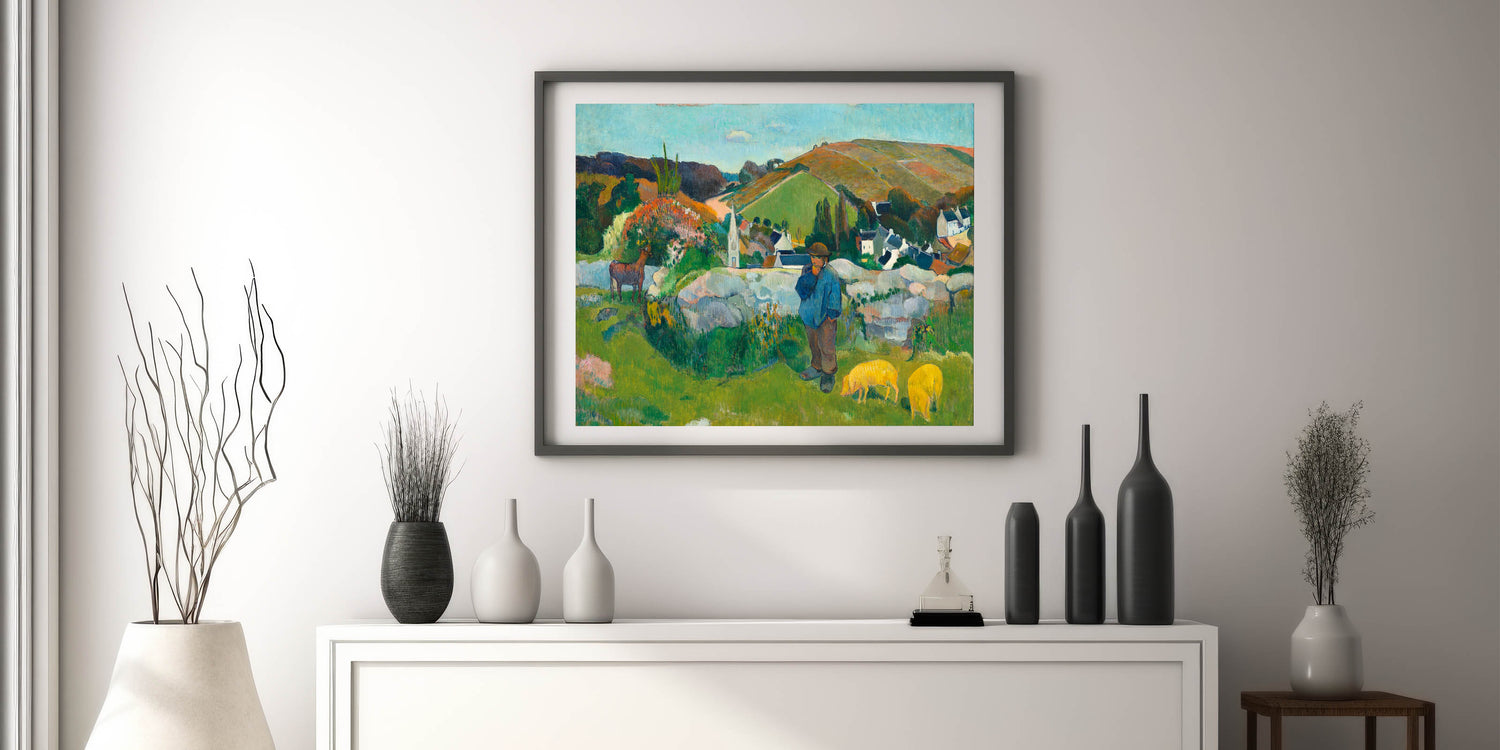 Transform your space with Paul Gauguin’s "The Swineherd," a masterful Impressionist painting created in 1888. This vibrant artwork captures a pastoral scene in Brittany, featuring a contemplative swineherd amidst lush greenery, rolling hills, and vibrant village life. Gauguin’s bold colors and fluid forms evoke a sense of simplicity and harmony with nature, making this piece a timeless addition to any collection.