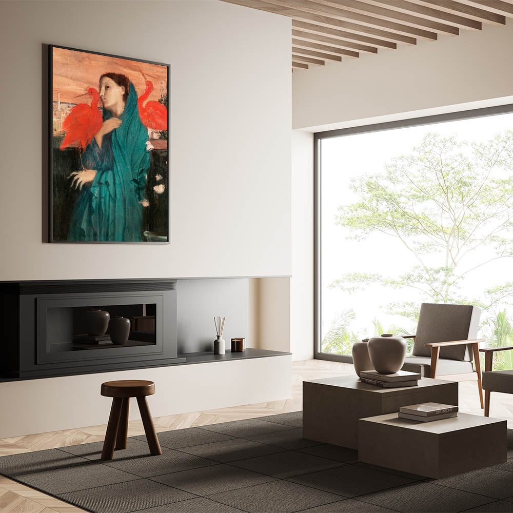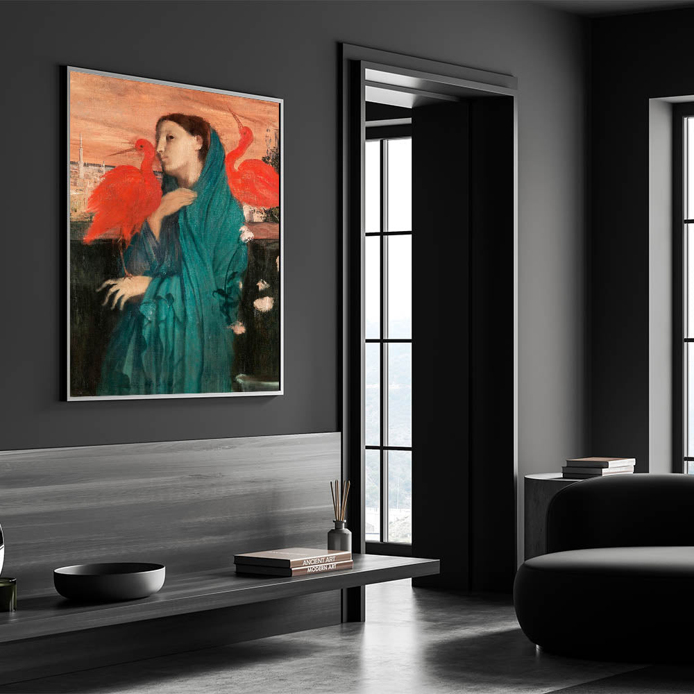 Transform your space with Edgar Degas’s stunning “Young Woman with Ibis” (ca. 1860–1862). This intriguing piece combines portraiture with vibrant symbolism, featuring a serene young woman draped in flowing teal fabric, accompanied by striking red ibis birds. The contrasting colors and delicate brushstrokes showcase Degas’s unique blend of Impressionist and classical techniques, creating a powerful and emotive composition.