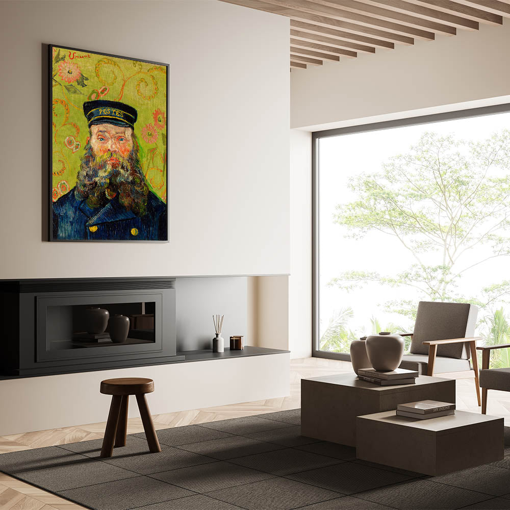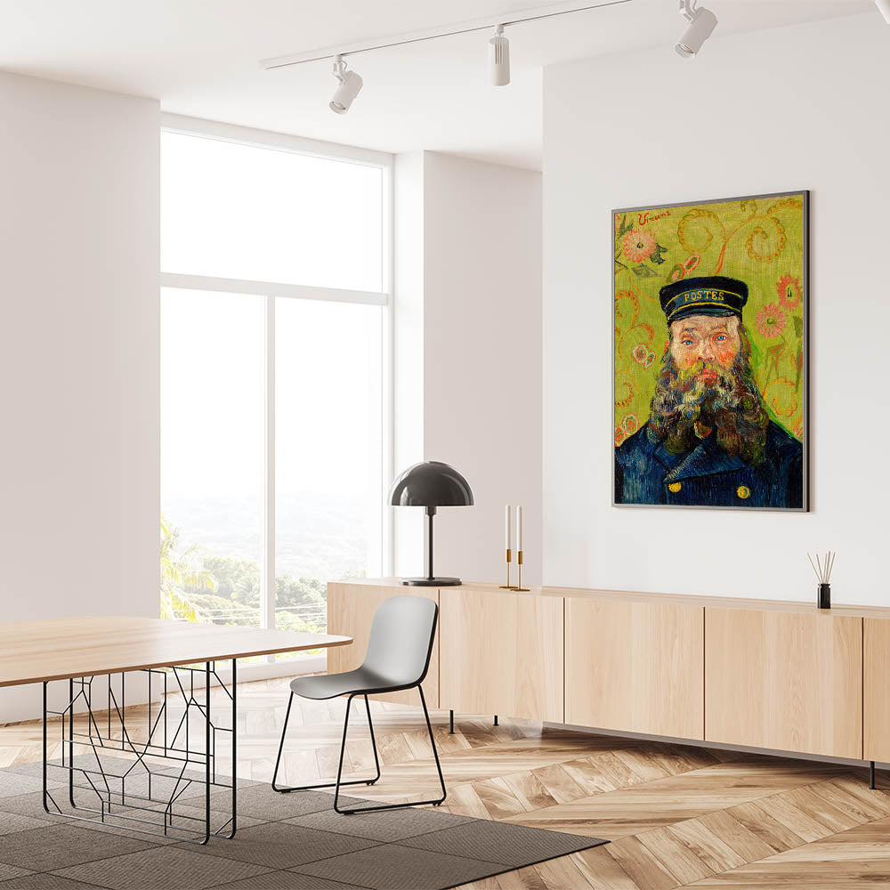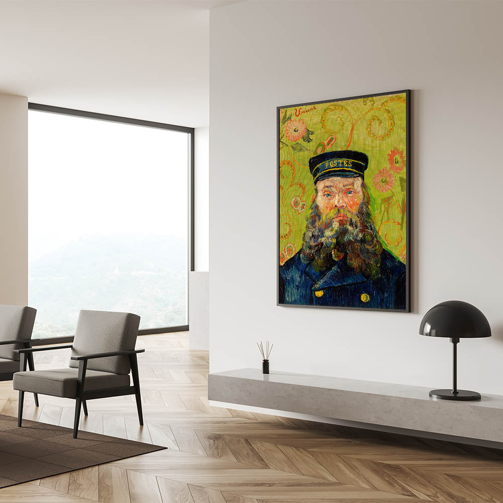 Celebrate the brilliance of Impressionist portraiture with Vincent van Gogh's "The Postman (Joseph Roulin)" (1888). This iconic artwork features Joseph Roulin, a close friend of Van Gogh, depicted with vibrant brushstrokes, a striking green floral background, and vivid, expressive details. The bold use of color and texture creates a captivating composition that is both personal and timeless, making it an ideal addition to your art collection.